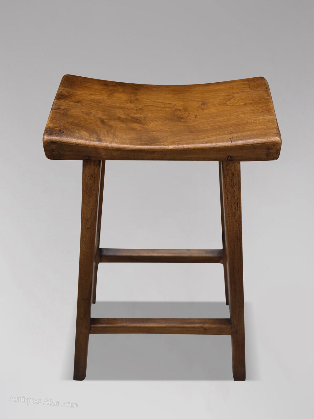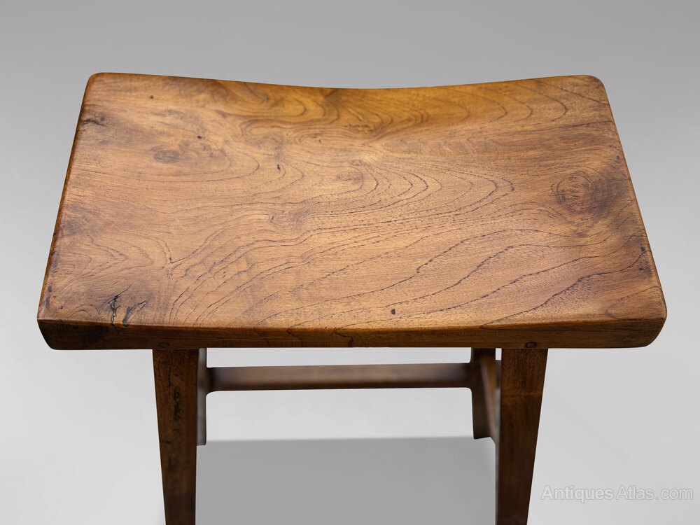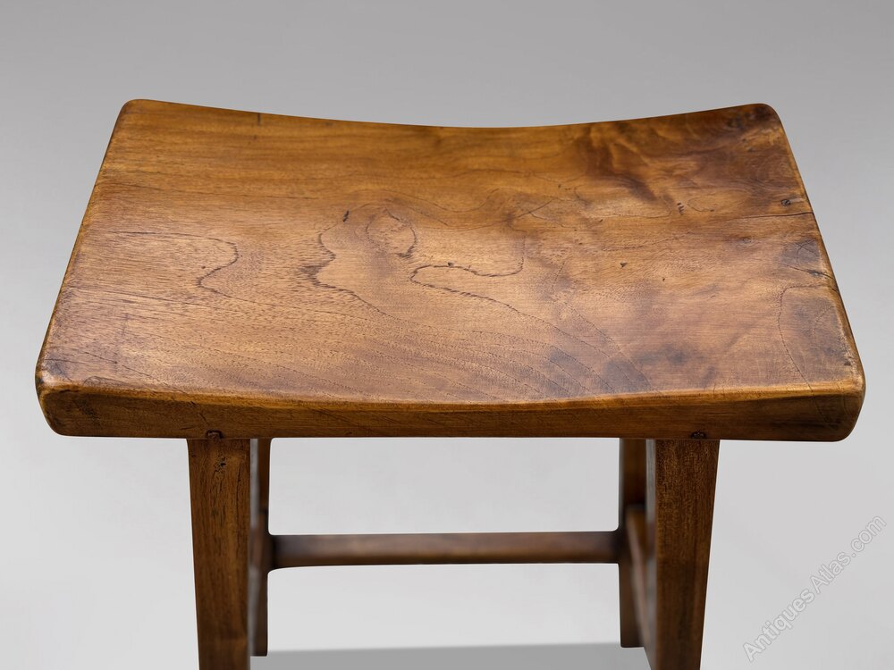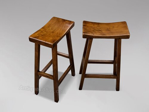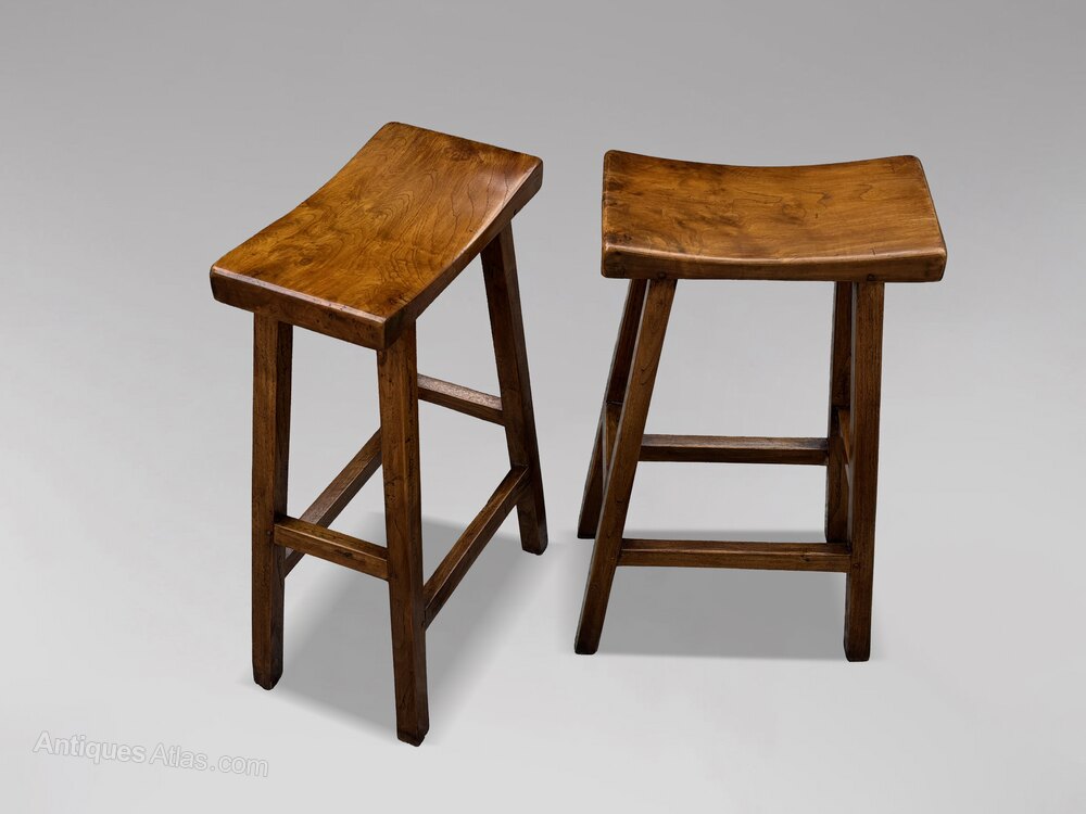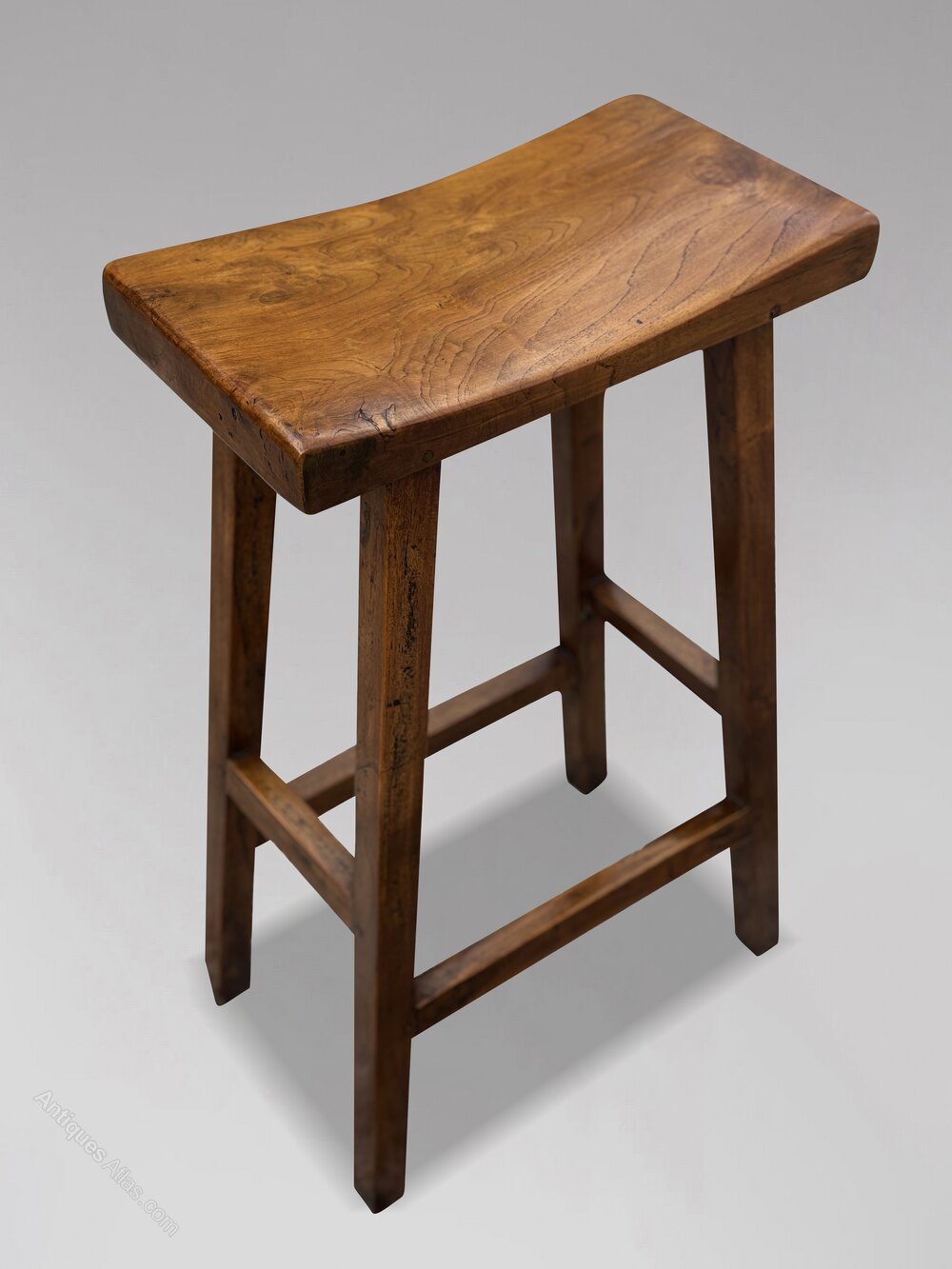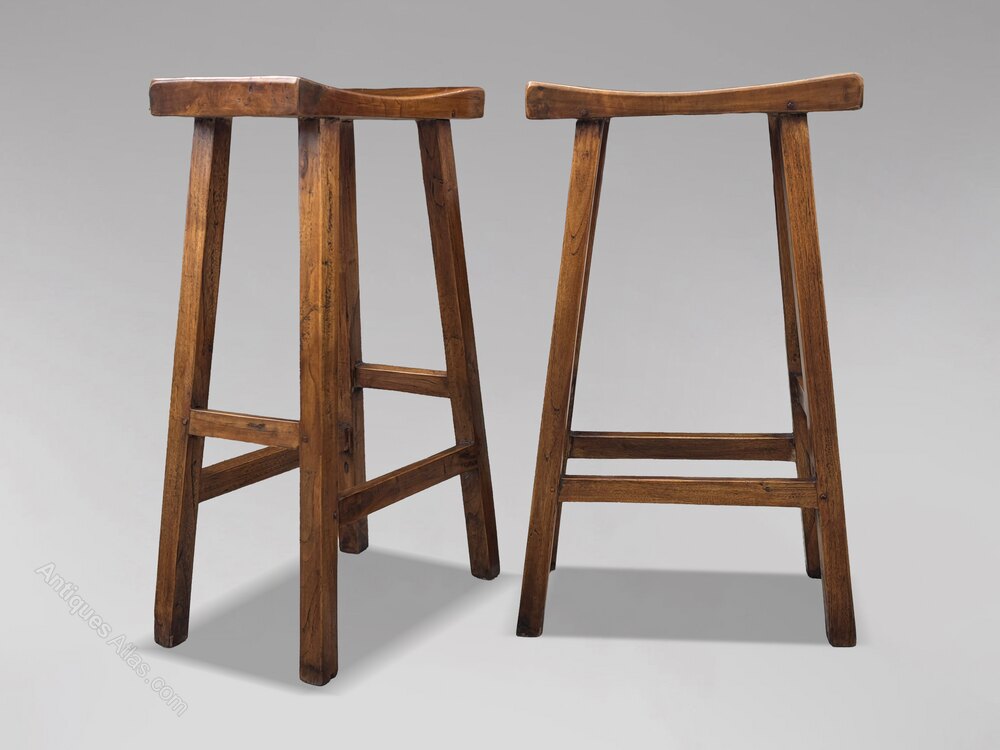 Handsome Pair of Late 19th Century Elm Seated High StoolsThis beautifully matched pair of late 19th century antique tall shaped stools combines rustic charm with practical comfort. A most comfortable elm seat high stool raised on square legs with joining stretchers with peg joinery. Featuring a wonderfully contoured shaped seat, it offers both style and support. Made from solid wood with a rich patina, these stools are a timeless addition to any interior, whether placed at a bar, counter, or high table. In sturdy condition. Circa 1890.
