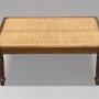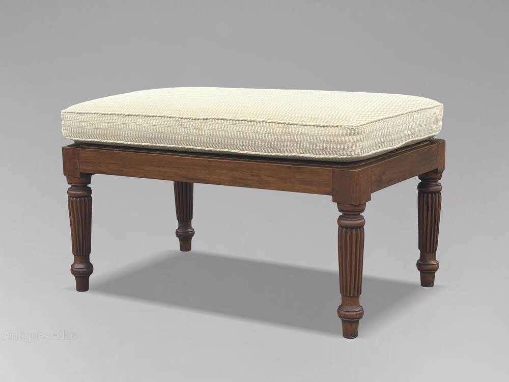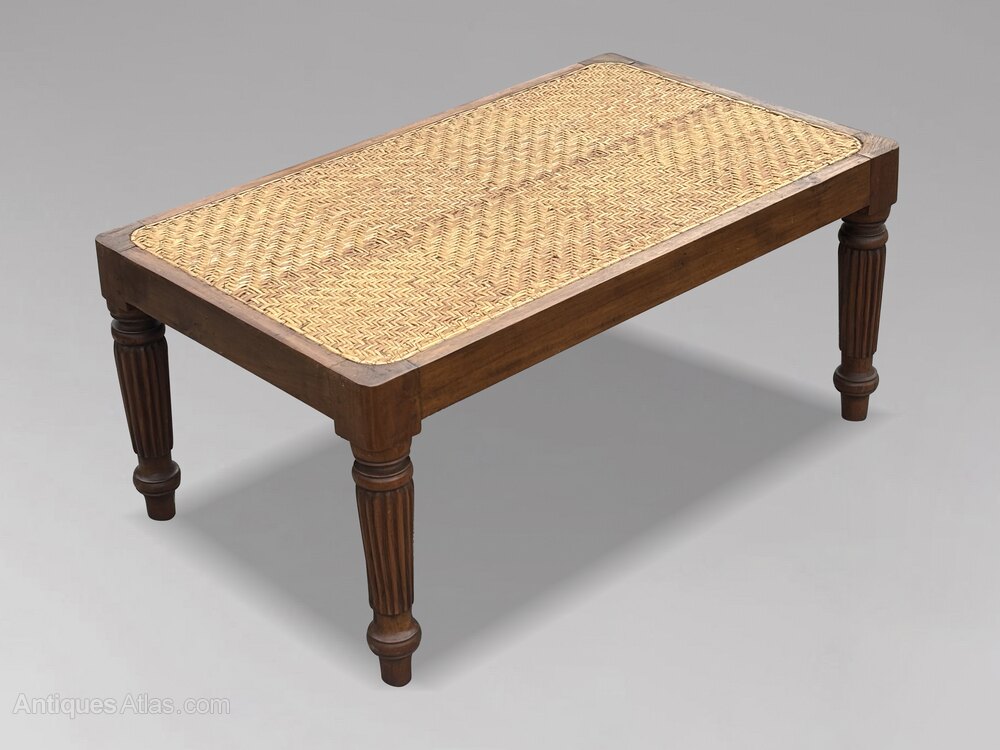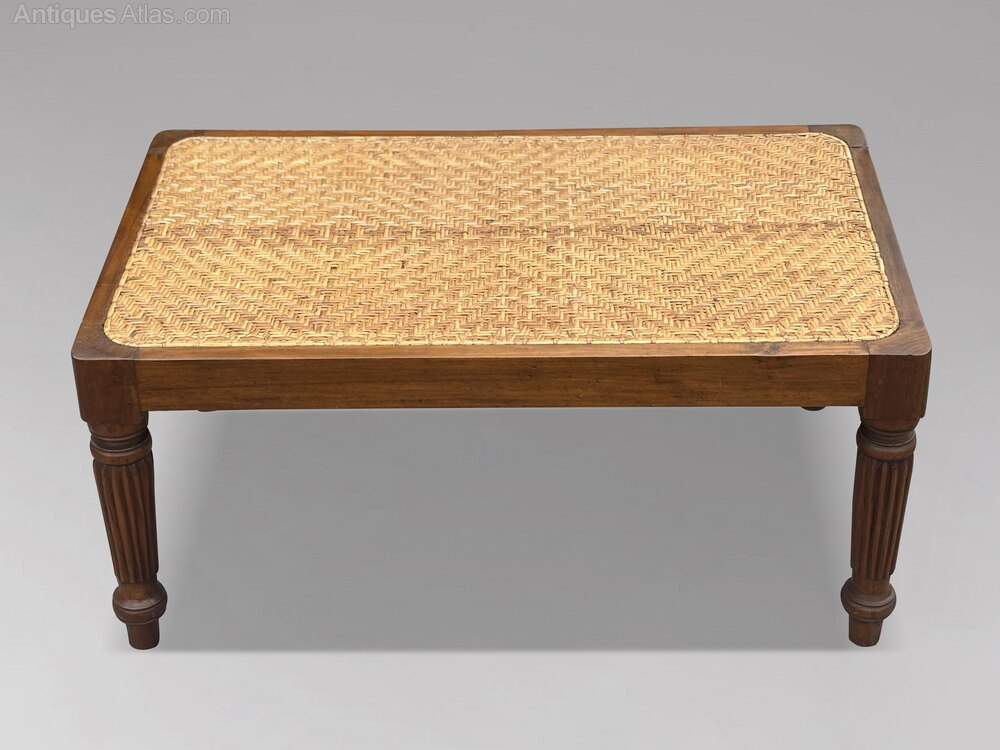 The stool is elevated on tapering, turned, reeded legs, offering both stability and elegance. Its versatile design allows it to be used not only as a stool or luggage stand but also as a unique coffee table, making it a practical addition to any home.