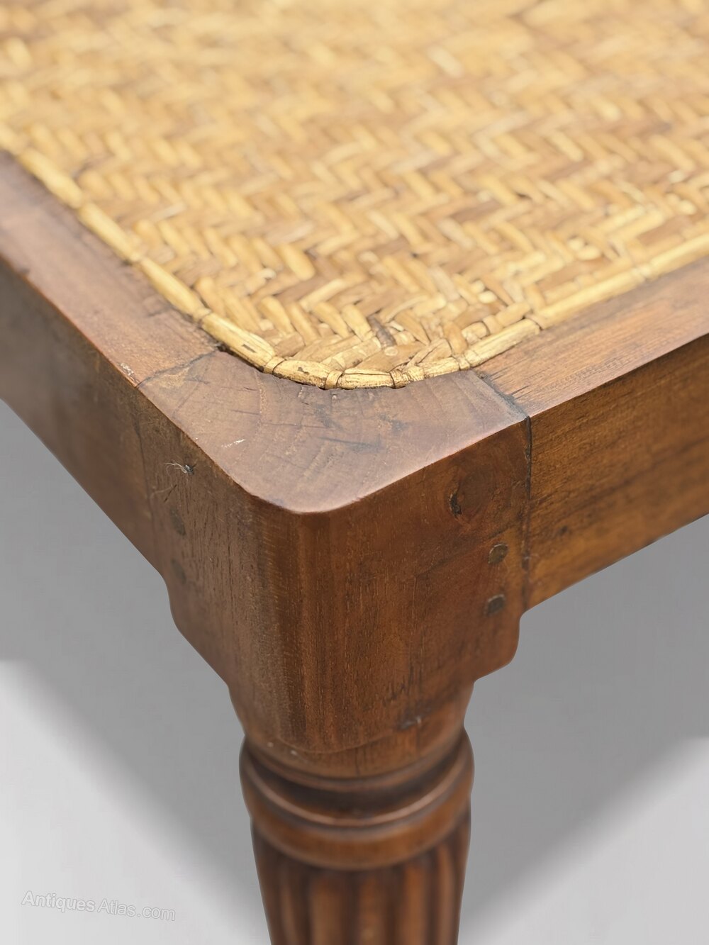 19th Century British Colonial Teak and Woven Rattan StoolA charming late 19th-century teak and woven rattan stool or luggage stand that effortlessly combines style and functionality. This well-proportioned piece features a rectangular teak frame with traditional peg joinery, showcasing the craftsmanship of the era. The original woven rattan top is in excellent condition, with no damage, and is complemented by a large, loose upholstered cushion for added comfort.