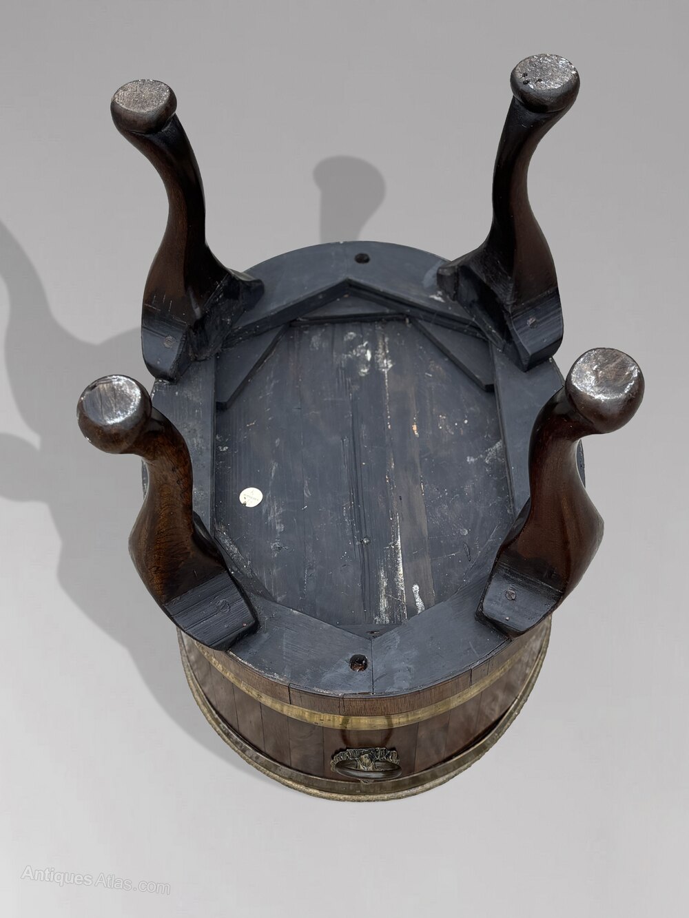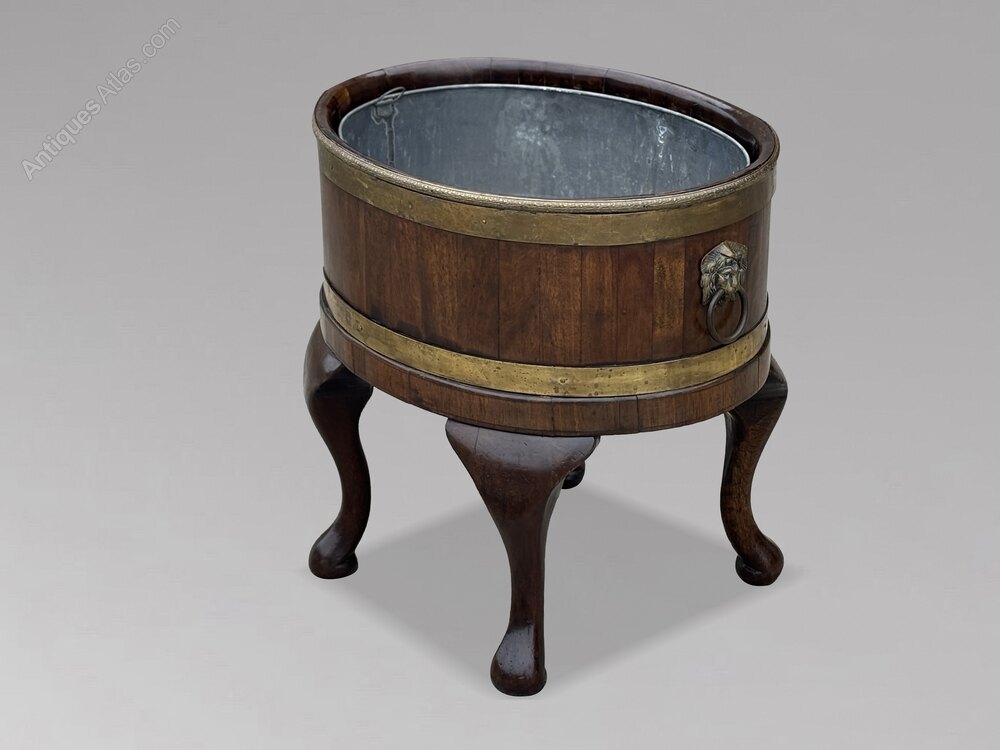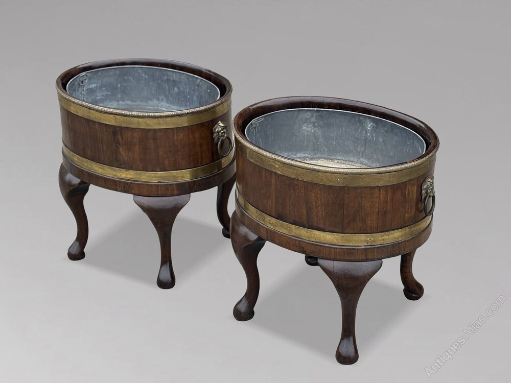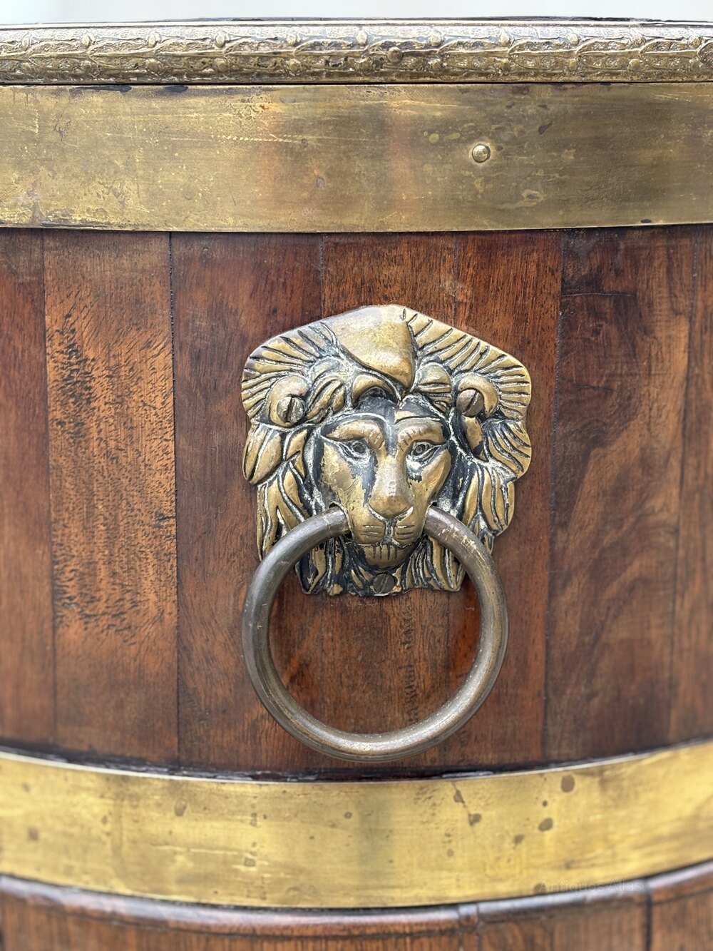 A Rare Pair of Georgian Mahogany Oval Brass-Bound Wine Coolers with Original Liners & Lion-Head Ring Handles C.1760A superb and rare pair of Georgian mahogany wine coolers, exquisitely crafted and retaining their original full-depth lead liners. Each oval cooler features refined brass banding, lion mask ring handles, and graceful cabriole legs - all hallmarks of Georgian craftsmanship at its most accomplished. The deep, lustrous mahogany, enriched by its decorative brass trim, radiates a warmth and refinement that only age and skilled workmanship can produce.The main, solid mahogany body of these cellarettes, or wine coolers, has a decorative brass trim to the top, defining the top, and directly below this there is a deep brass banding. On opposite sides 2 cast brass lifting handles in the form of oval lion mask rings, adorn the main mahogany body. A further deep brass banding is placed above the apron which rests upon elegantly curved cabriole legs terminating with slightly turned under feet. The presence of both original liners, coupled with the fact that they remain a matched pair, elevates their rarity and desirability among discerning collectors.