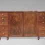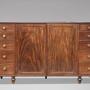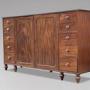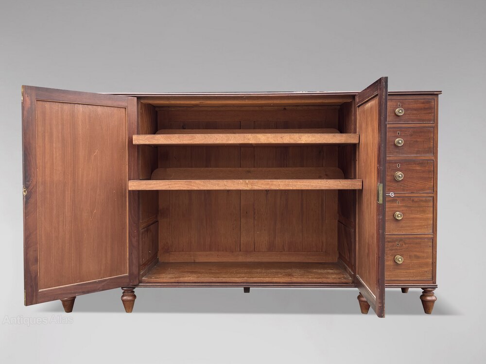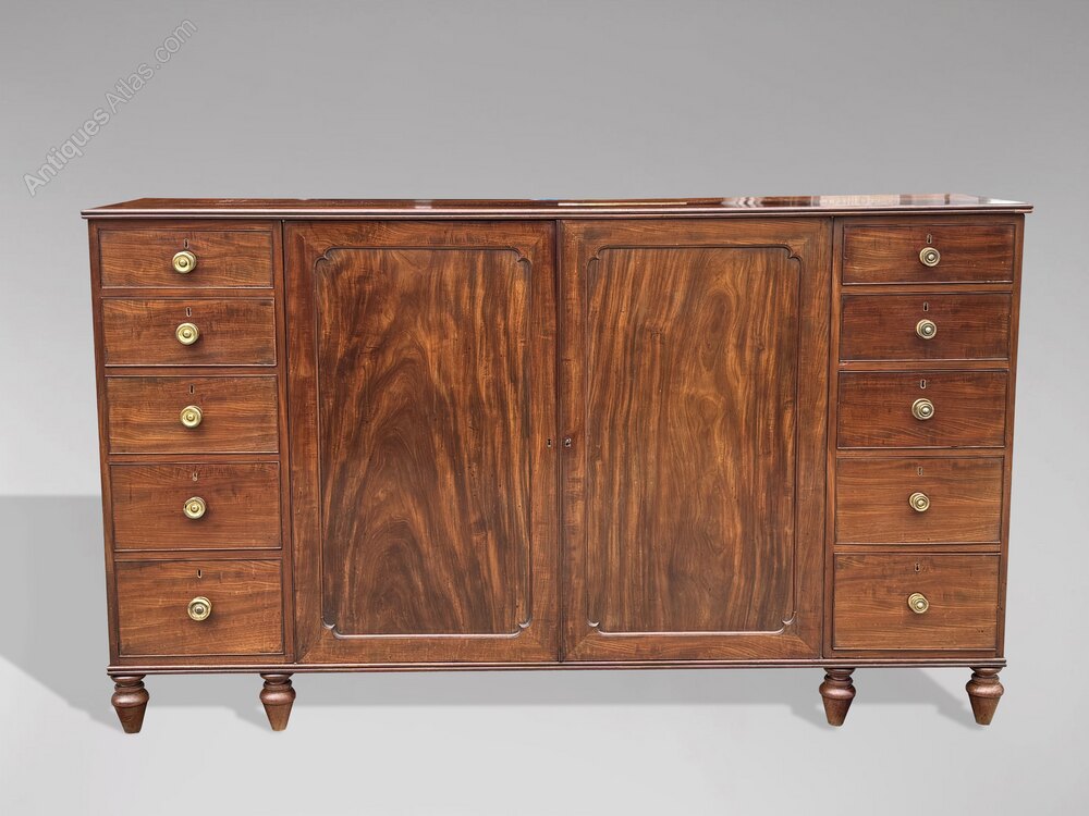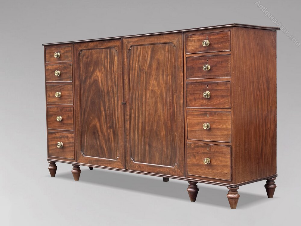 Stunning Quality 18th-century George III Period Mahogany Gentleman's Low Press CupboardA substantial, handsome piece of useful furniture. A George III period mahogany Gentleman's low press attributed to Gillows. The rectangular moulded top above a pair of flame mahogany panelled centre doors with beading enclosing two tray shelves, the sides each with a bank of five graduated mahogany lined drawers with original turned brass handles, on turned feet. The construction and overall appearance is very much in the Gillows style. Beautiful patina. Sturdy, strong and ready to use! English Country House look! Over time, the mahogany has developed a wonderful patina that highlights the depth and warmth of the timber, a hallmark of pieces from this era. Traditionally, linen presses were designed for storing sheets, clothing, and textiles, and examples from the 18th century are highly prized for their superior cabinet work, classic design, and exquisite use of materials. This low linen press is not only a testament to exceptional craftsmanship but also a striking centrepiece for any home that values history and quality. This Georgian mahogany linen press is designed for both beauty and practicality, coming apart in five sections for easy transport and installation.