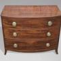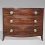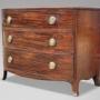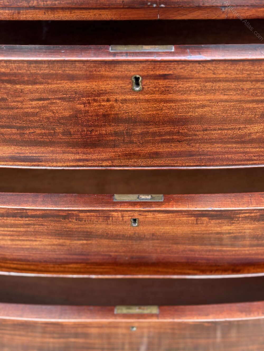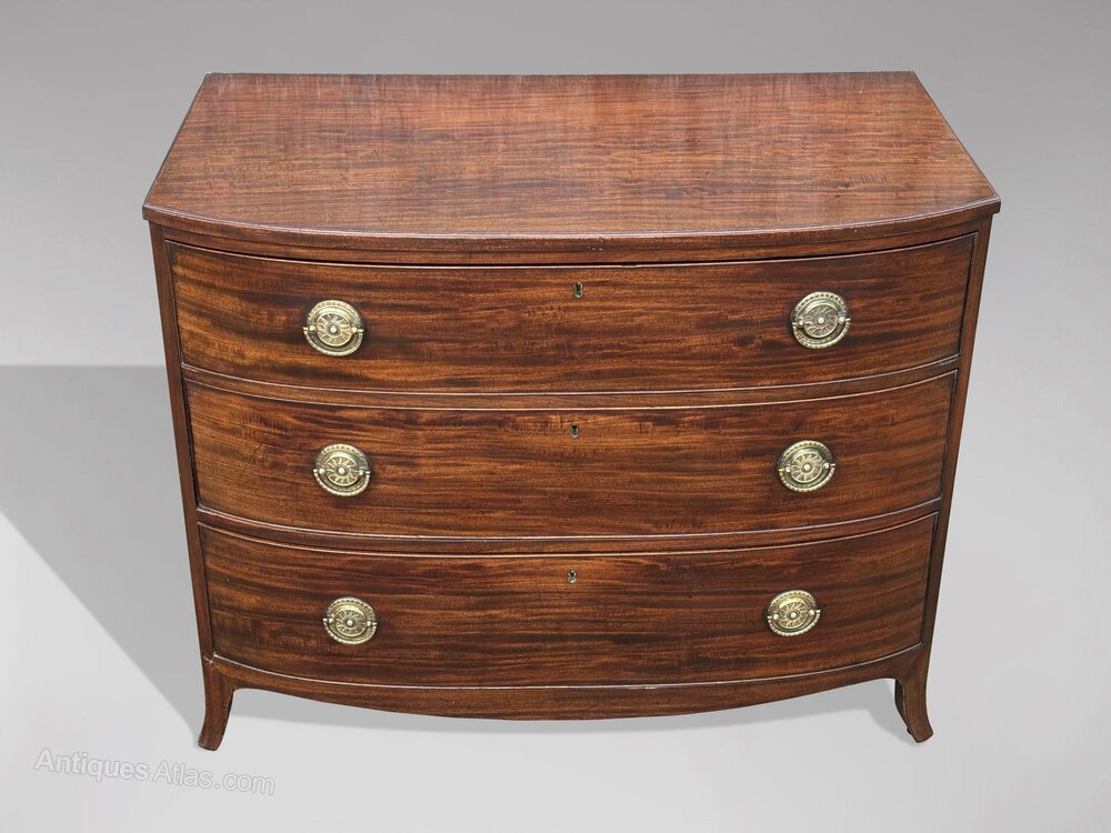 Fine 18th-Century George III Period Mahogany Bow-Fronted Chest of DrawersA fine quality 18th-century George III period bow-fronted chest of drawers, crafted from beautifully figured solid mahogany and dating from circa 1790. The rectangular bow-fronted moulded top sits above three long, graduated, cockbeaded drawers, all oak-lined and fitted with their original brass ring handles. A shaped apron below adds to its elegance, while the piece is supported on splayed bracket feet.