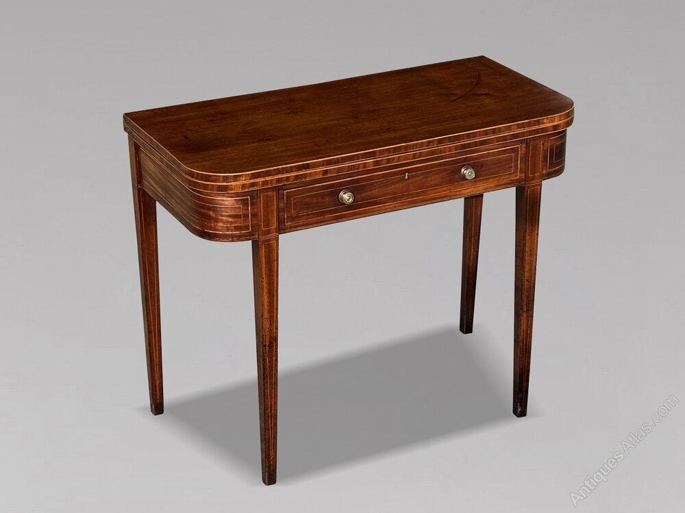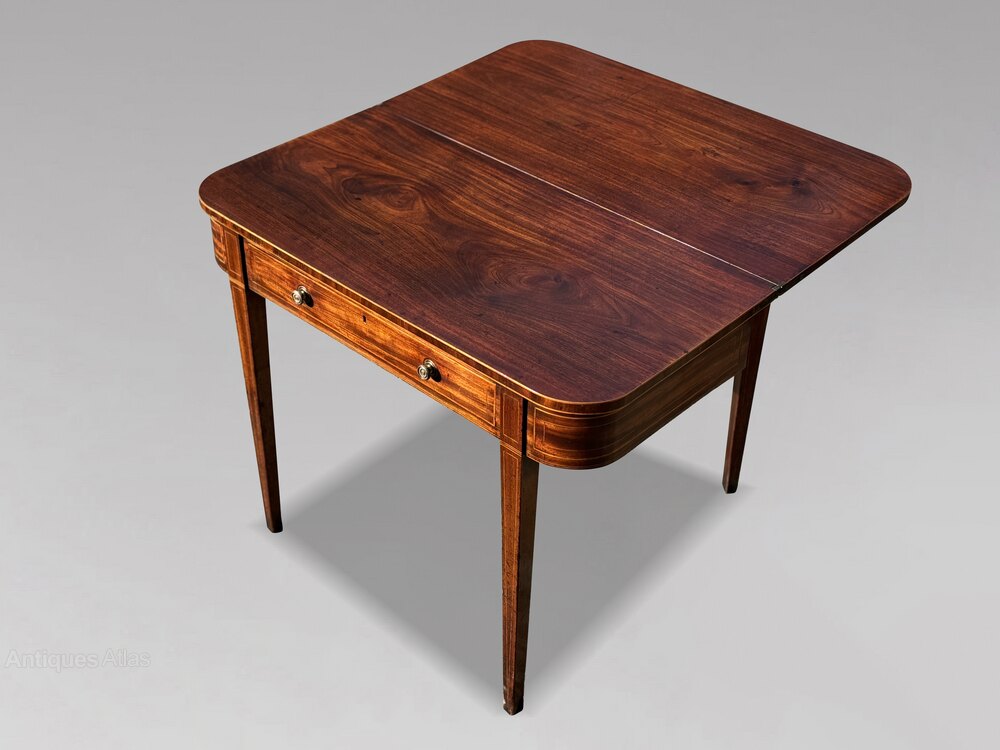 Wonderful Colour Late 18th-Century George III Mahogany & Satinwood String Inlaid Fold-Over Tea TableA superb late 18th-century George III mahogany fold-over tea table, of elegant D-shaped form, finely inlaid throughout with satinwood stringing and banding. The top is crafted from beautifully figured flame mahogany with delicate satinwood inlay, and hinges open to reveal an interior of rich, unfaded mahogany with exposed brass hinges, all in excellent original condition. The frieze incorporates a full-length mahogany drawer, again detailed with satinwood stringing, and lined in oak, a hallmark of quality Georgian cabinetmaking. The table stands on four refined, square tapering legs, all inlaid, with the back legs hinged to swing out and support the top when open.