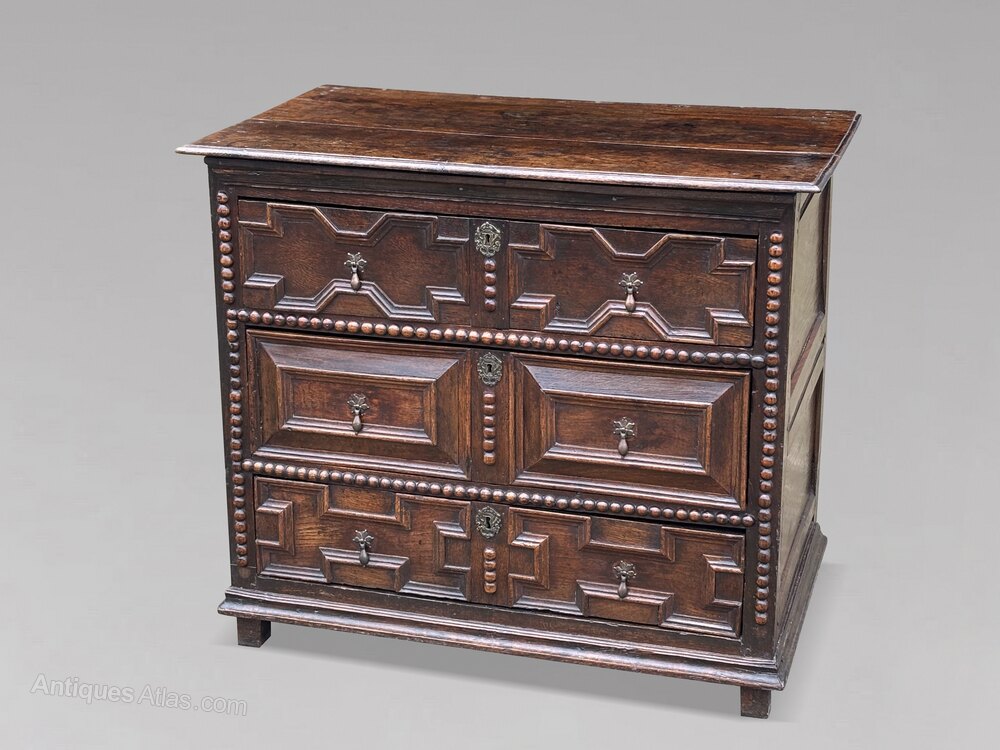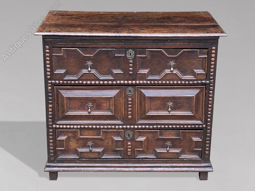 Charming 17th-Century Charles II Jacobean Geometric Chest of Drawers with Superb PatinaA wonderfully characterful late 17th-century Charles II Jacobean oak geometric chest of drawers, boasting exceptional colour, depth and patina.