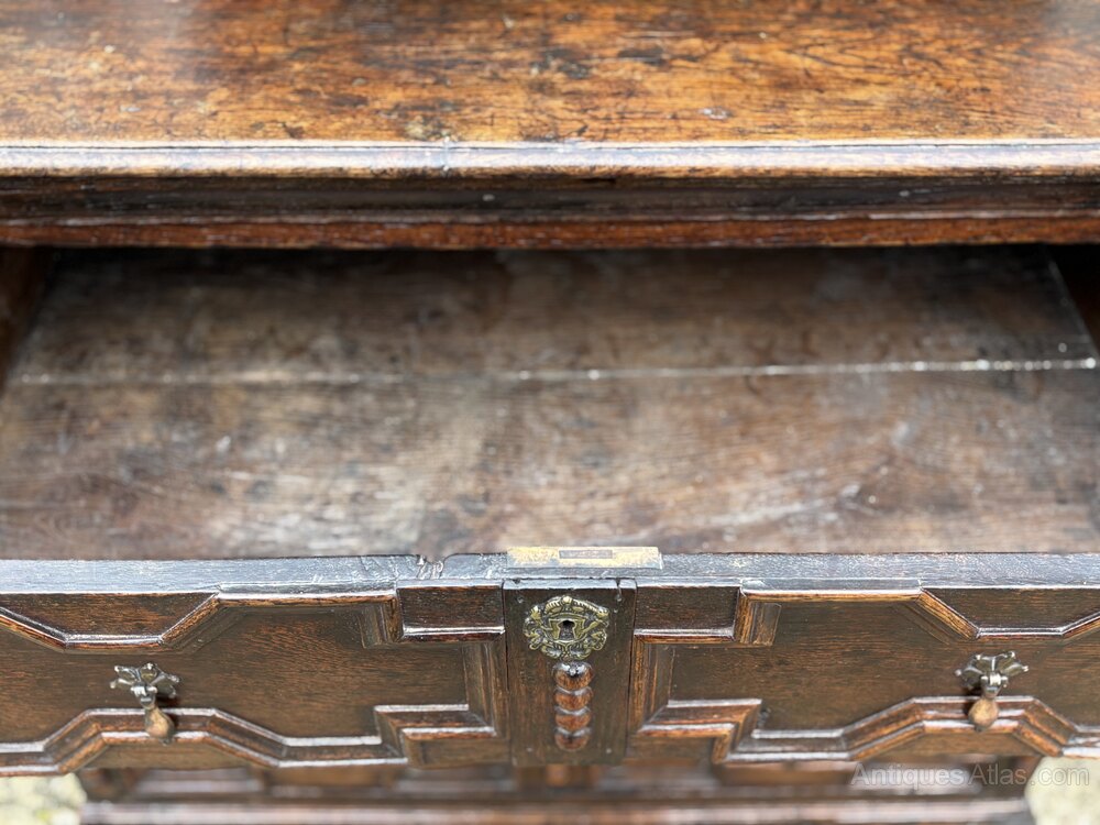 Made in England circa 1680, this is a highly decorative and practical piece of early oak furniture that would sit equally well in a period room or as a striking contrast in a more contemporary interior, a true collector’s item with real presence and charm.