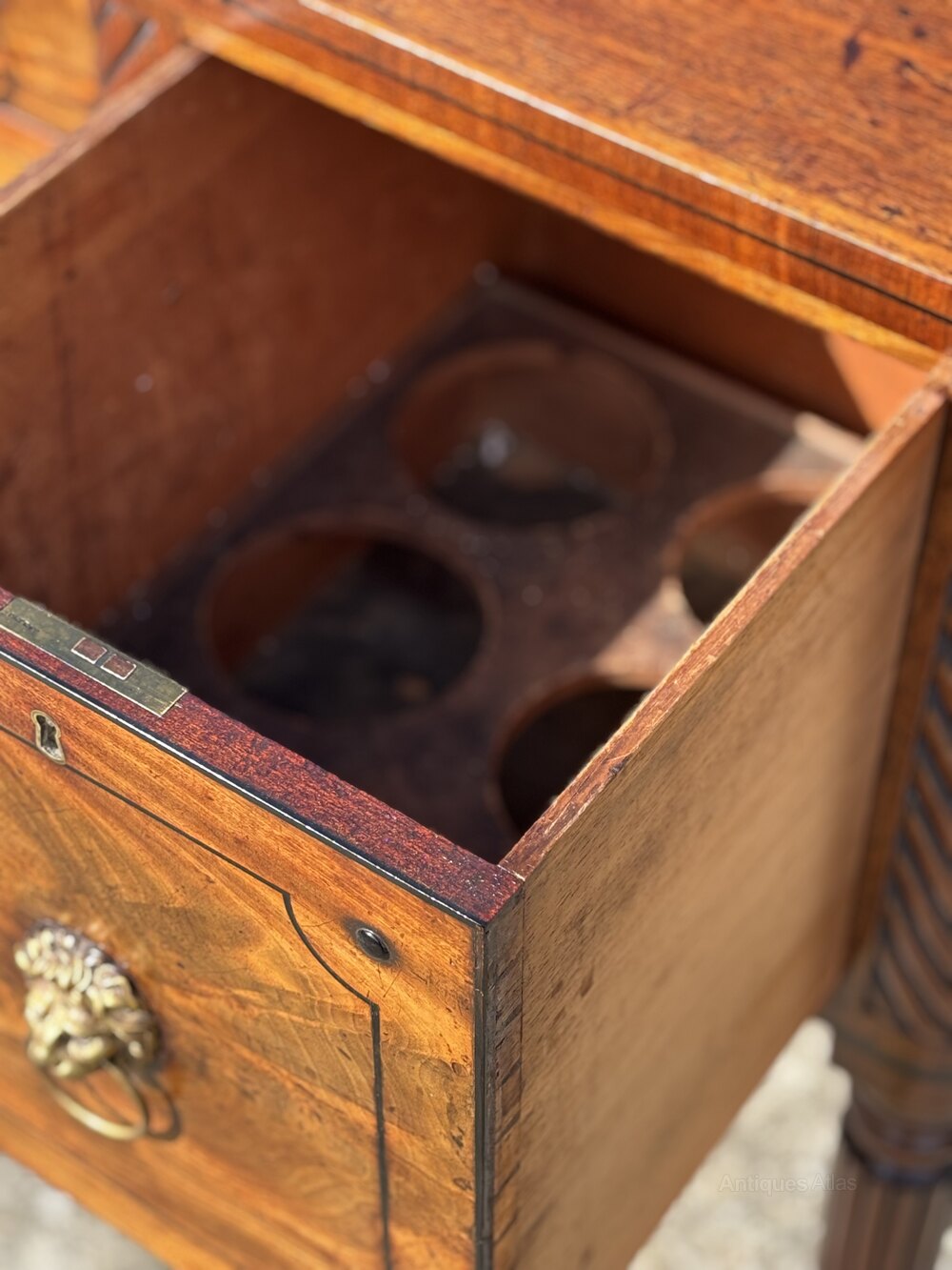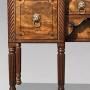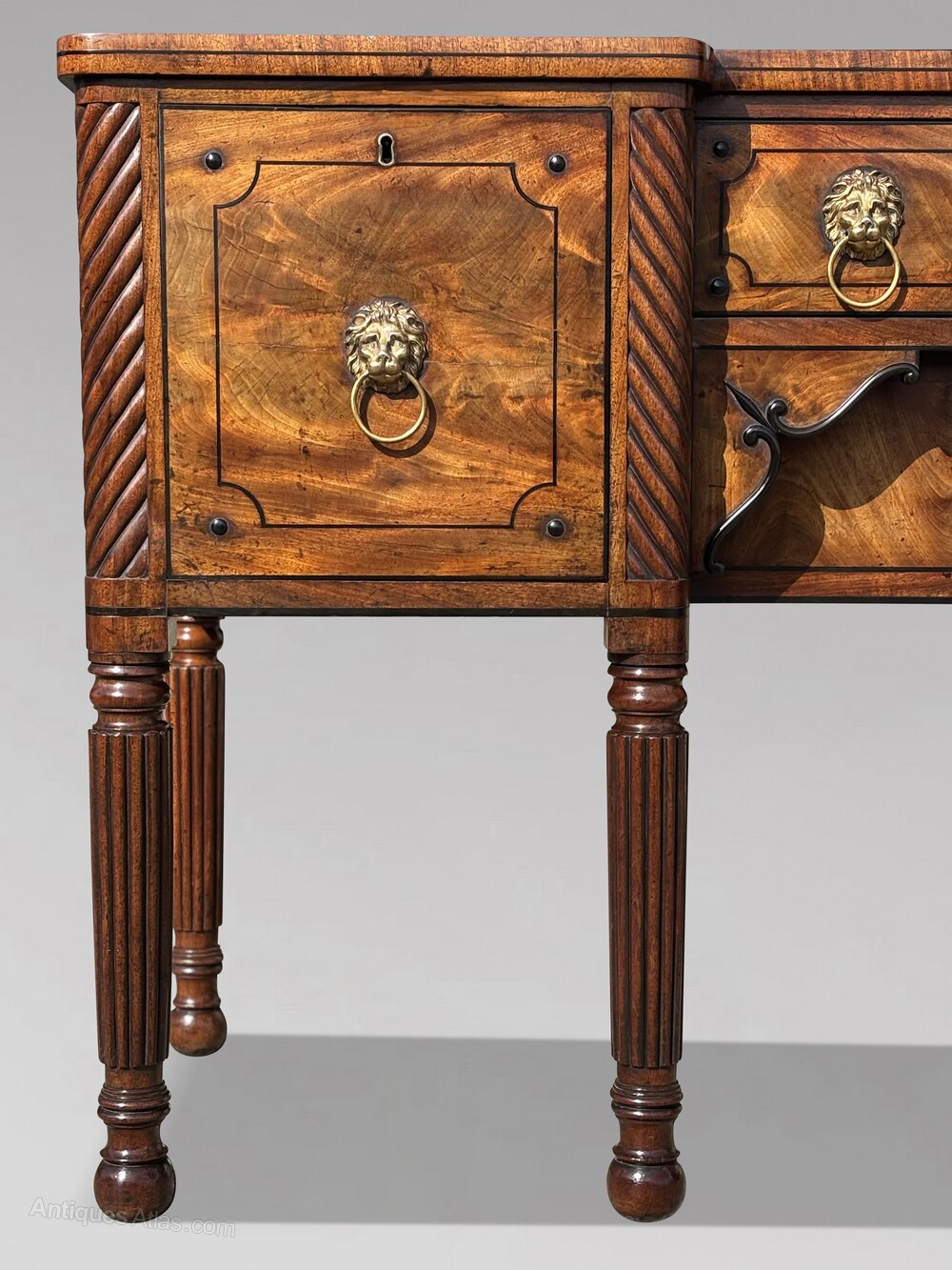 These central drawers are framed by out stepped spiral turned pilasters, which transition into ring turned and reeded supports, terminating in finely turned feet. To the left is a full height cupboard door to the right, a full height fitted cellarette drawer, ideal for bottle storage. These end sections are again flanked by columned legs, giving the piece a balanced and architectural presence. Standing on six elegantly tapered, reeded mahogany legs, this sideboard displays an outstanding depth of colour and a warm, glowing patina that has developed over two centuries. Its generous proportions, refined styling, and superior timber quality strongly suggest it was a special commission.
