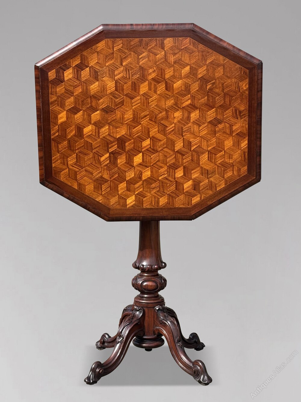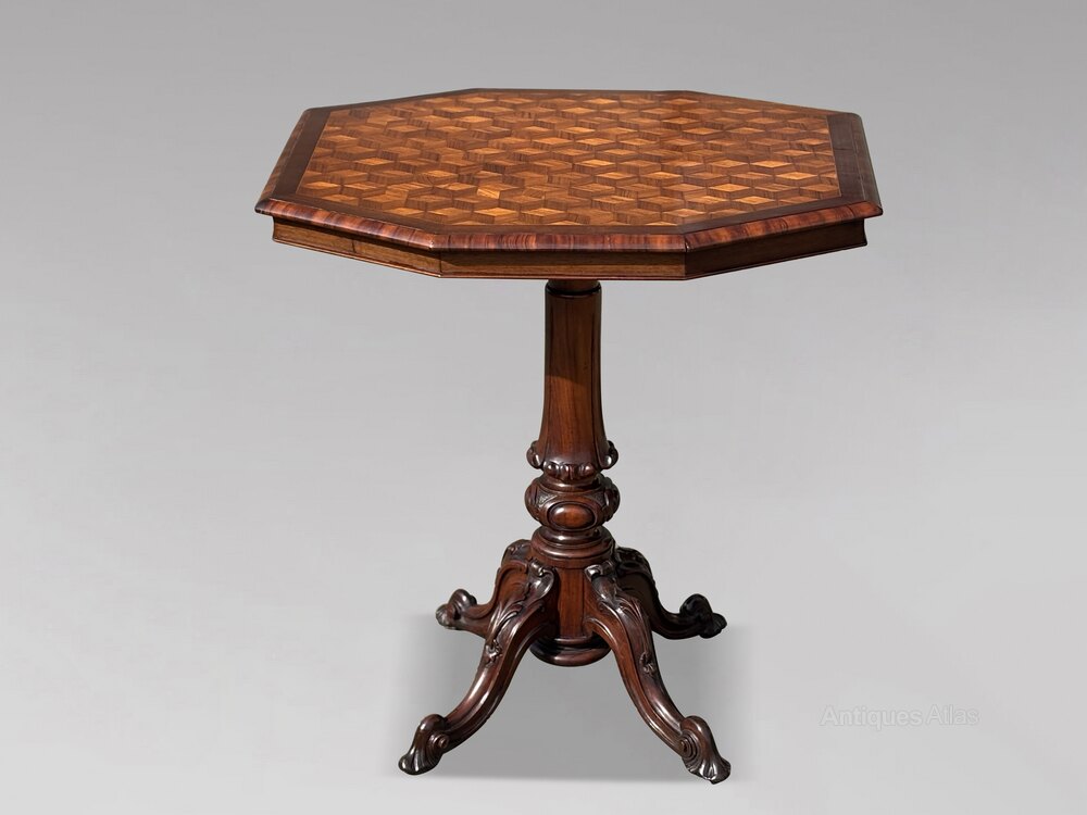 Superb Quality 19th-Century Victorian Period Walnut Parquetry Tilt-Top Occasional TableA magnificent 19th-century Victorian period walnut tilt-top occasional table of superb quality, dating from around 1860. The oblong octagonal top has moulded and banded edges, with a striking parquetry centre inlaid in a contrasting geometric design. The top is raised on a finely turned and carved pedestal with four splayed carved legs, richly decorated with floral relief carving and a central turned finial to the underside. A snap-release tilt mechanism allows the top to be folded upright, making it practical both for use and for display. Exquisitely detailed and presented in immaculate condition, this table retains its entirely original colour and patina, with a deep polish and warm, characterful glow that only well preserved 19th century furniture develops over time. Structurally sound and in excellent original order throughout, it is a piece of clear, top tier Victorian craftsmanship.