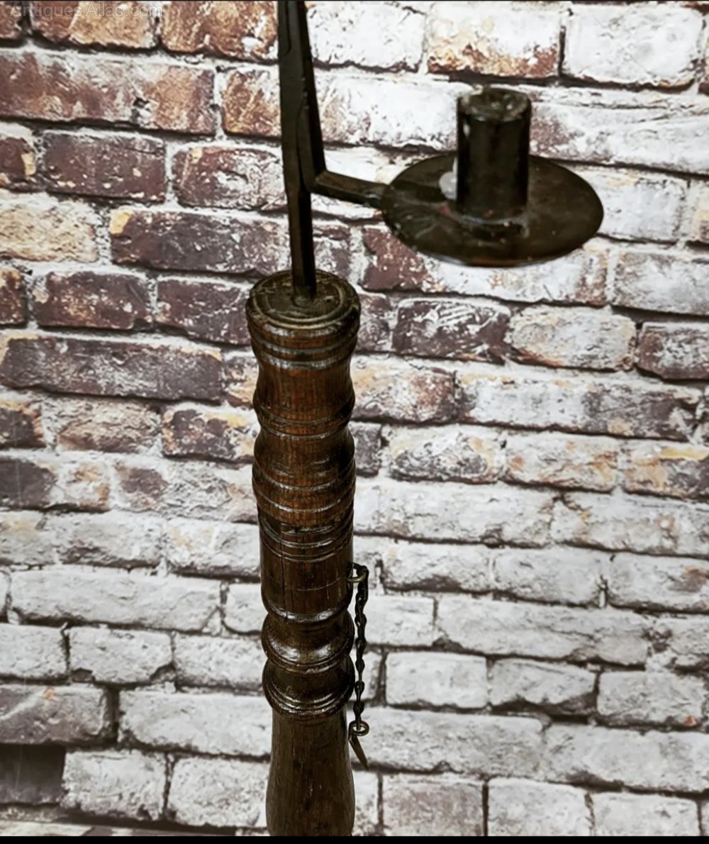 This has to be the rarest floor standing rush light I've seen and owned. In oak with a cruciform base. Turned baluster which adjusted to preferred height.