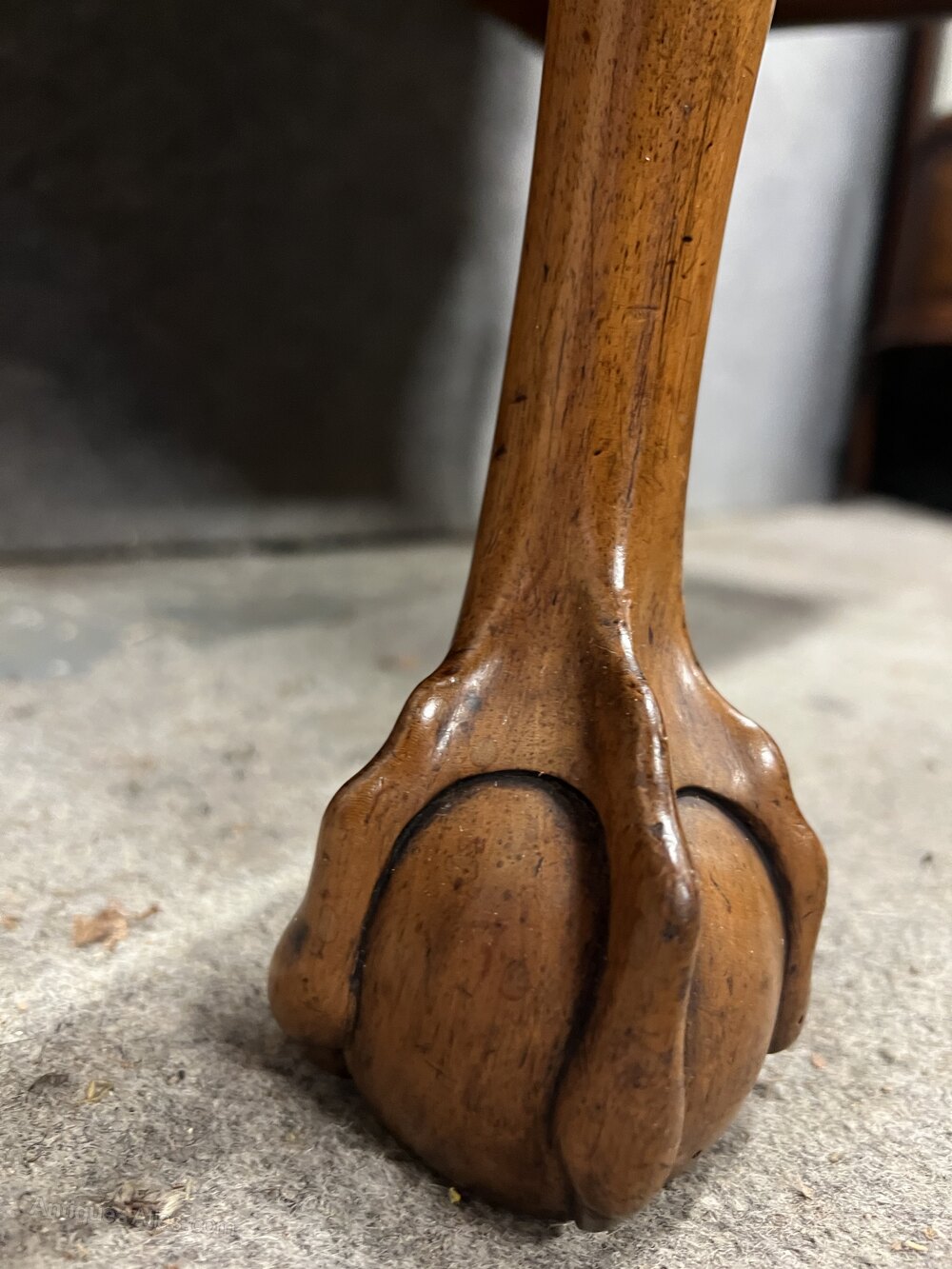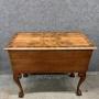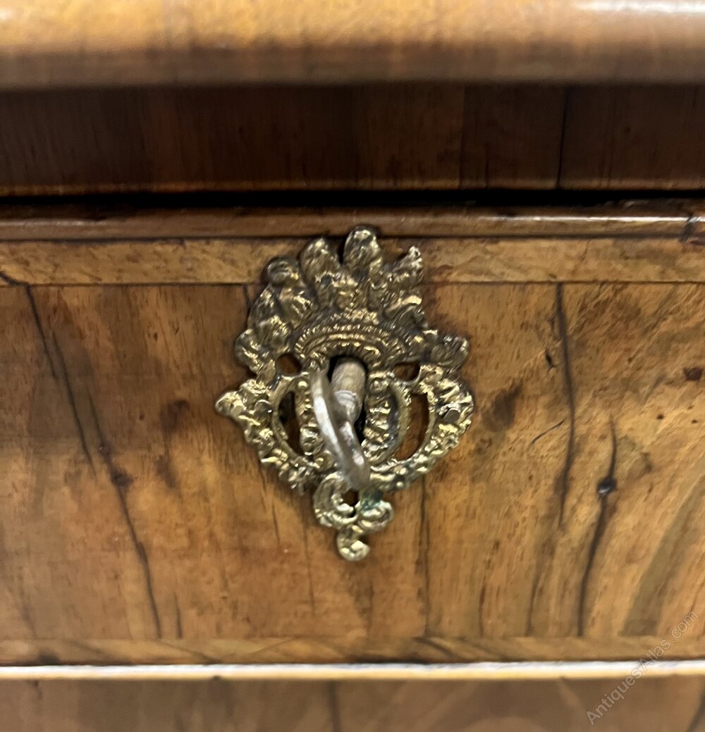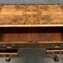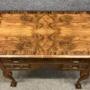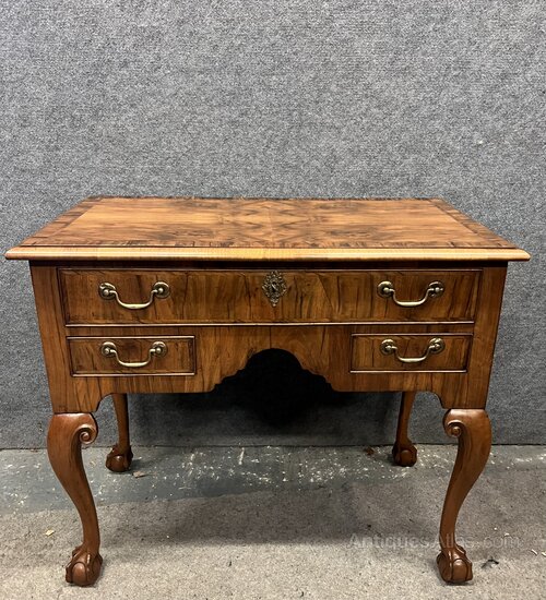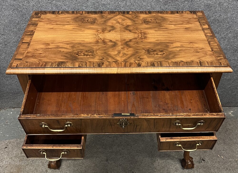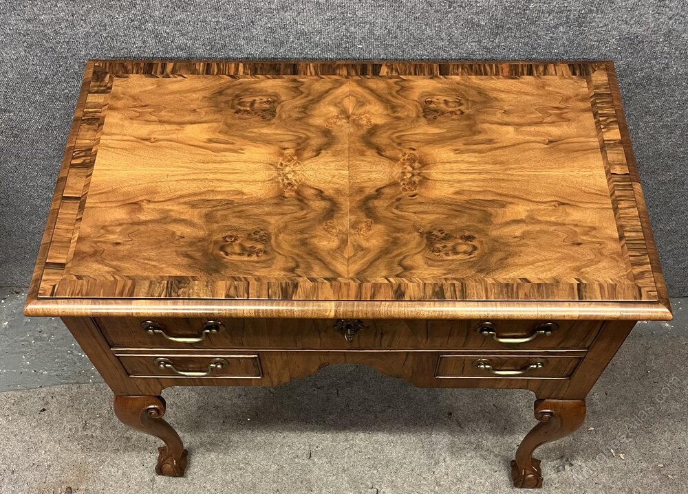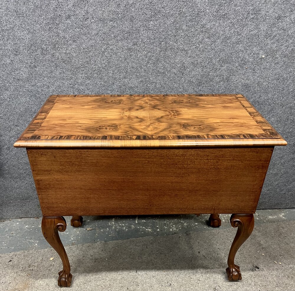 An attractive 18th. Century style walnut low boy or side table. The rectangular shaped top having beautifully book matched quarter veneered top with feather and cross banded inlay with cross grain moulded edge. Below a wide drawer with brass escutcheon and working lock with key. The shaped kneehole flanked by 2 smaller drawers all having cockbeaded edges and brass swan neck handles. The table his supported on well carved legs with ball and claw feet. Dimensions:- Height…27.5’’/ 70cm. Width…32’’/ 81.5cm. Depth…18’’/ 46cm. Delivery by furniture carrier £50.