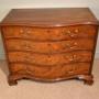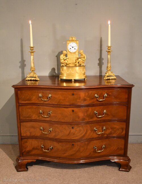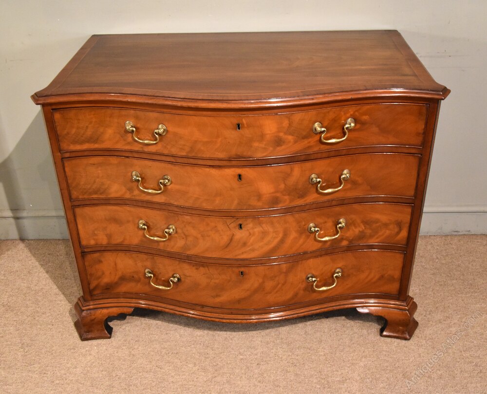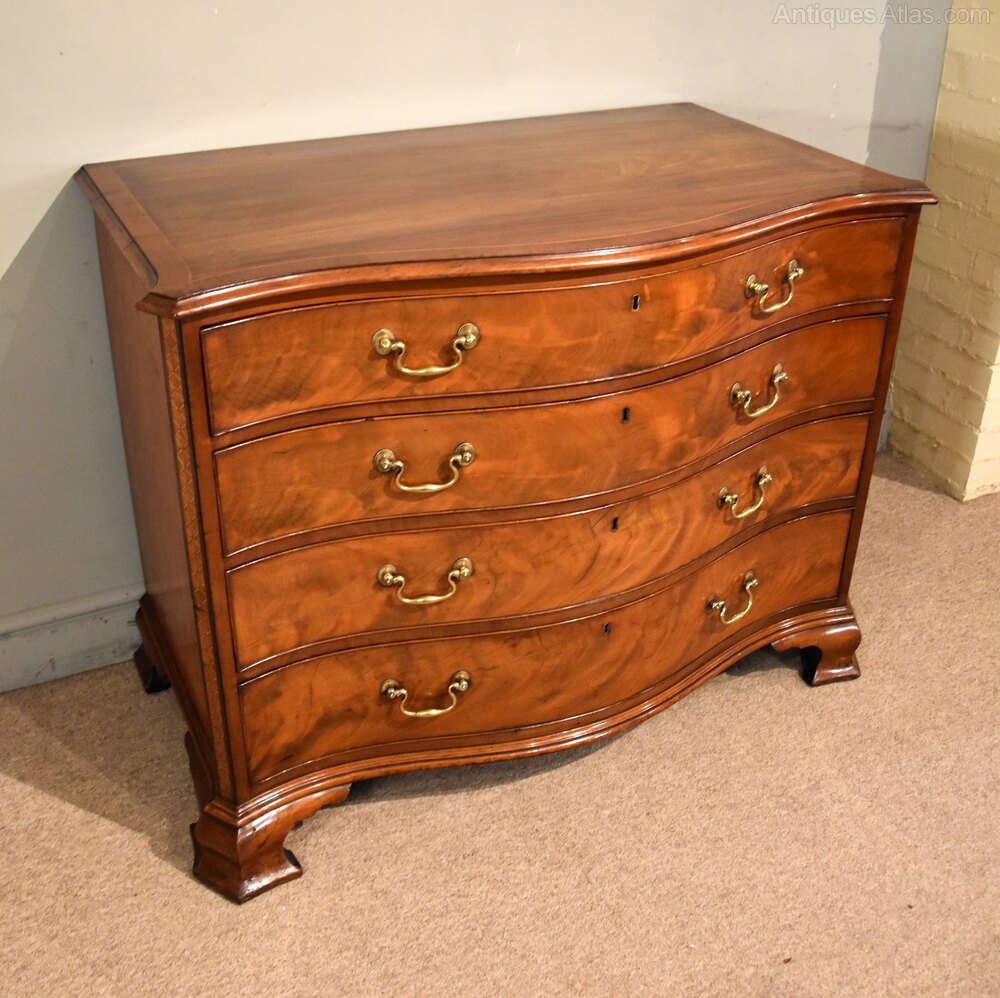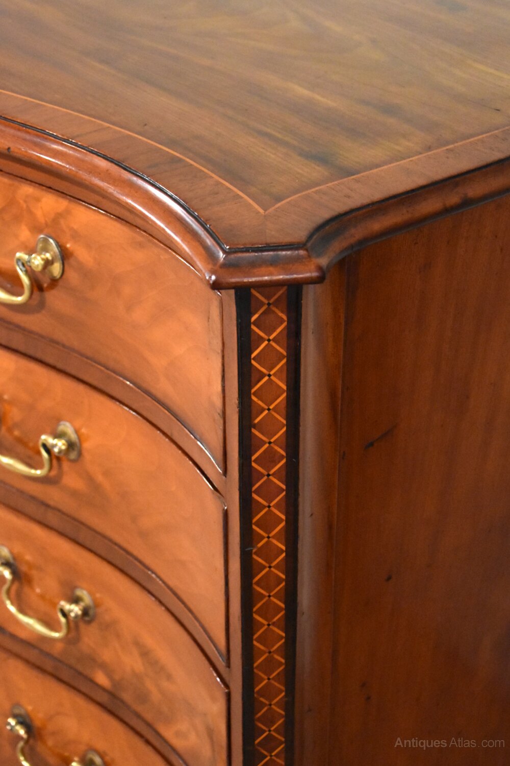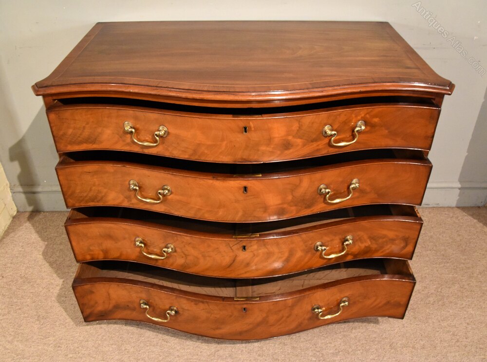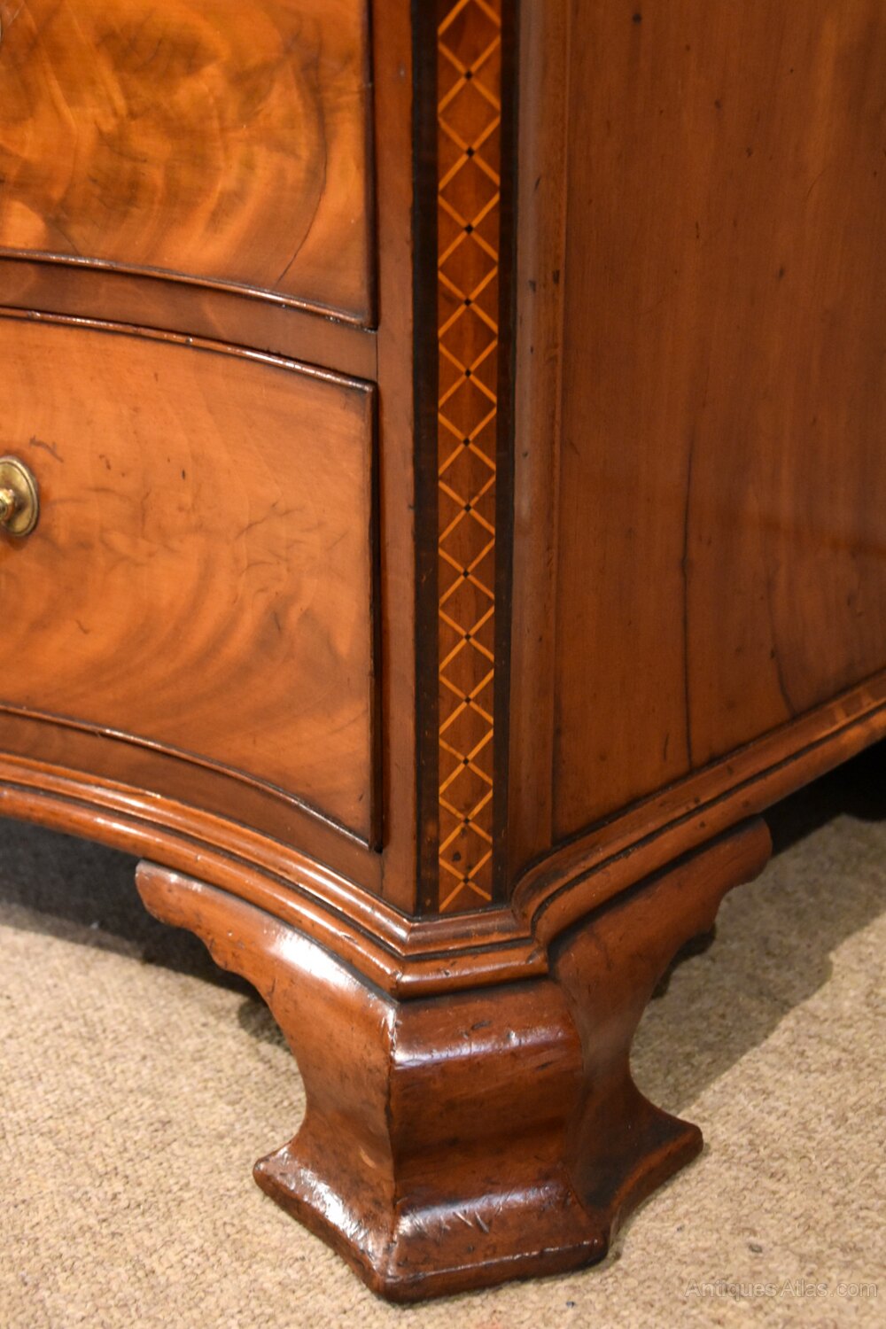 A fine quality mid 18th century mahogany serpentine-fronted chest of drawers commode in the manner of Thomas Chippendale original gilded handles and ogee feet. Cross banded with Criss Cross pattern to the edge
