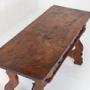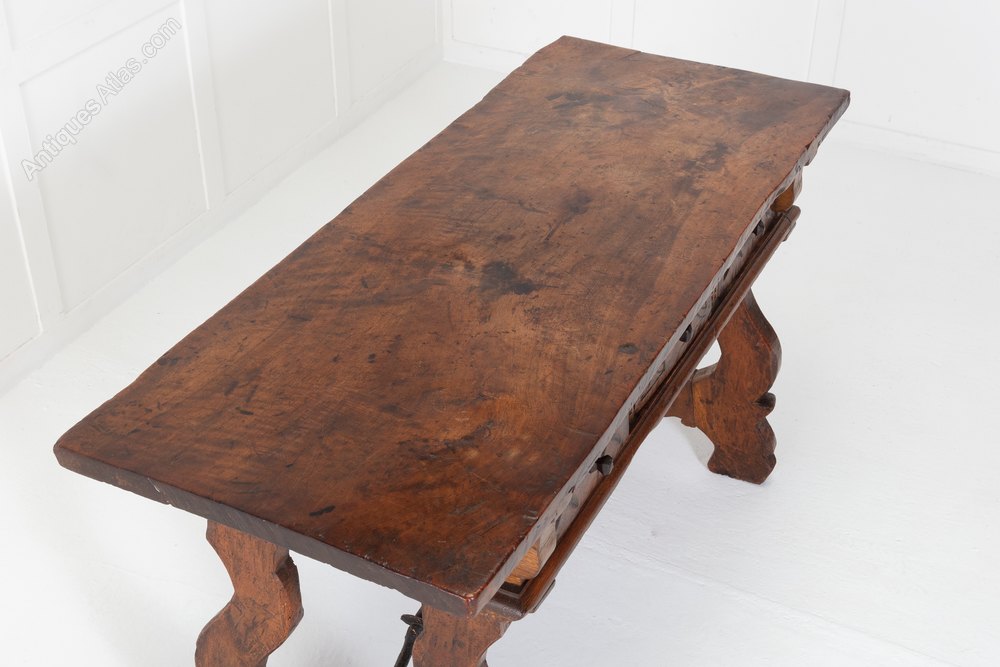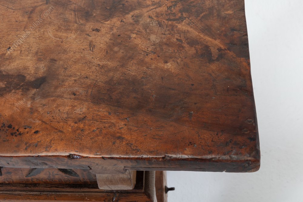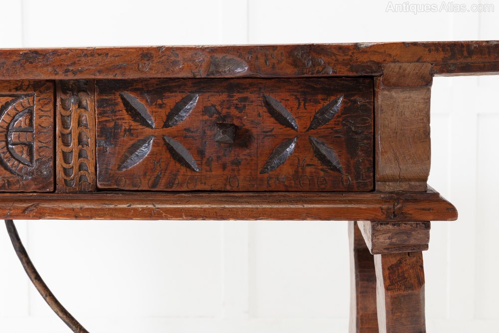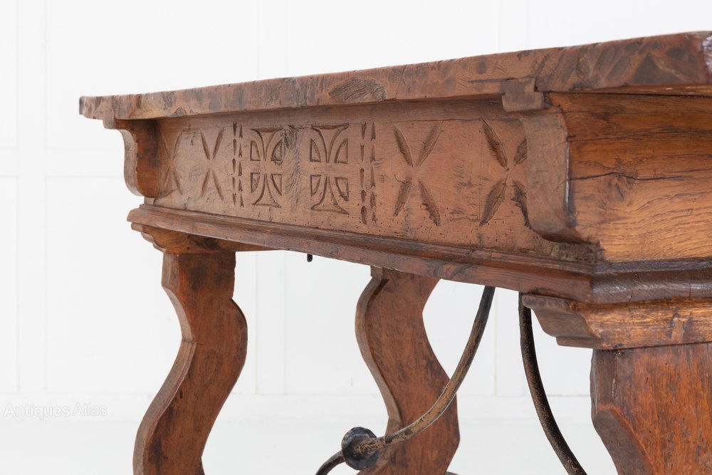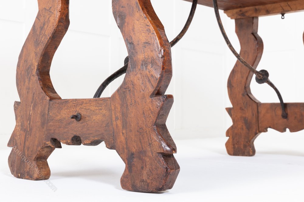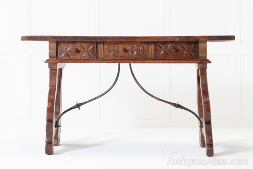 18th Century Spanish walnut table of small proportions. Having a rectangular overhanging top with three carved drawers. Supported by trestle form legs, united by its original hand forged iron stretchers.