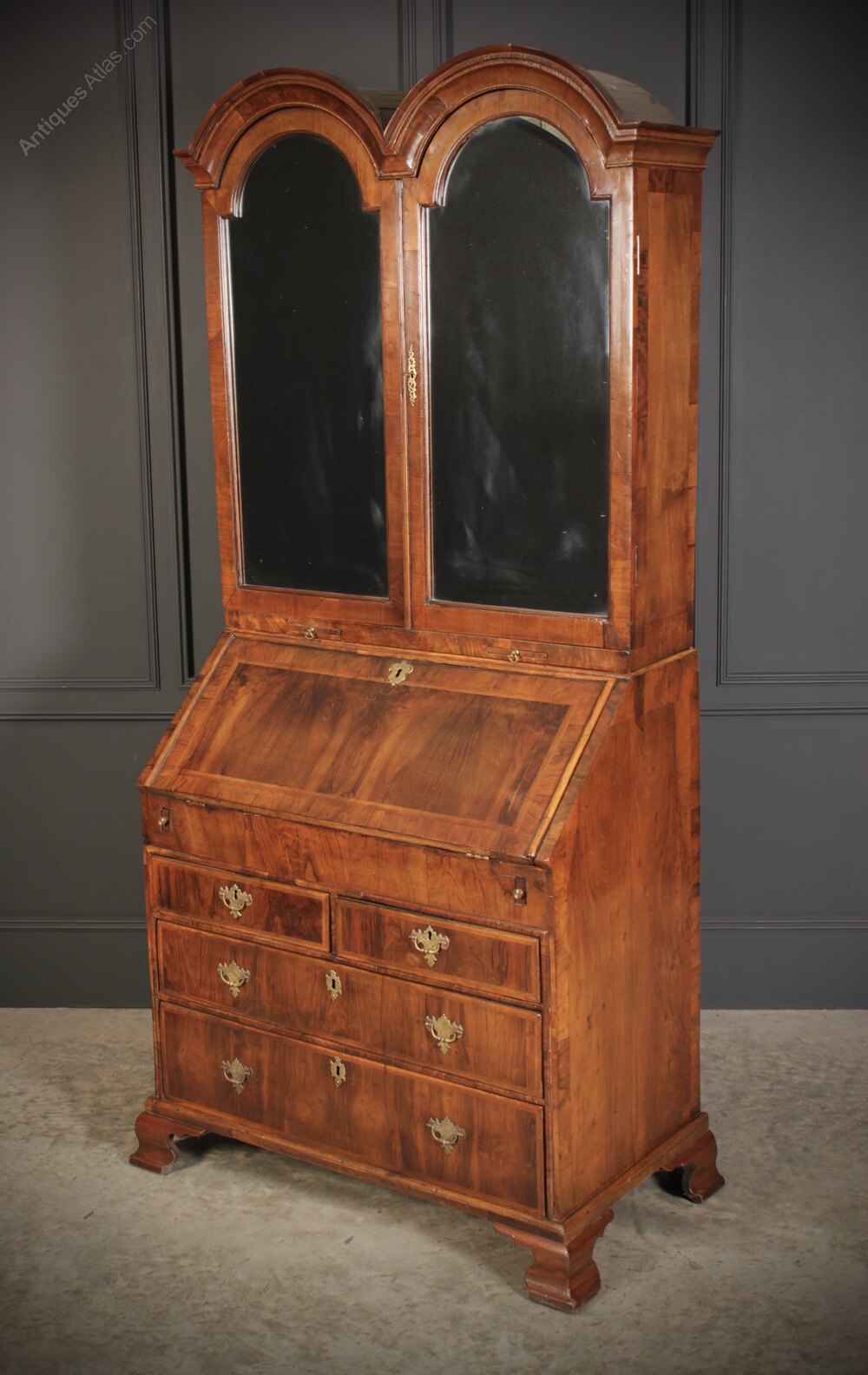 Beneath the writing section are two short drawers above two long drawers, with decorative brass swan neck handles. The piece stands sturdily on well-shaped ogee bracket feet, completing the classic Queen Anne silhouette.