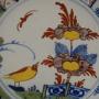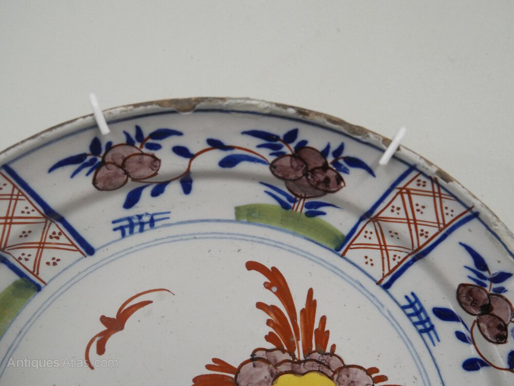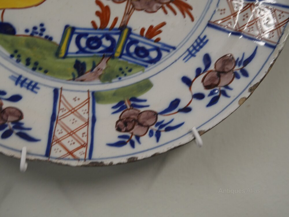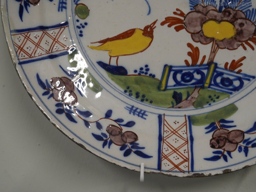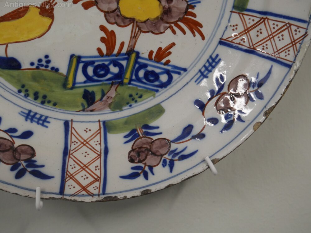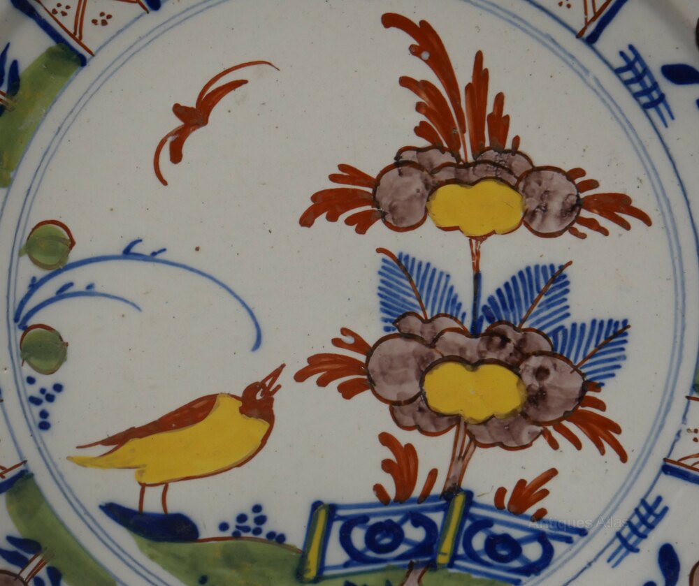 A charming 18th century Delft polychrome pancake plate with garden flowers and bird, interesting colours blue, manganese, green and yellow. Dated around 1740-1750 the plate has some rim fritting otherwise good condition.