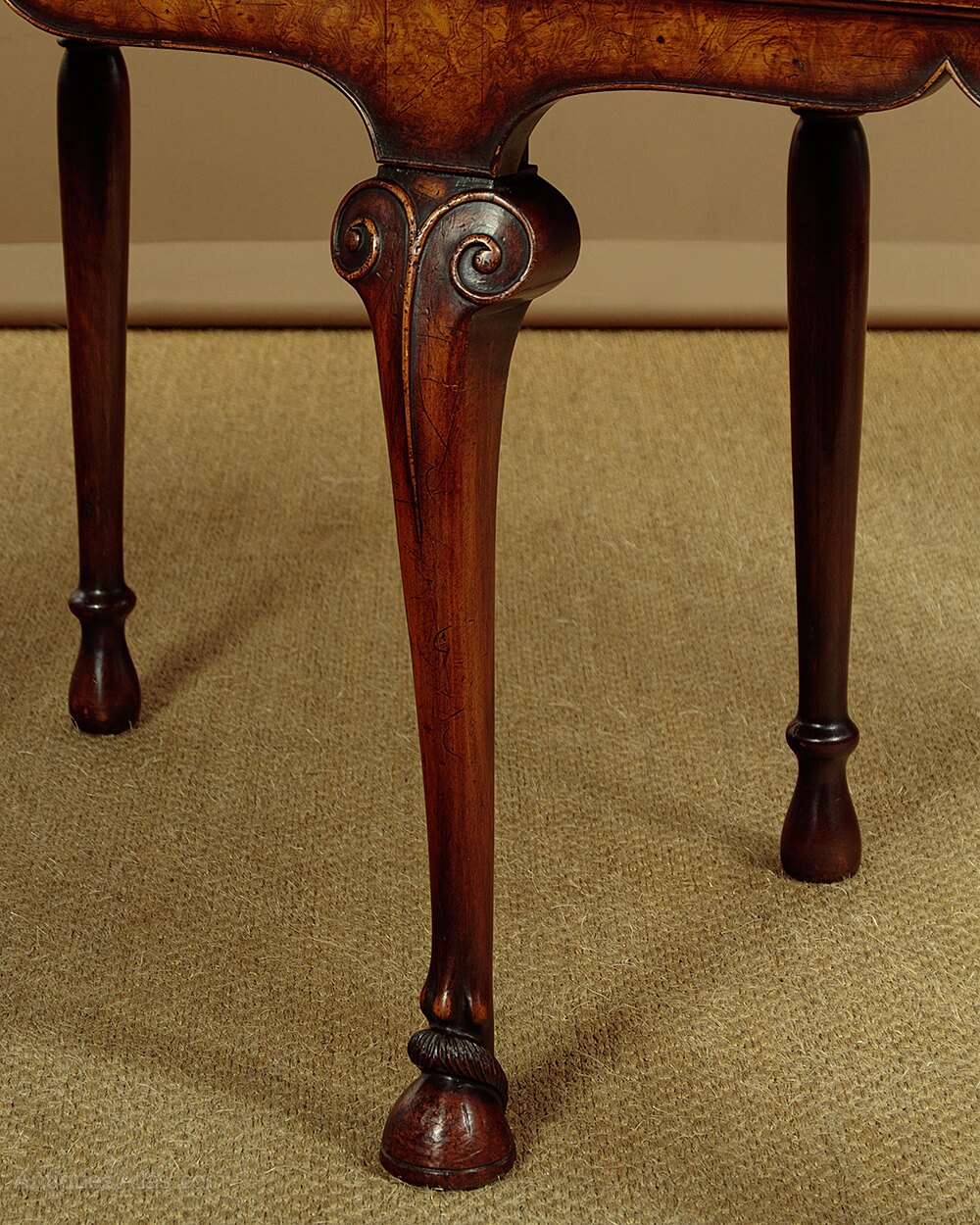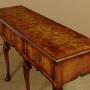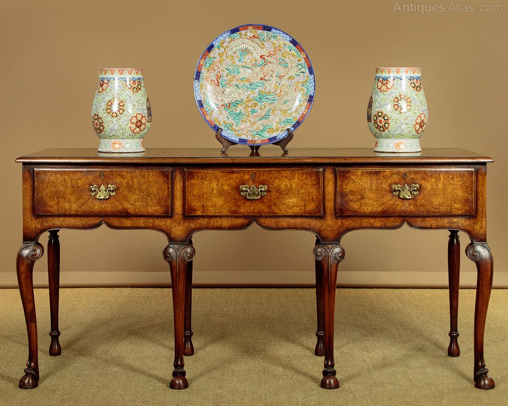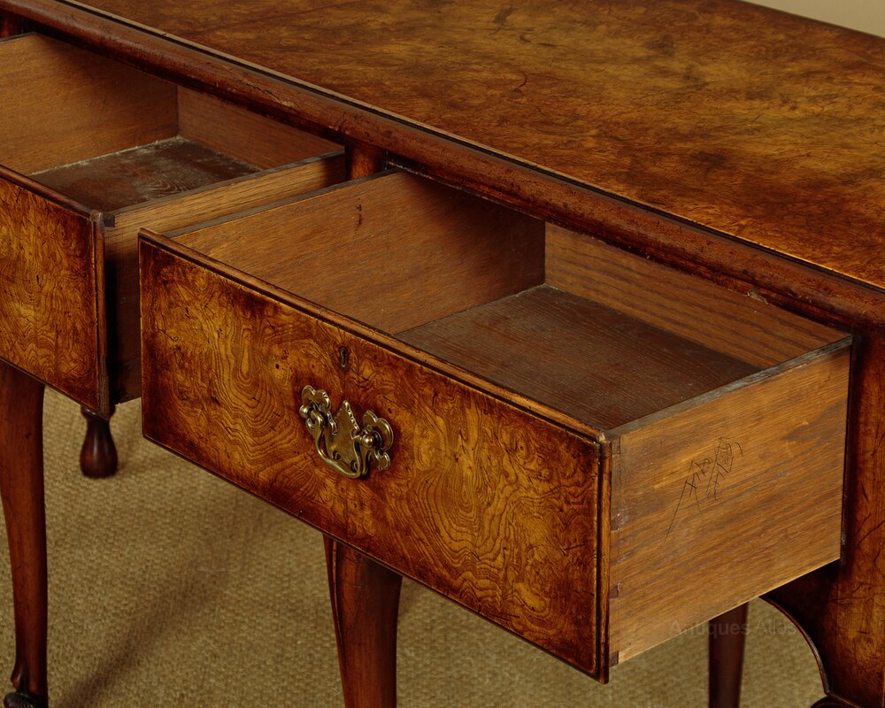 Unusual 18th.c. style dresser base or side table c.1960. Top veneered in highly figured and symmetrically arranged burr elm with a deep moulded edge. Burr elm front with three drawers, note how the grain is matched across the drawer fronts, with Georgian pattern brass handles. Oak drawer linings. Very attractive ogee arch shaped apron with a cockbeaded edge below the drawers and continued at the sides. Raised on superb George II style cabriole front legs in walnut with splendid carved hoof feet. Turned and tapering legs to the back edge. Some old wear and scratches to the top. Otherwise excellent colour and condition, cleaned and waxed in our workshops.