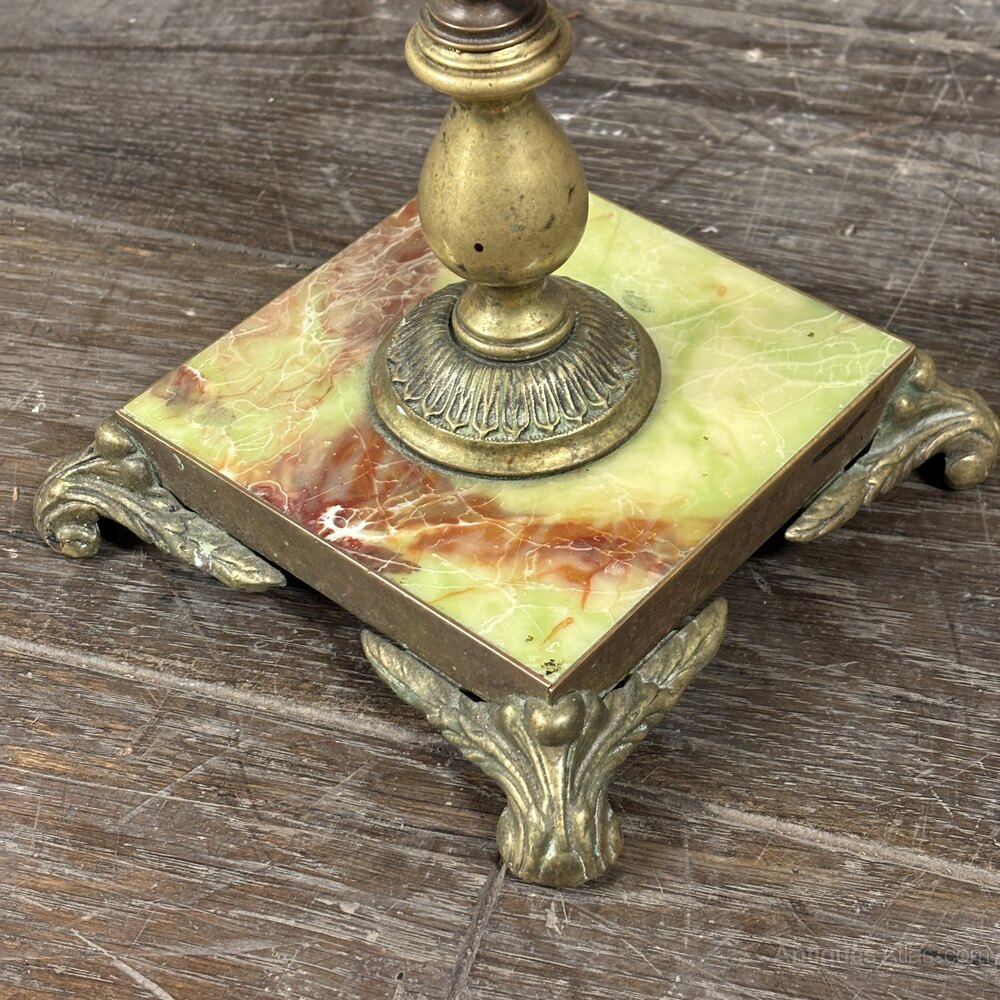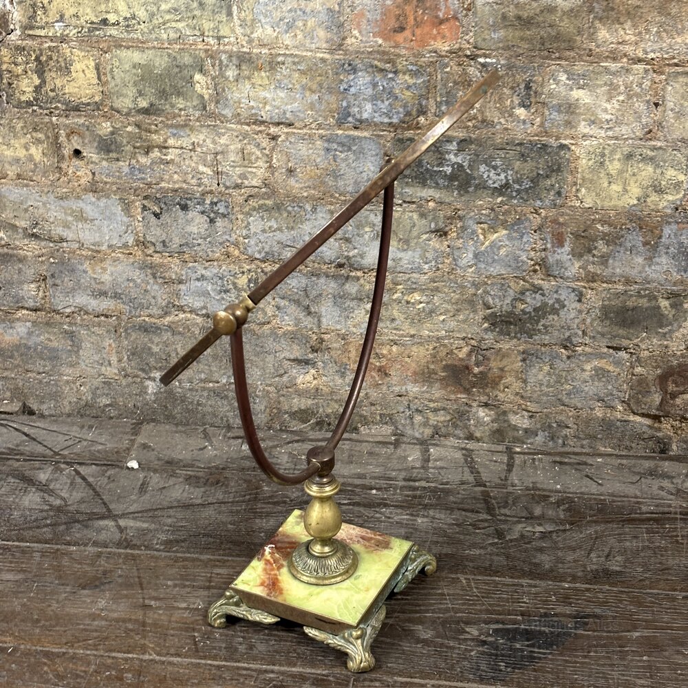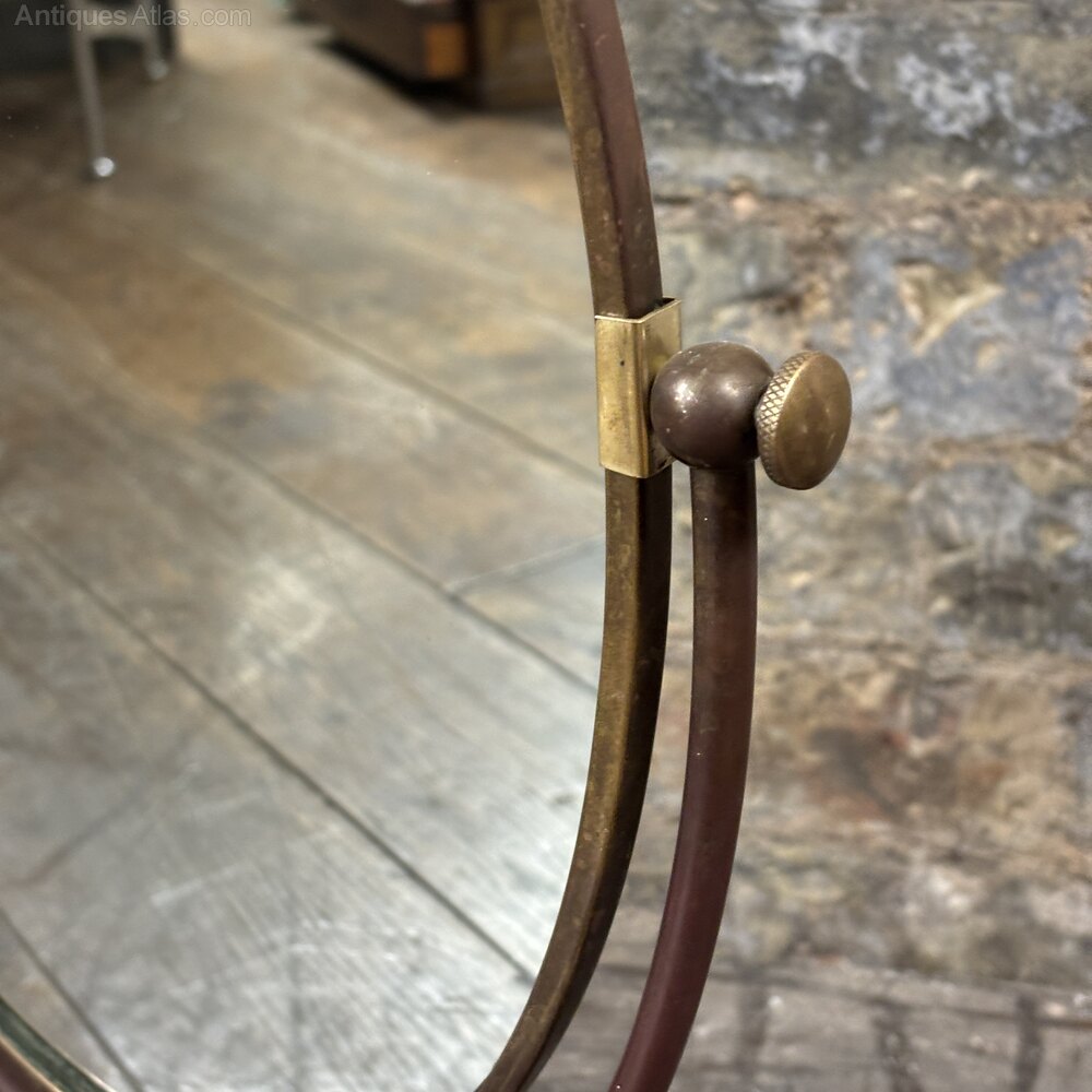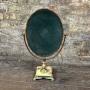 A fabulous late Art Deco 1930s dressing table mirror, featuring a brass frame with curved twin supports and an adjustable oval mirror. The mirror sits on a decorative cast base with a striking artificial green onyx inset, complemented by elegant brass detailing and scroll feet.