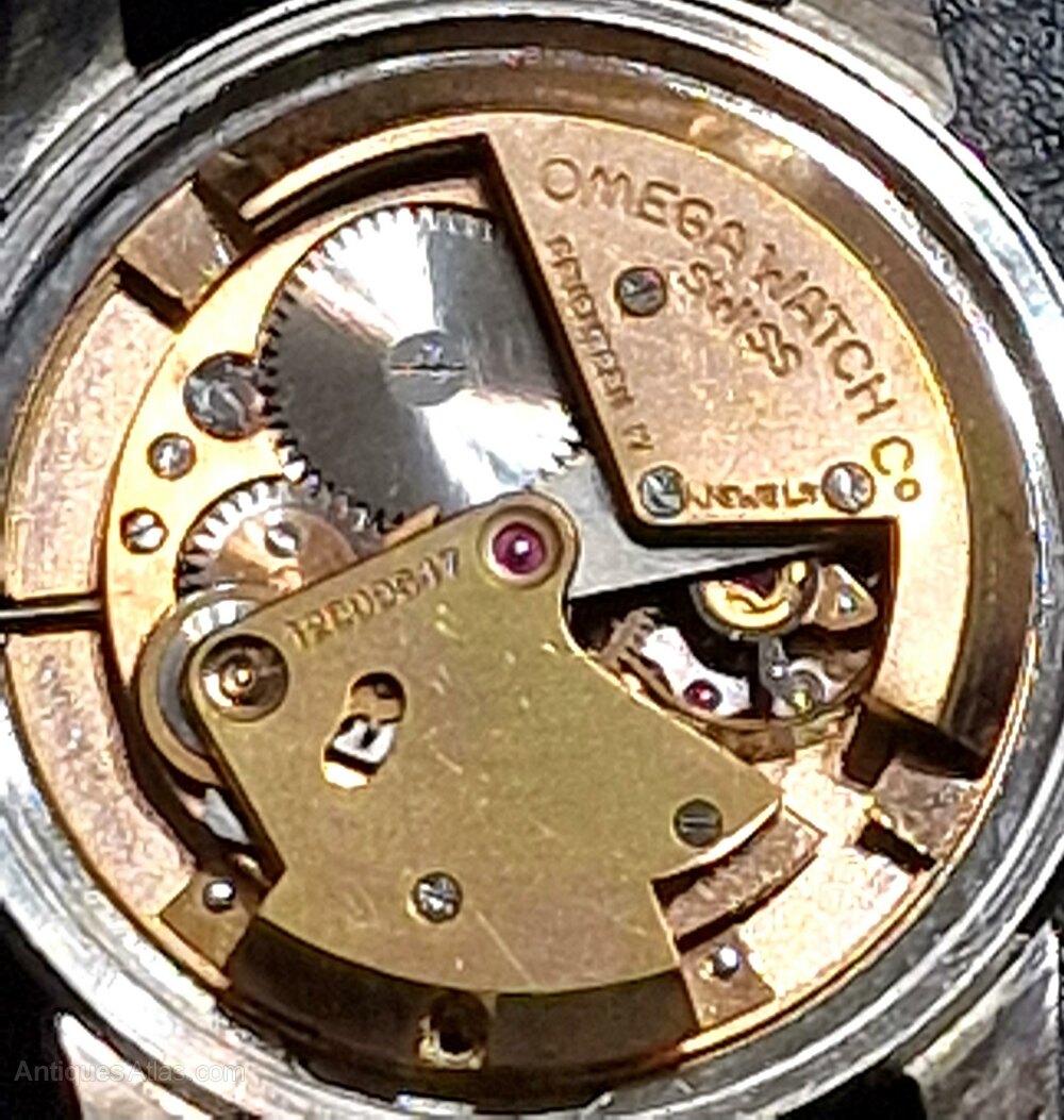 The watch is powered by a 17 jewel caliber 344 Omega automatic mechanism. The 12m serial numbers date this watch to 1950-1952.