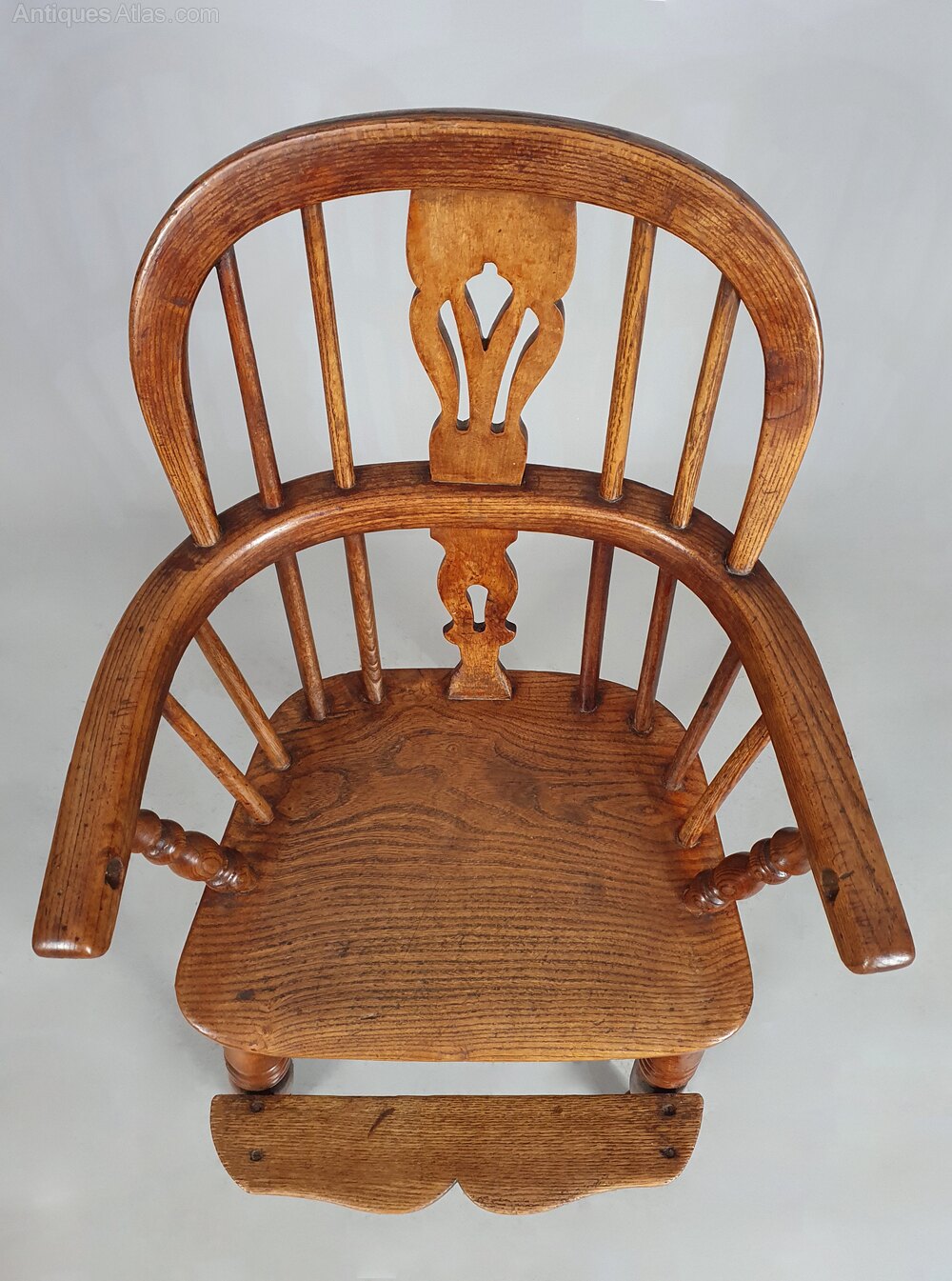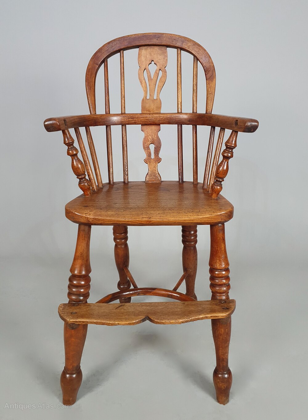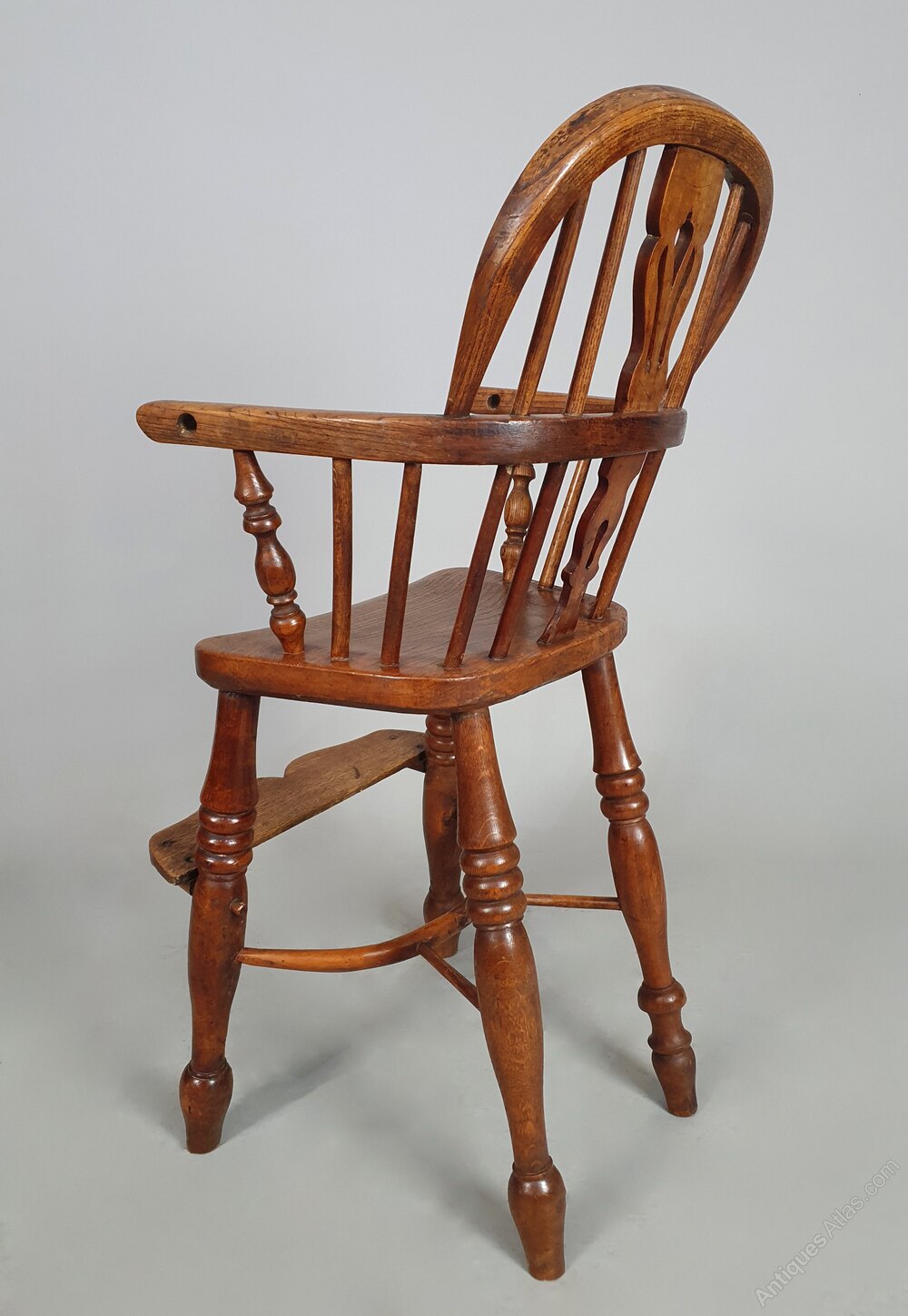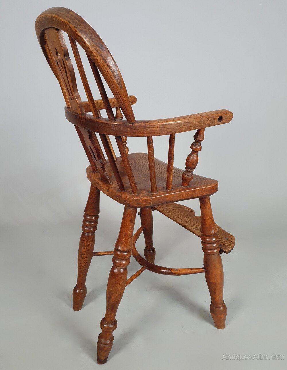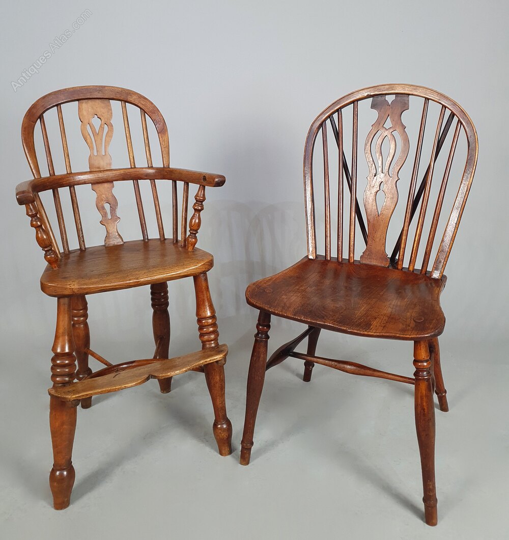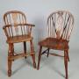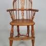A good early child’s Windsor high chair made in the traditional manner in elm, ash and oak and with a lovely crinoline stretcher – all of a good colour and in sturdy condition.