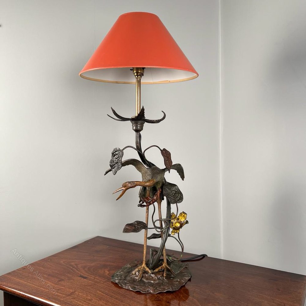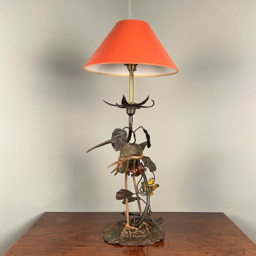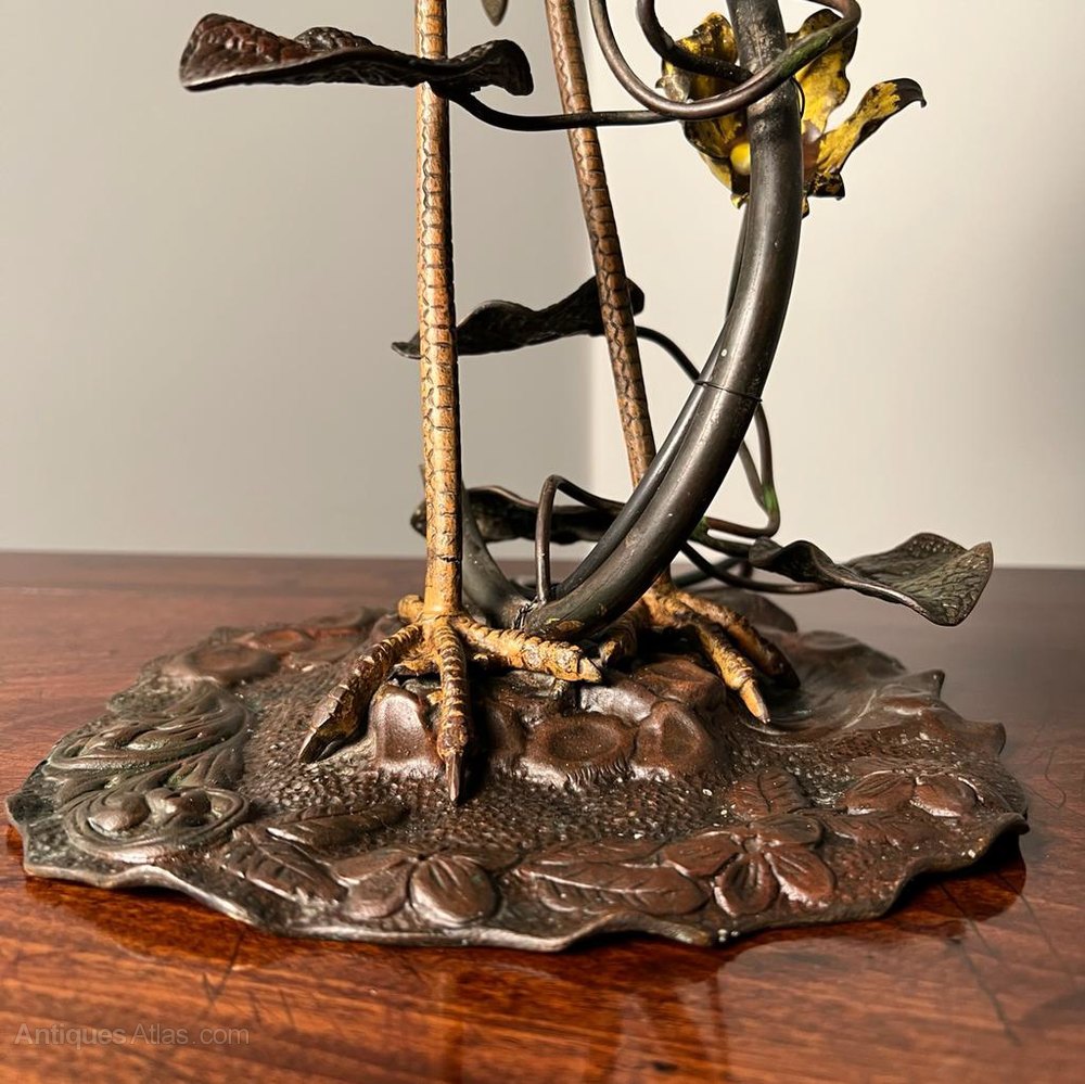 A magical 19th century lamp base in the form of a Crane bird, having wonderful muted colours, intricate details. Converted from oil to electric. Newly wired and PAT tested. Shade not included. English, Circa 1870.