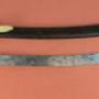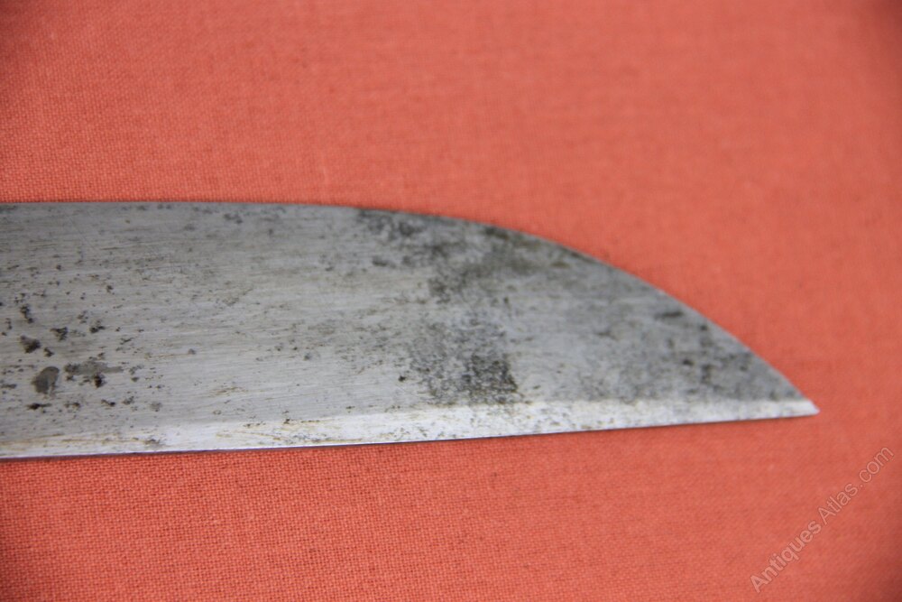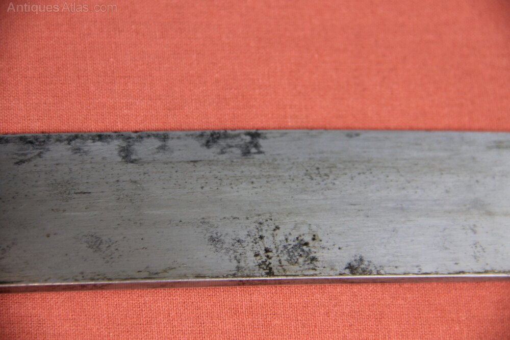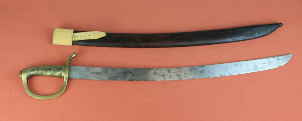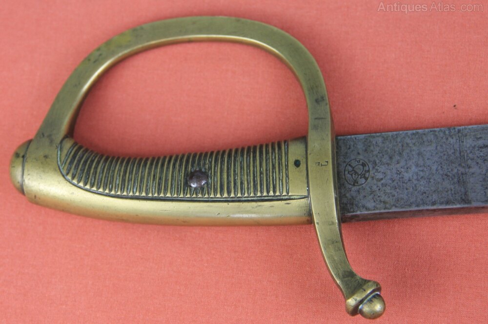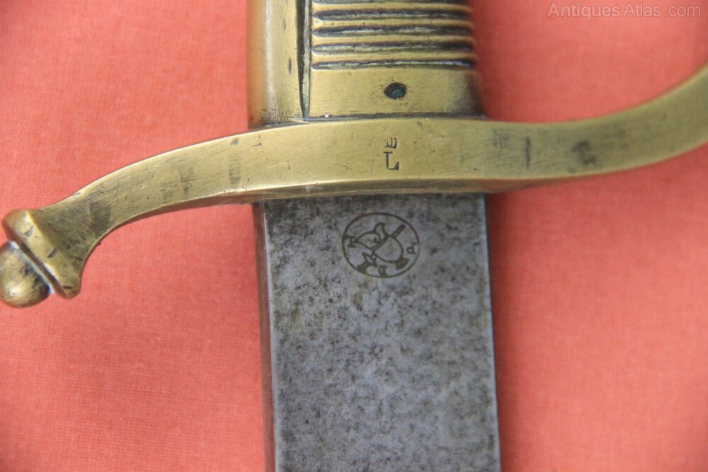19th century German Briquet short sword in its dark brown original leather scabbard with hanging strap. Has a solid cast brass hilt stamped with a crowned L. There is a curved, single edged blade with one or two edge nicks and some rust staining. Made by Peter Daniel Lüneschloss, Solingen and stamped with his company mark. In good solid condition overall.