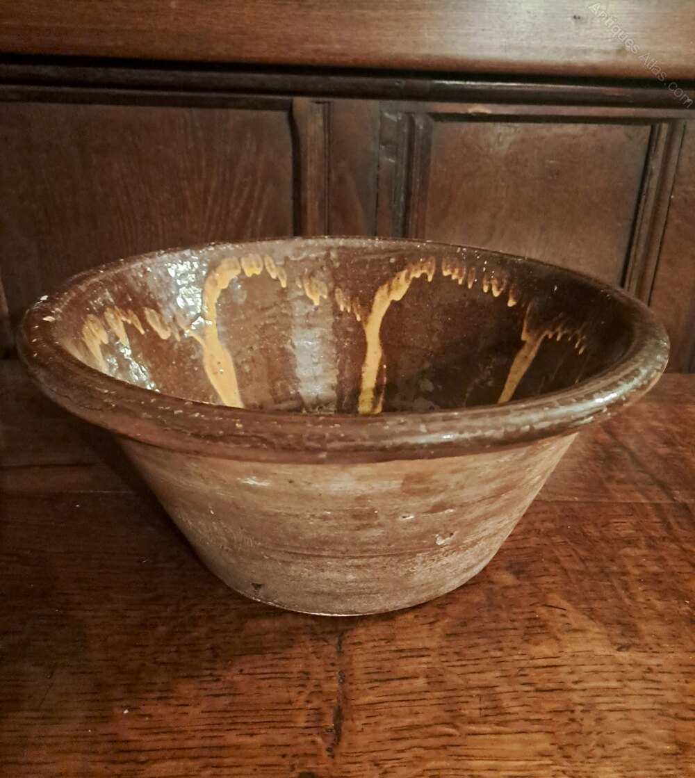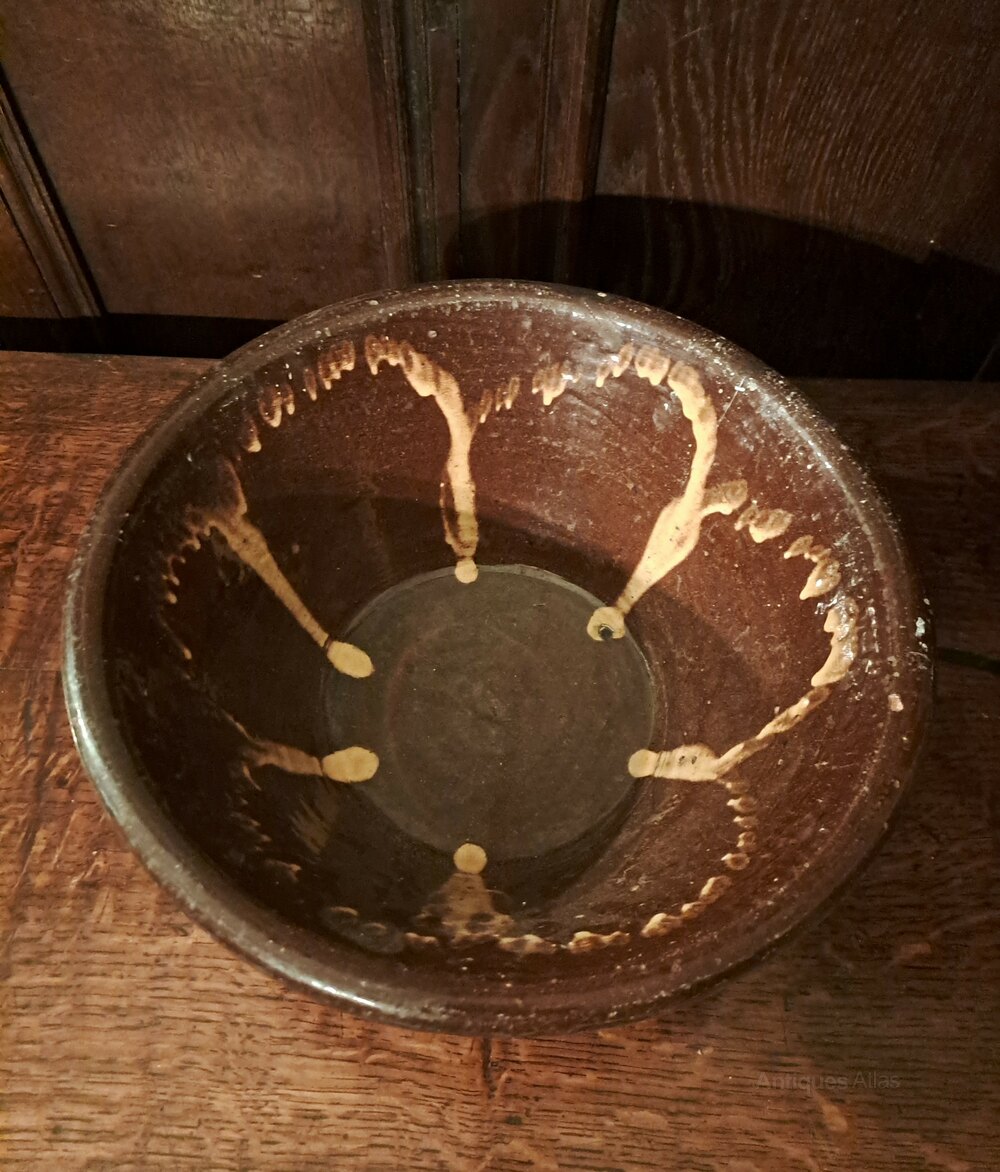 For sale by Hutton-Clarke Antiques is this charming 19th century Irish slipware bowl, attributed to the Coalisland potteries in County Tyrone. Handmade in red earthenware with a rich treacle-brown glaze, it features simple yet striking yellow slip decoration characteristic of rural Irish folk pottery of the period. The interior is boldly decorated with radiating trails of slip, giving it a lively and spontaneous feel. A fine example of vernacular Irish ceramics, showing the warmth and individuality of country-made pottery.