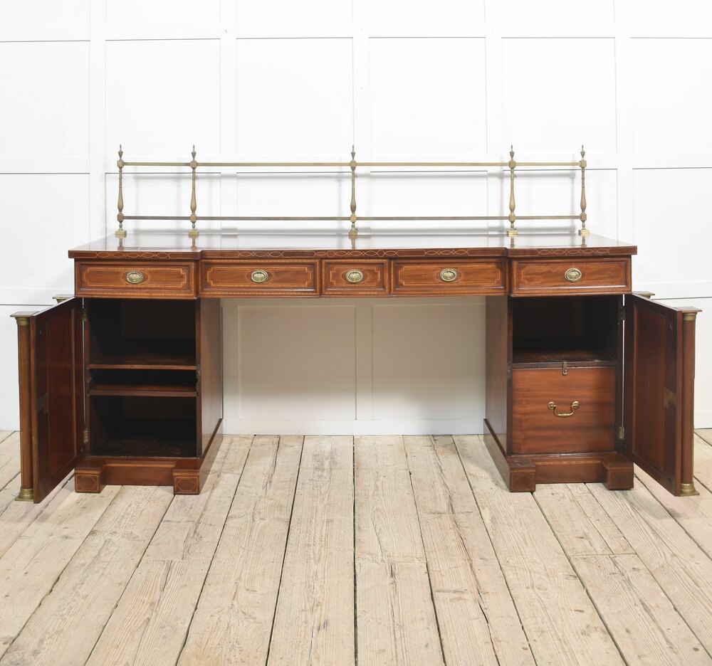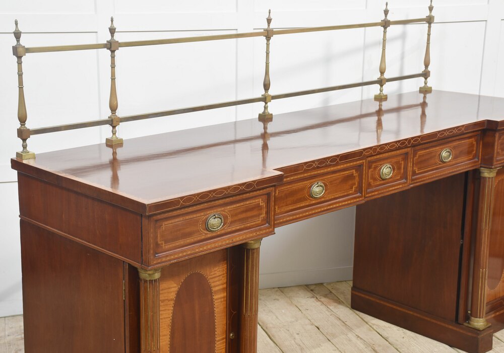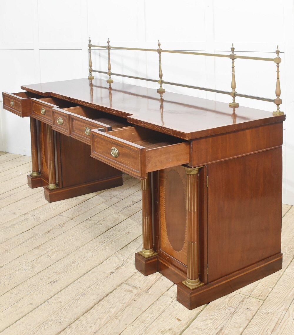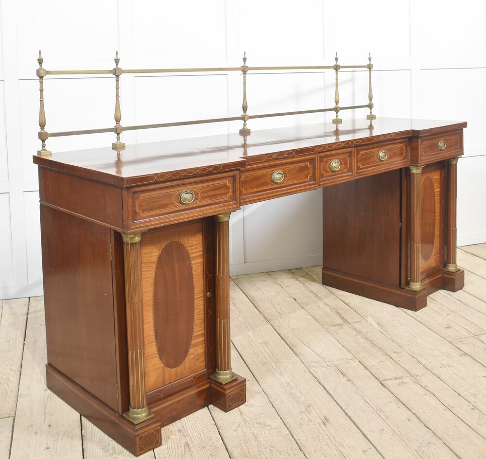 Sheraton revival mahogany inlaid sideboard. The raised brass gallery back above large mahogany inverted breakfront top with satinwood crossbanded edge to the frieze fitted with an arrangement of drawers all having brass tooled handles. All raised up on a pair of pedestals with oval inlaid paneled doors flanked by brass inlaid columns. One pedestal fitted with the original lead-lined cellaret. Terminating in plinth base.