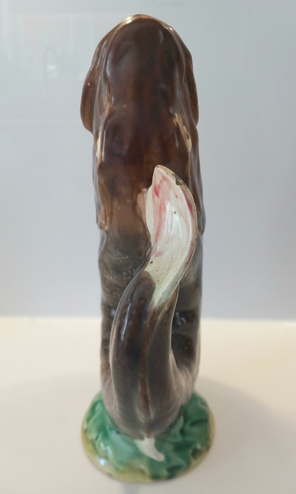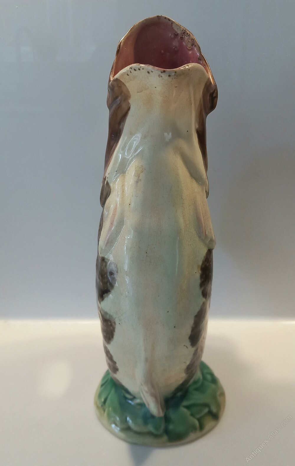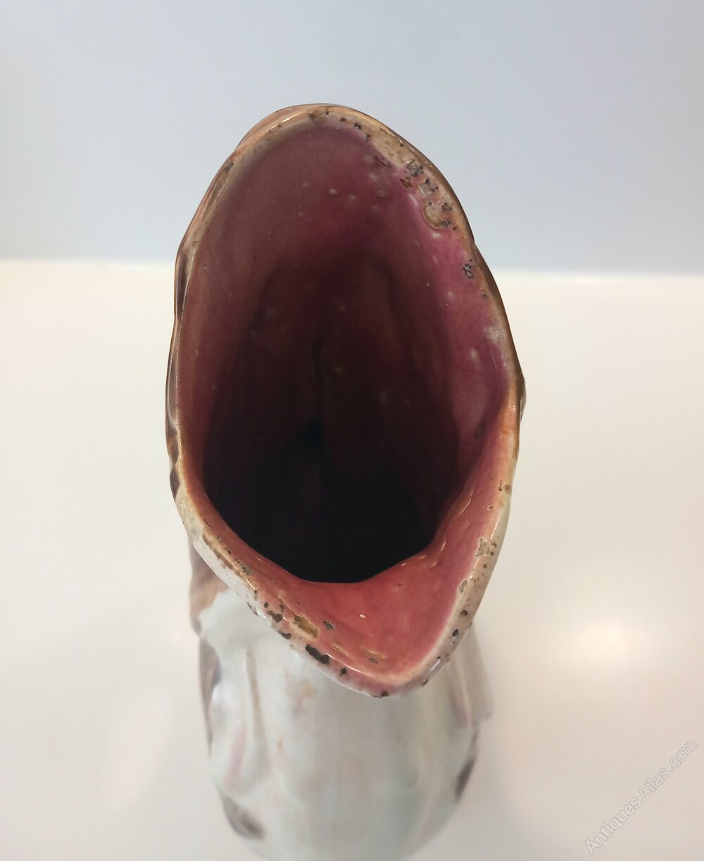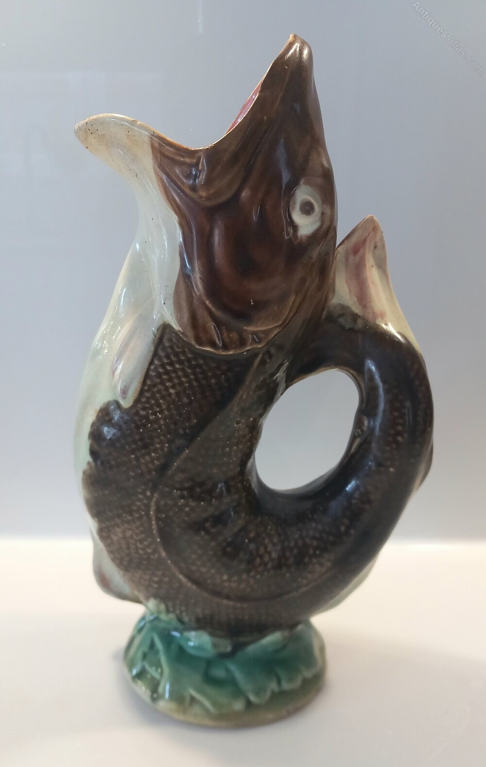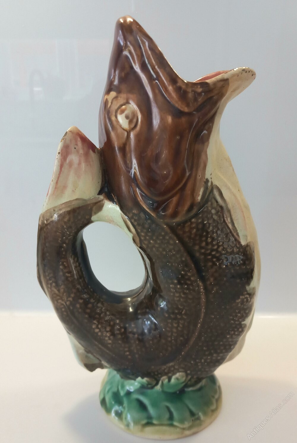 19th century majolica gurgle jug possibly by Holden. 27cm tall in very good condition with one small chip to the tail , see photos.