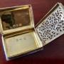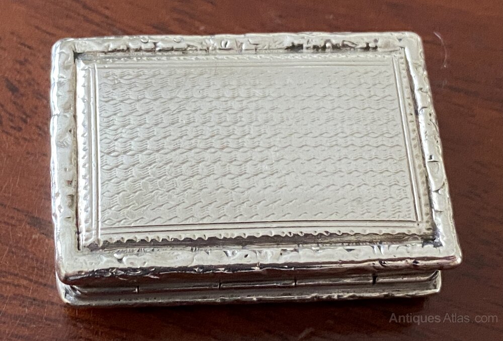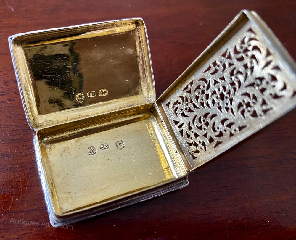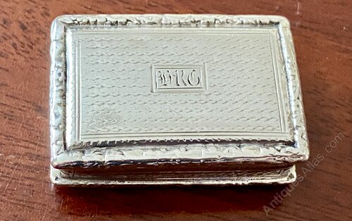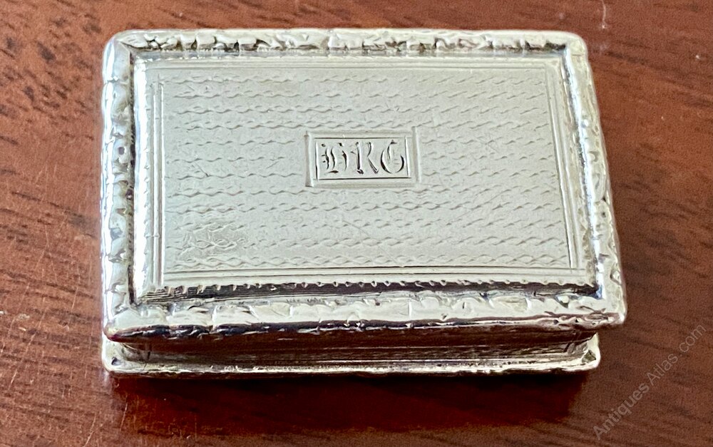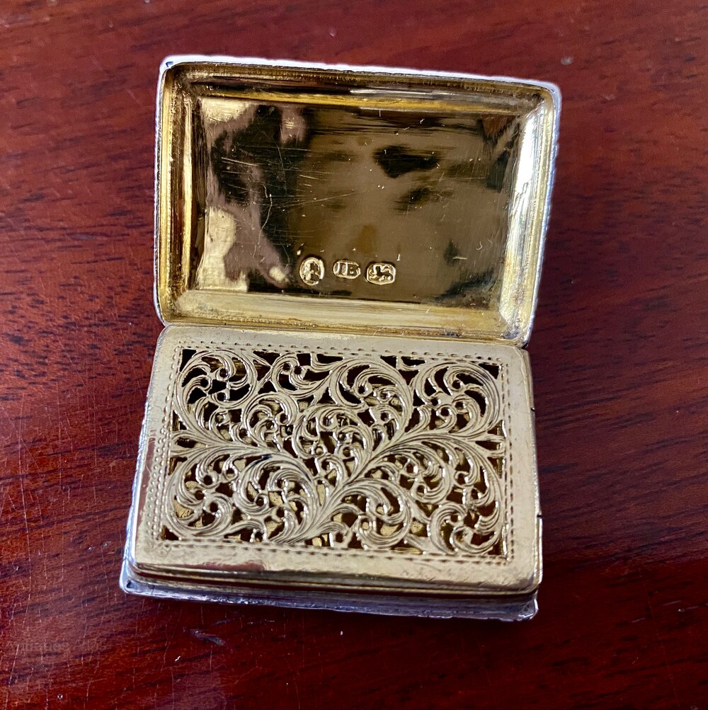 An excellent quality Silver Vinaigrette B.ham 1825 for John Bettridge.Engine turning to Top and Base. The lid has central Cartouche with Monogramme.Opens to reveal beautifully Silver Gilt and Pierced Grille.Full clear Hallmarks.Gilding very bright. Dimensions-8 x 2.7cms.Wt.25.7gms.Perfect for the Collector.