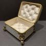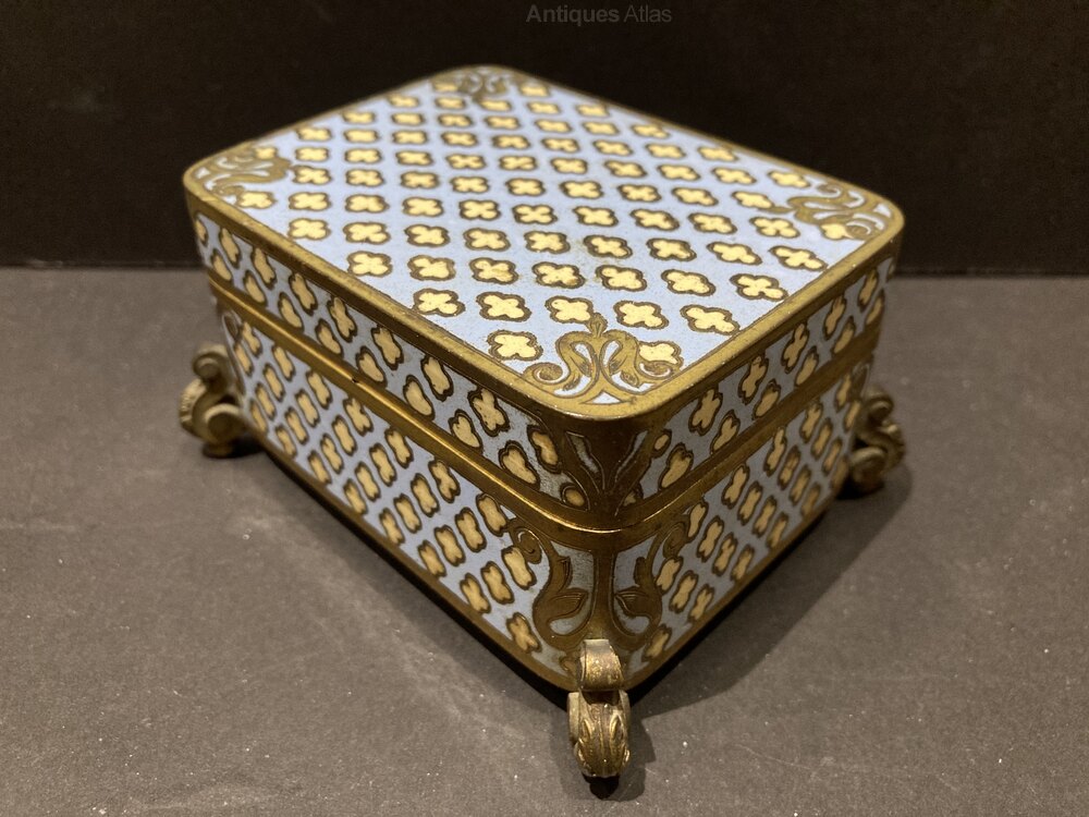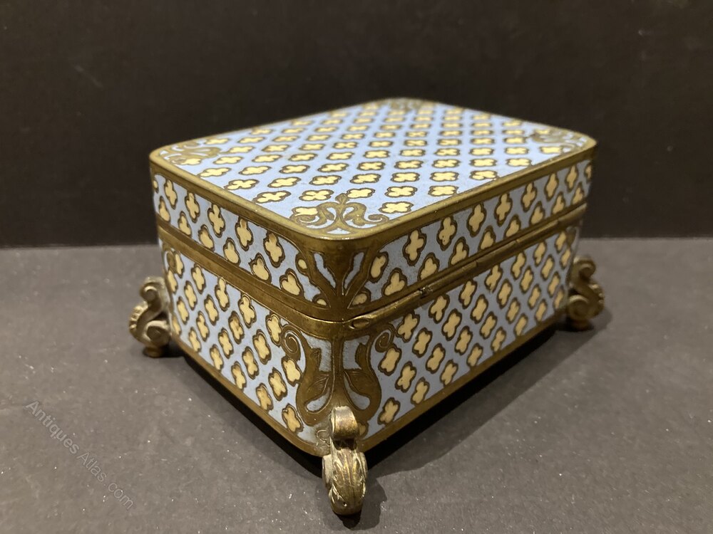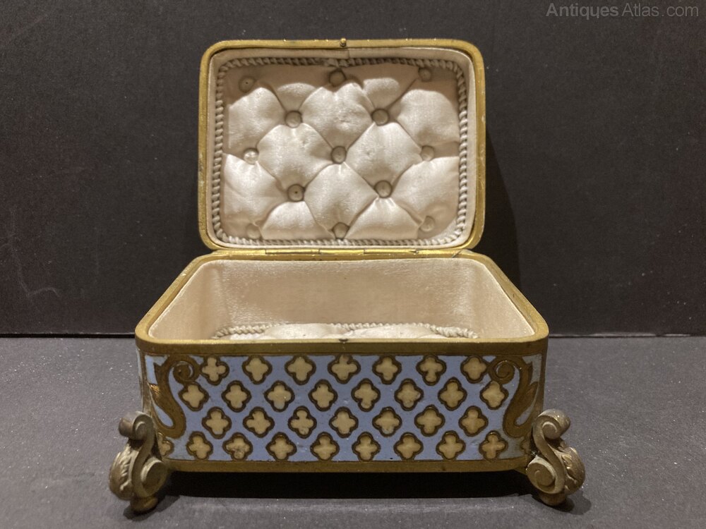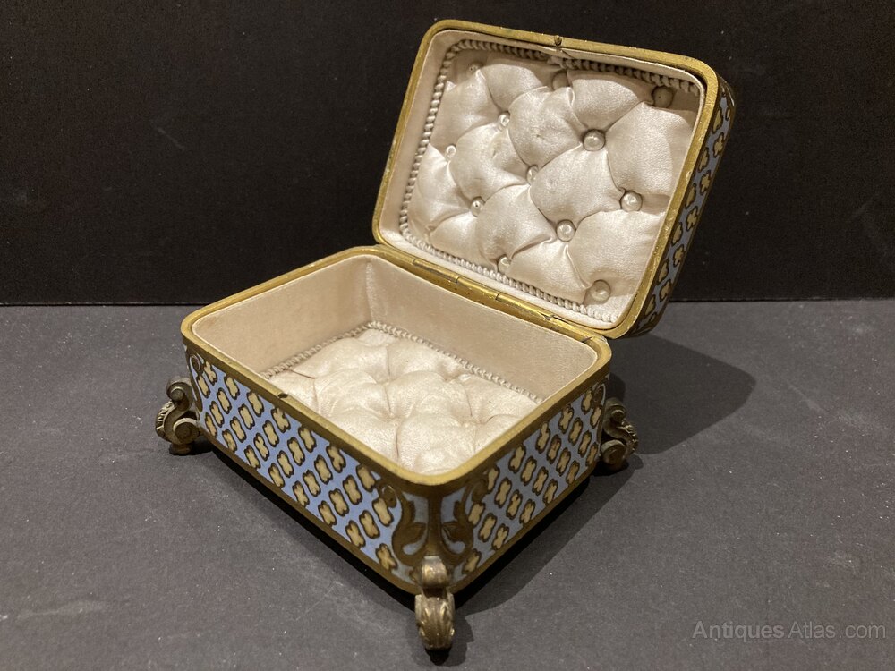 Lovely quality 19th century French gilt bronze and pale blue/cream champleve enamel jewellery box with a plush padded and studded interior.