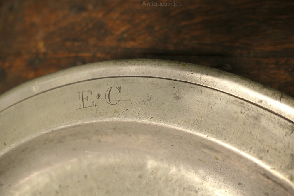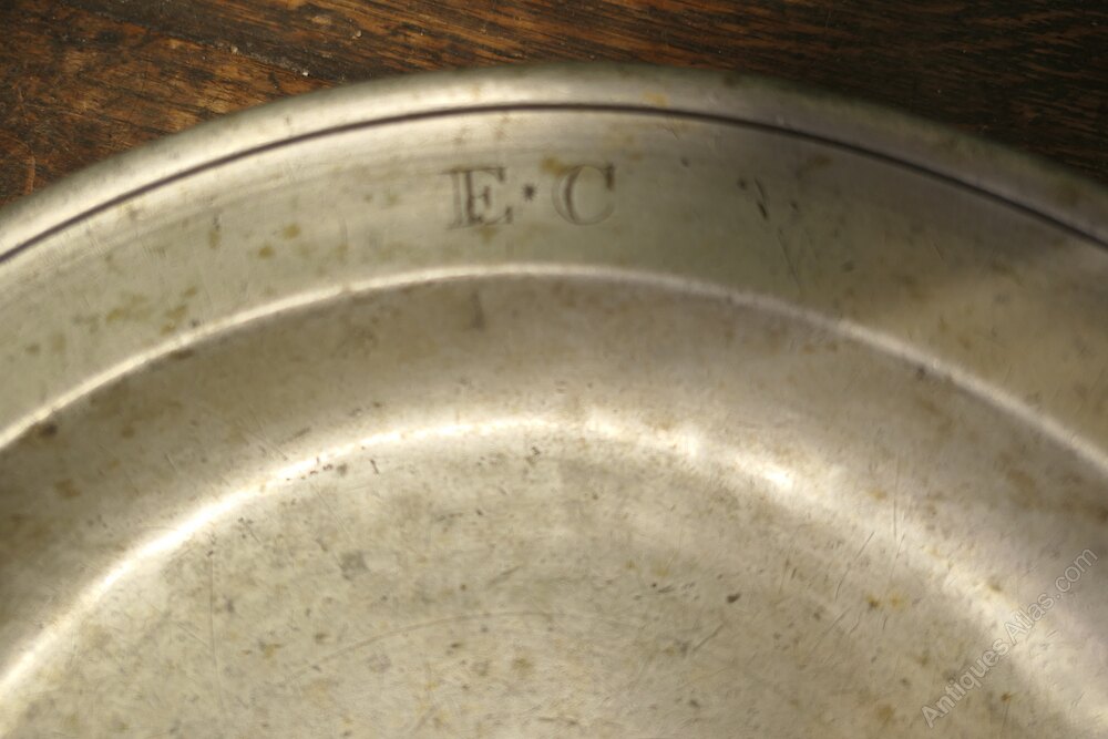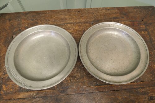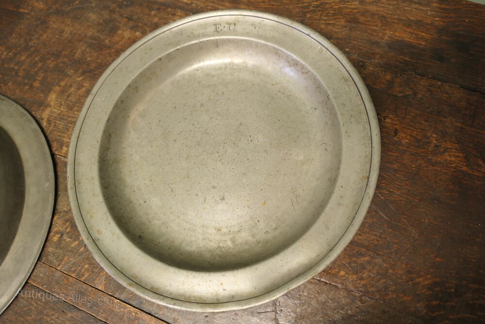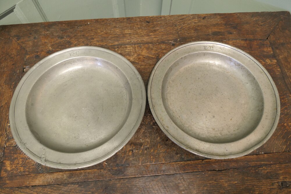 Antique English pewter folded rim plates, the front rim is engraved with the initials ''EC''. On the underside of both plates there is the touch mark of Thomas Dean Alderson of London who worked 1796 - 1852.