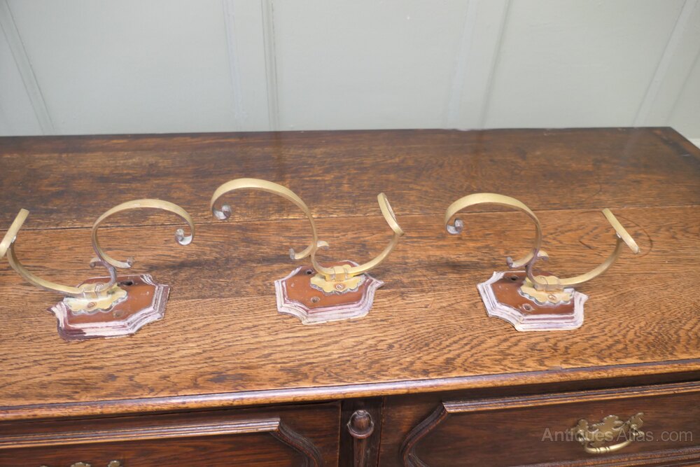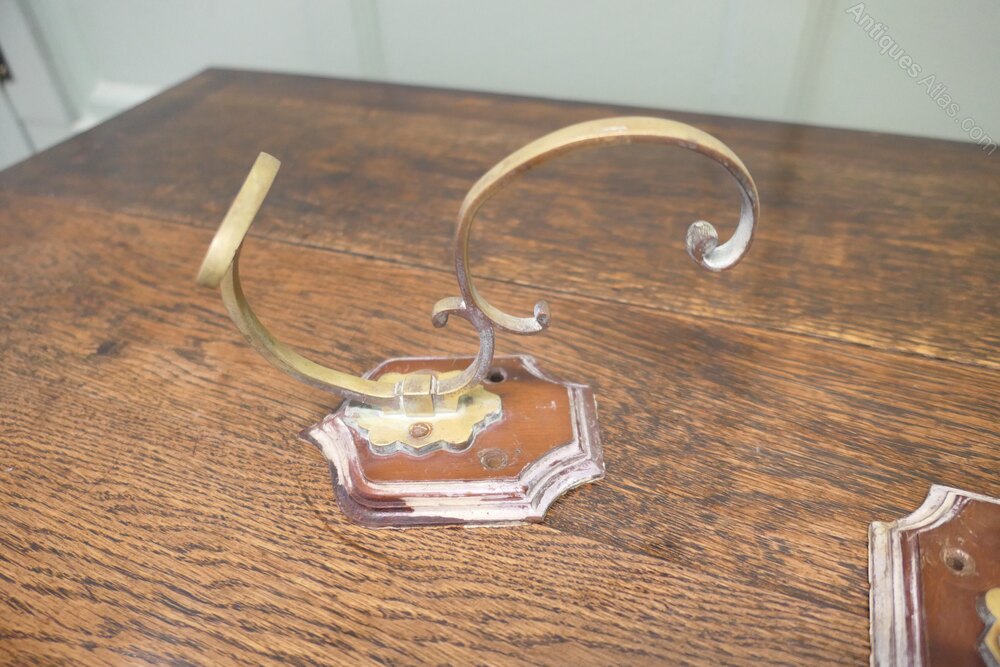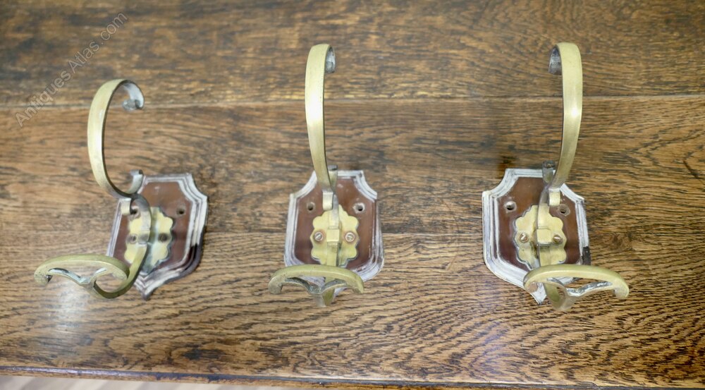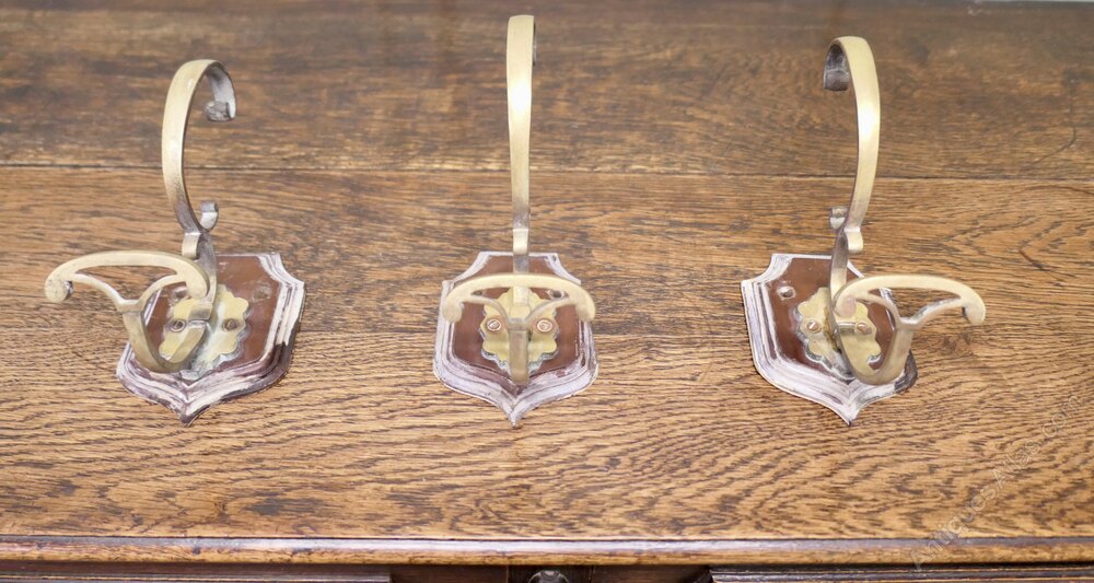 3 lovely large coat and hat hooks, these are hand made pieces, fashioned in brass and each set on a wooden shield shaped back plate