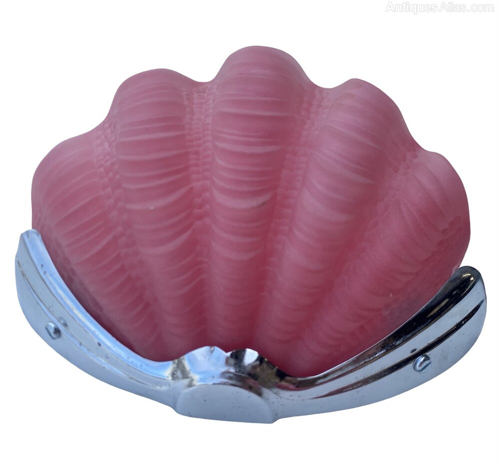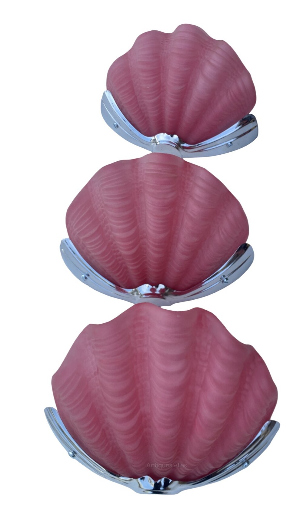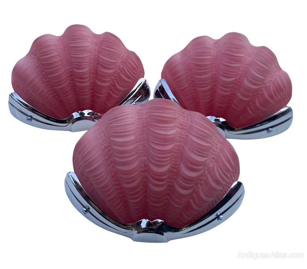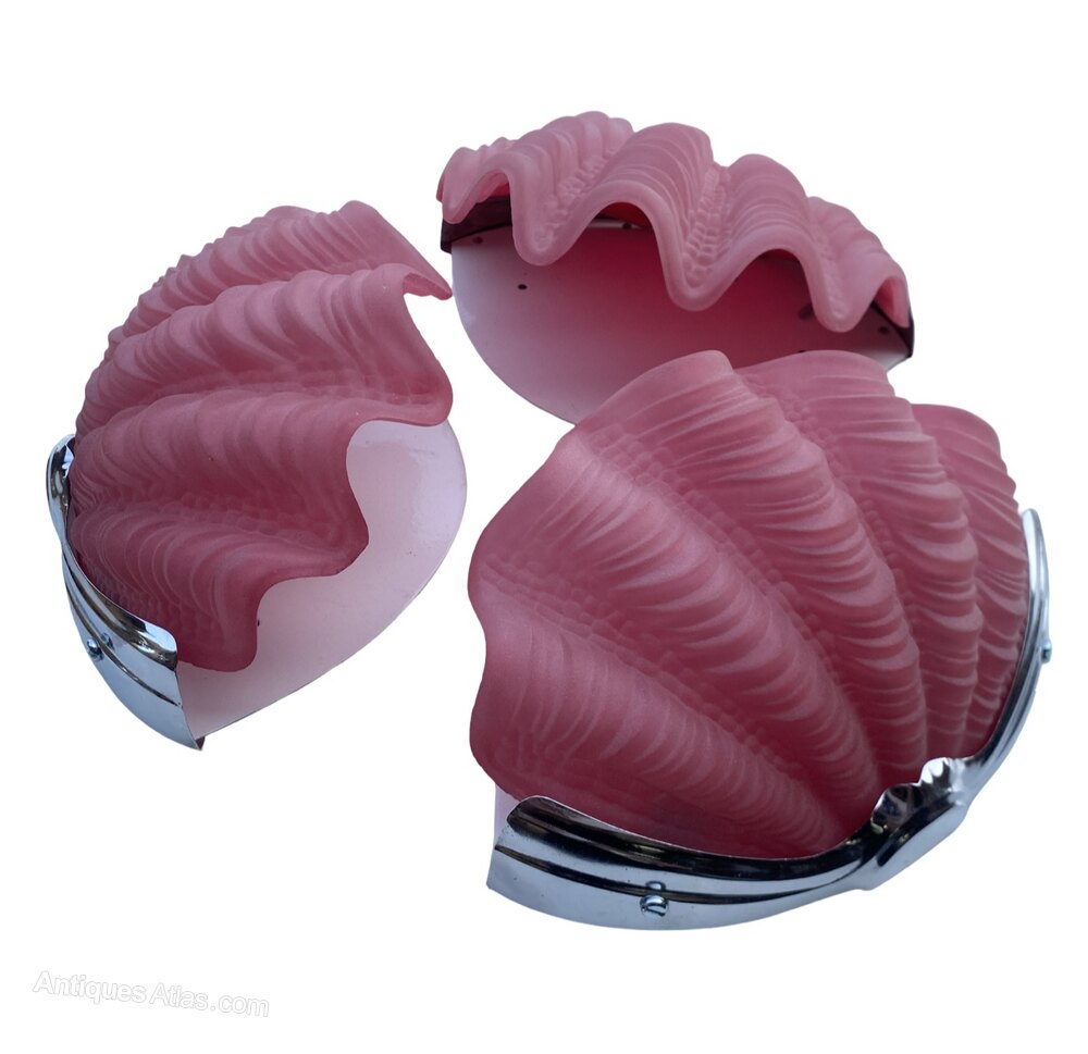A beautiful set of 3 Art Deco Shell Wall Lights. The shades are in excellent condition and a lovely candy floss pink. These are held firmly in place via small chrome brackets and sit neatly in the chrome backplate, again in very good condition with only a small amount of wear commensurate with age. They come fully rewired and ready to install.