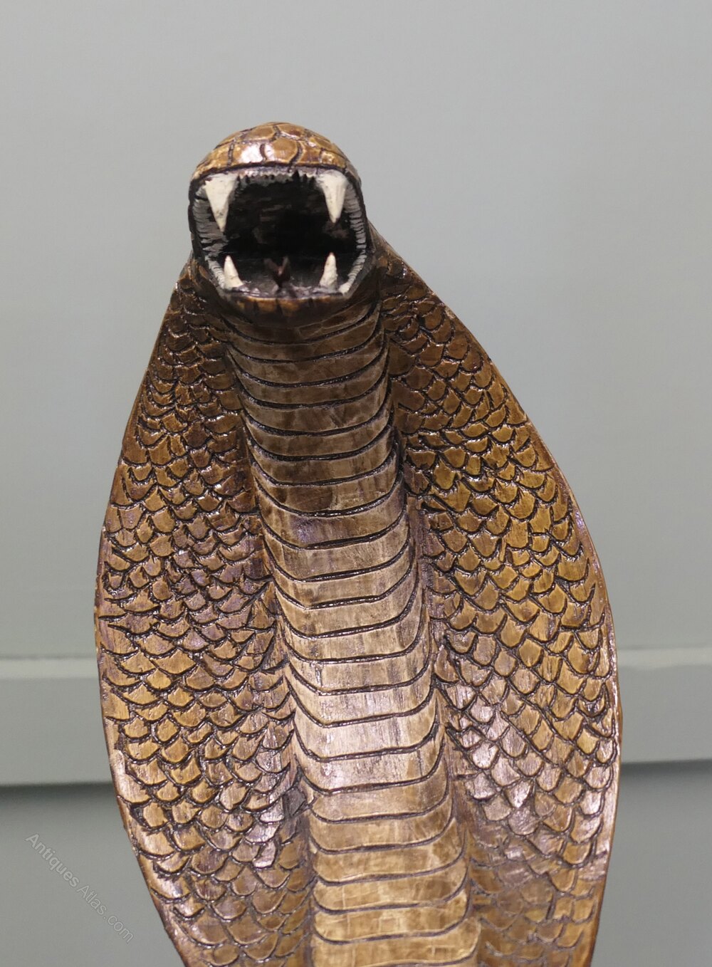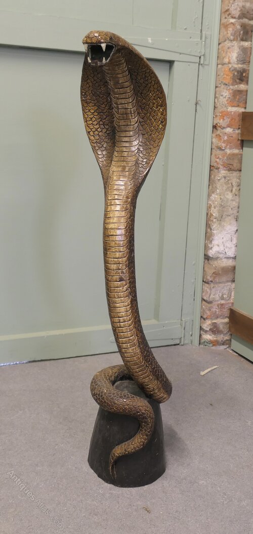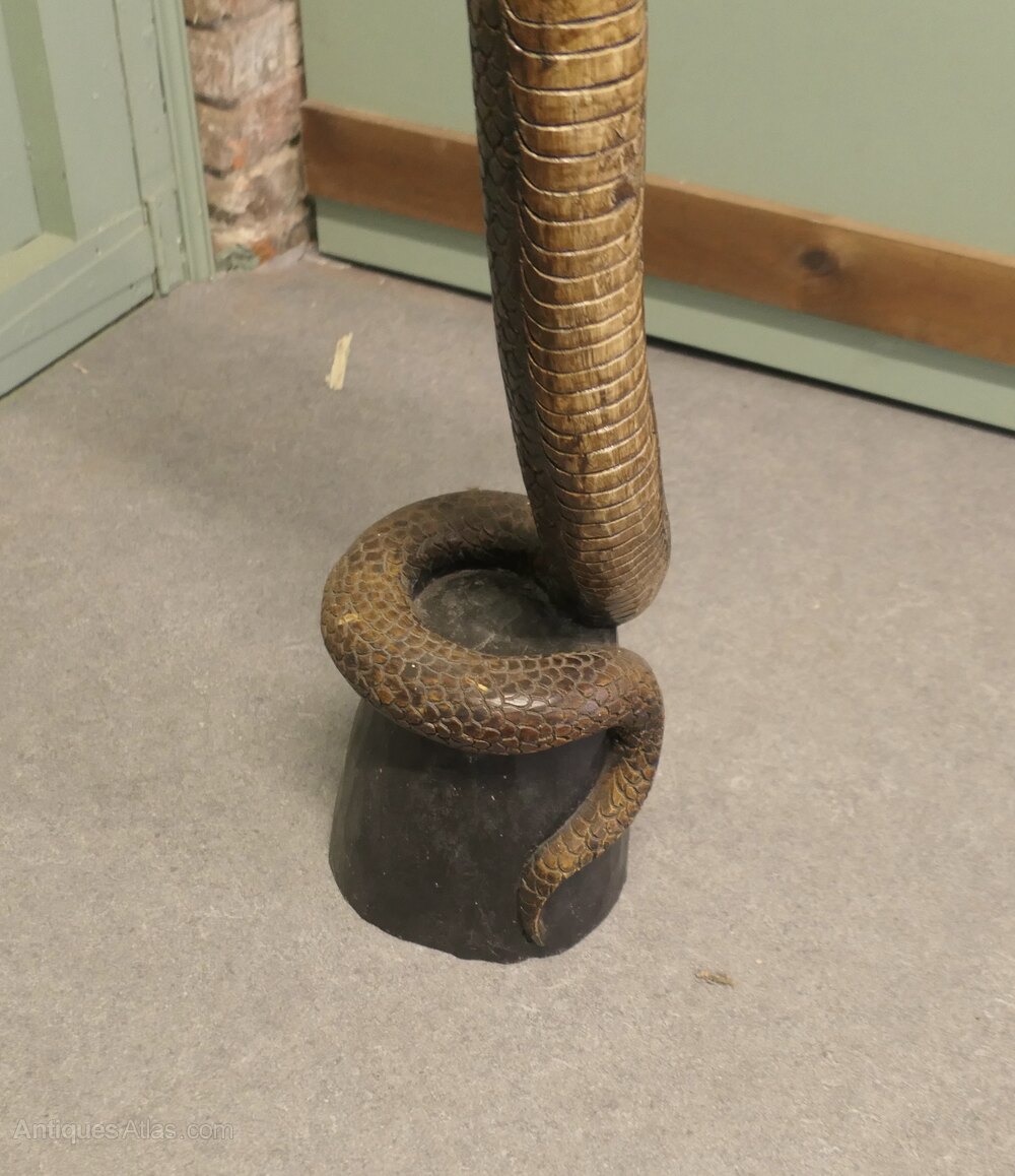 This wonderful piece is Carved from a single piece of wood the carving is fully 3 dimensional the Cobra has scales and teeth, he is wound around a log at the bas and is showing a fearsome open mouthed face at the top