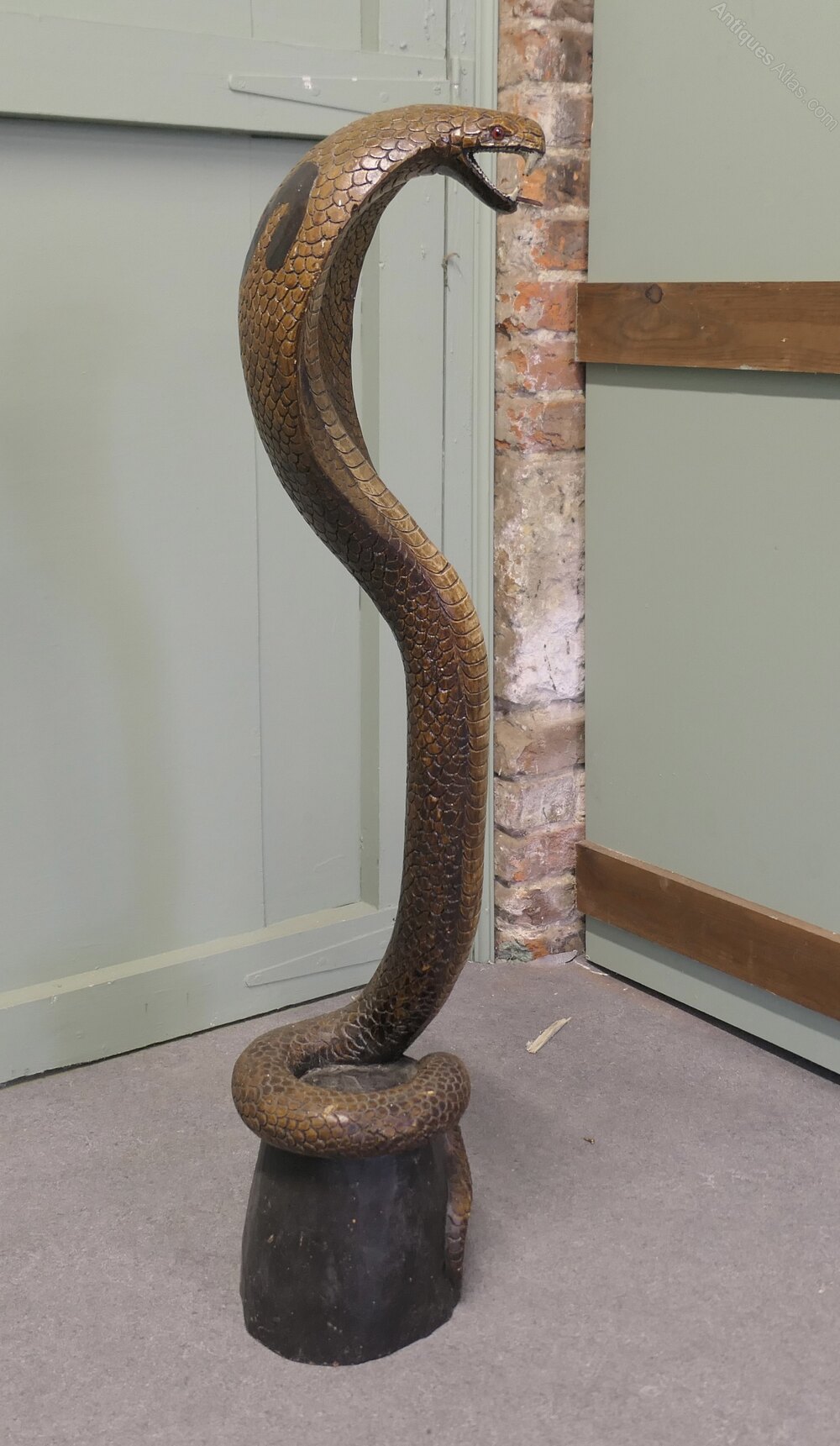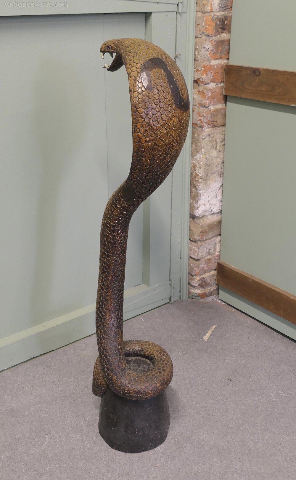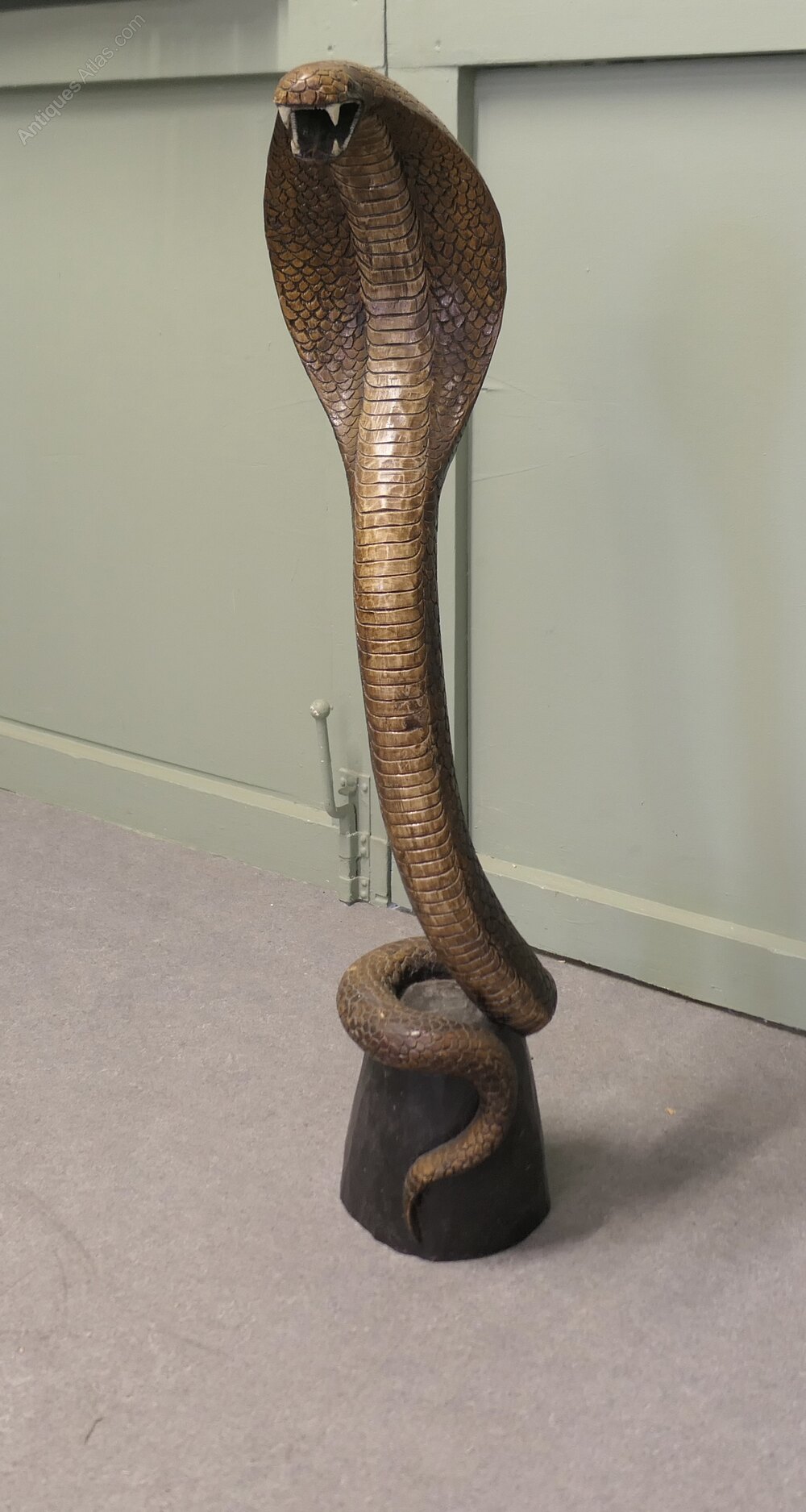 This wonderful piece is Carved from a single piece of wood the carving is fully 3 dimensional the Cobra has scales and teeth, he is wound around a log at the bas and is showing a fearsome open mouthed face at the top