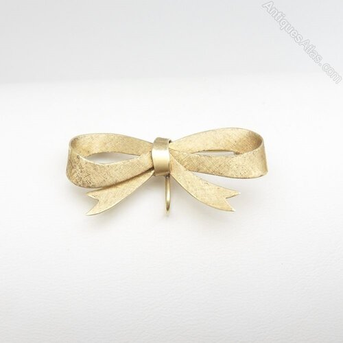 An attractive 9ct gold vintage bow brooch with a hook loop to hang a fob from. The bow has a lovely textured satin finish with the polished loop in the middle. The hook could be used to hang a light fob watch or maybe a gem set pendant or charm. A really versatile piece as you can add more colour or more texture depending on the drop you choose.