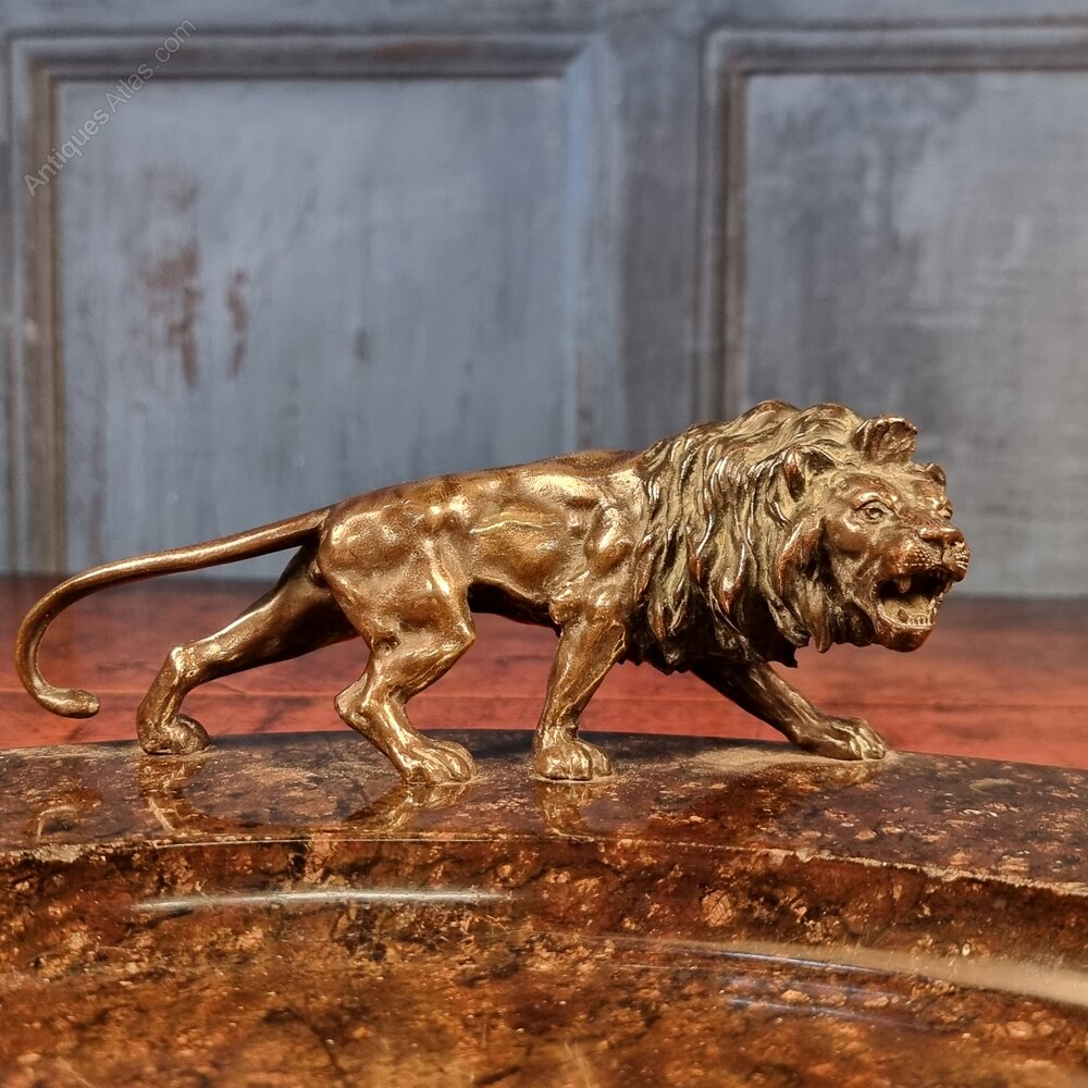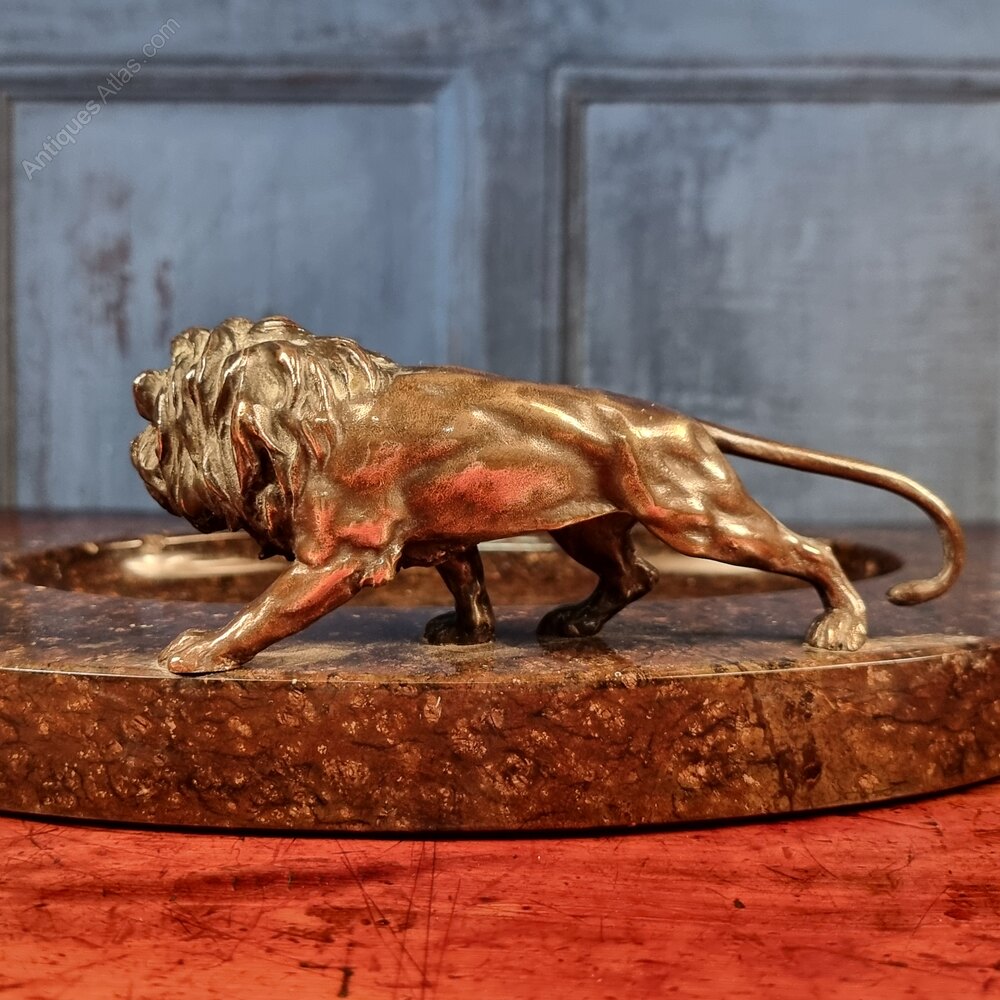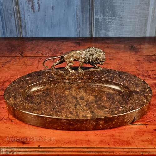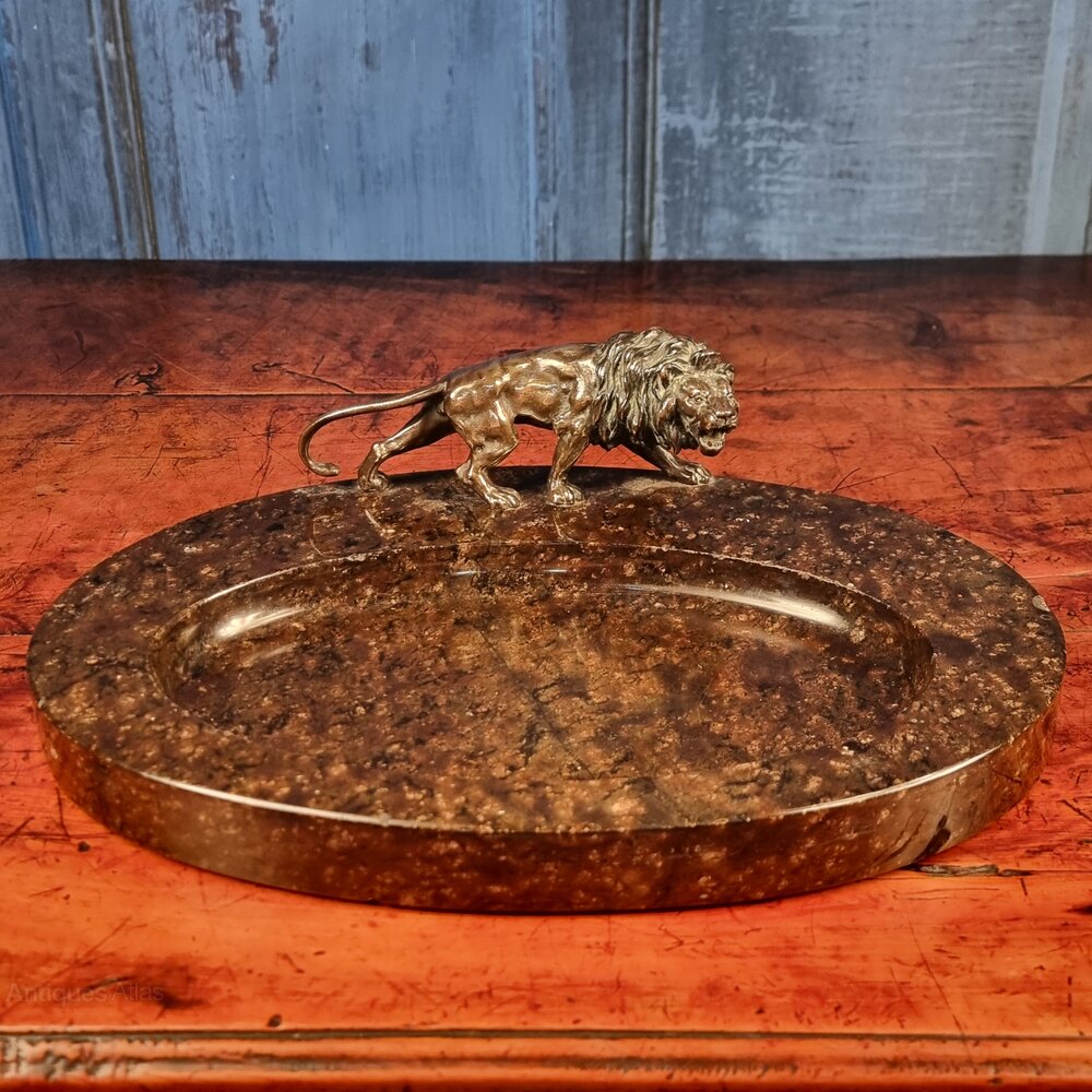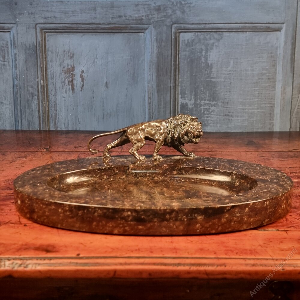 A high quality 1920's fossil stone with mounted bronze lion desk tidy of large proportions, this could also be used as a cigar ashtray. This is a stunning piece of scultpure for your desk and is in very good condition with a small chip to the right hand side commensurate with age.