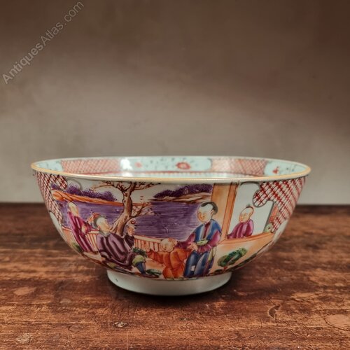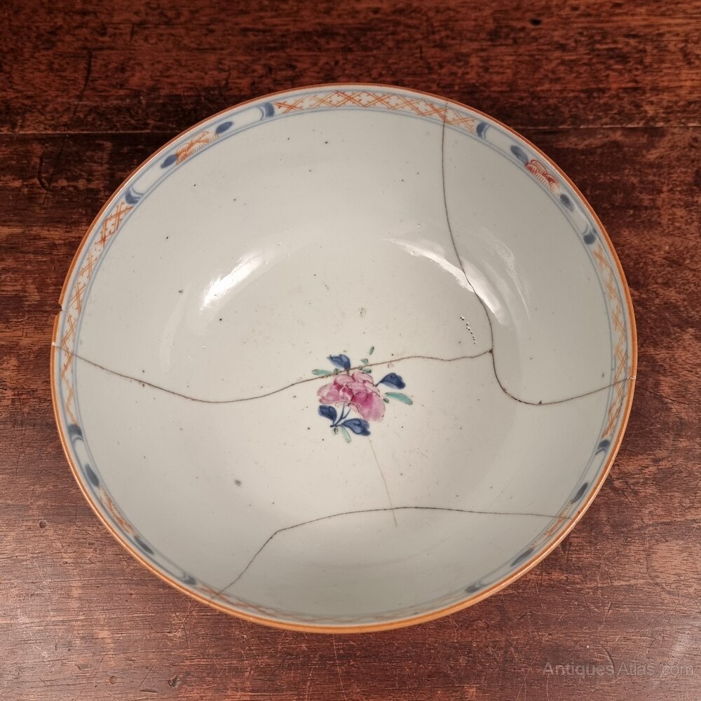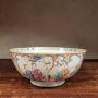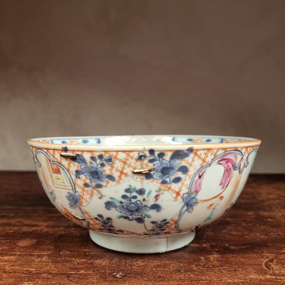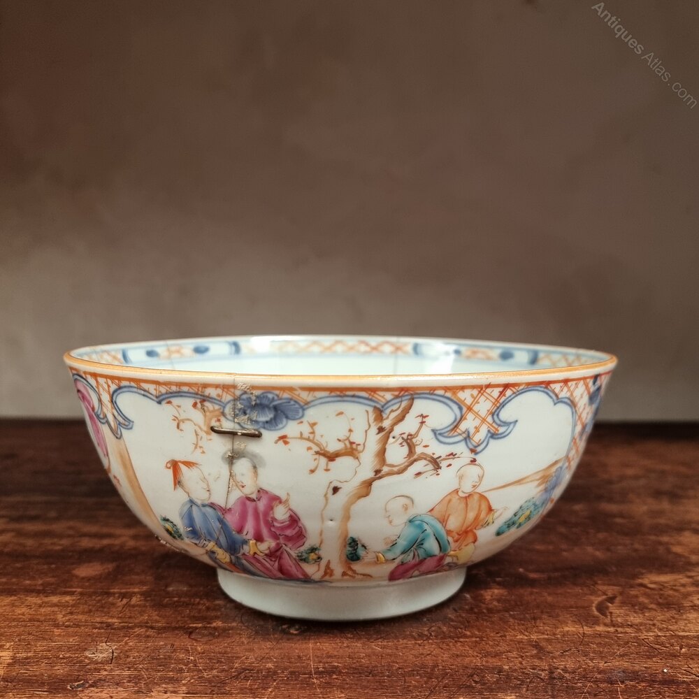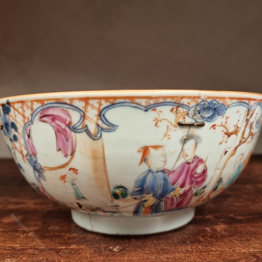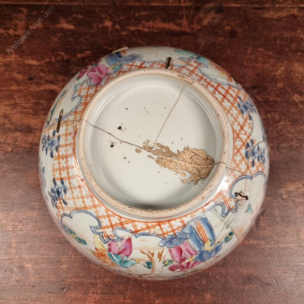 A decorative 19th century chinese bowl, finely painted with cantonese designs. The bowl has some cracks with museaum type staple repairs and a small chip to the rim.