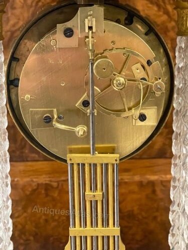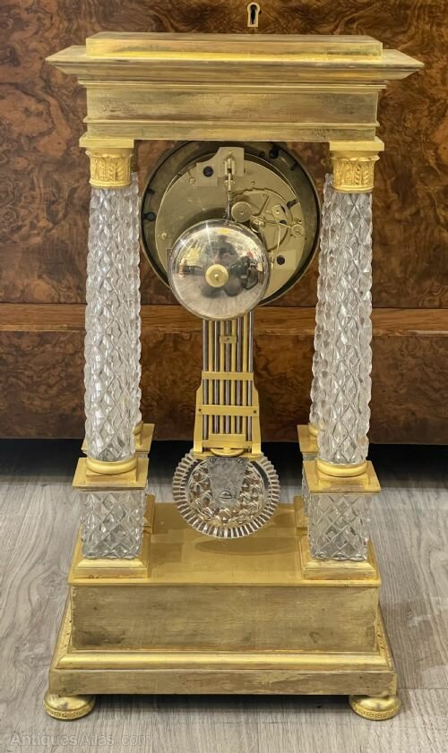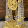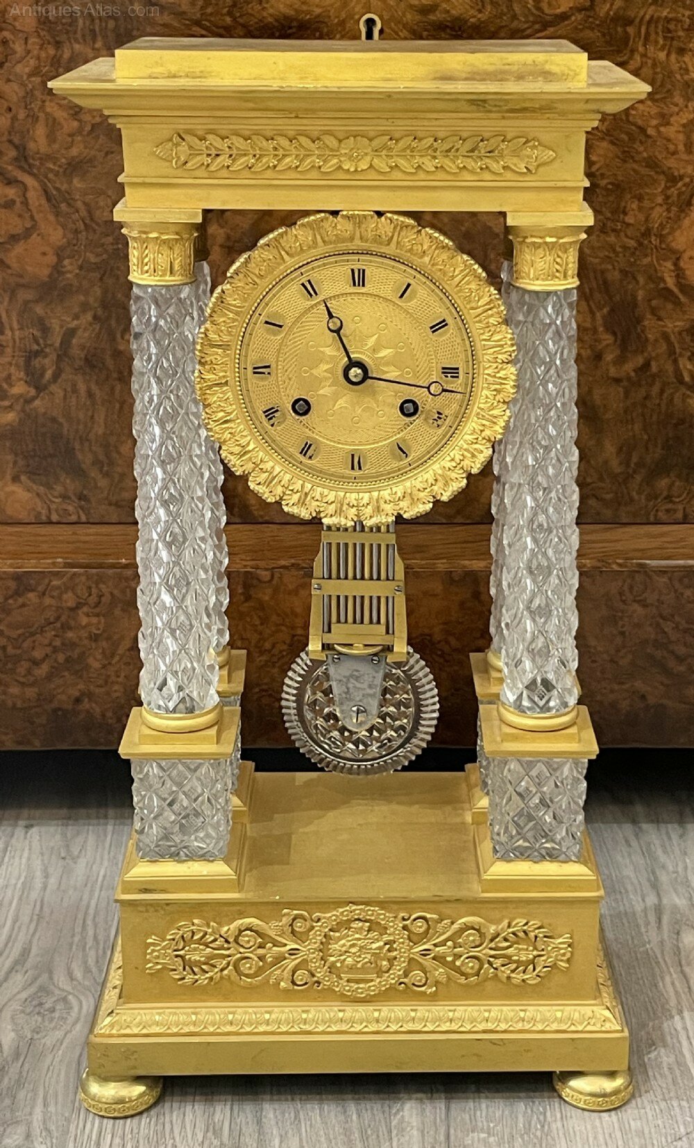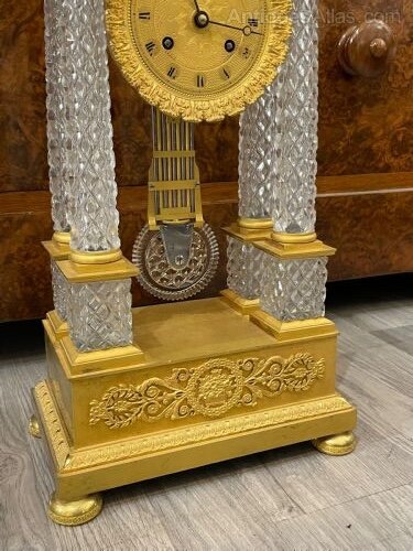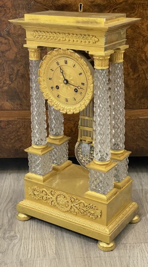 A fine Charles X ormolu and crystal portico striking eight-day mantel clock, attributed to the Escalier de Cristal workshop in Paris. Circa 1825. Temple shape incorporating four cut crystal columns with stepped top and base adorned with classical fleurons, all raised on four feet. Gilded bronze dial with ‘Breguet hands’ within an acanthus leaf bezel. The eight day French movement with original pendulum, striking on the bell on the hour and half hour. In beautiful condition throughout, the movement having been professionally overhauled and serviced.