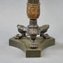A fine pair of Regency period bronze and ormolu oil lamps converted into table lamps, with reeded stem, with ormolu acanthus leaf collar and raised on lion paw feet standing on concave bases. The lamps are in very good condition and have a patina. 700mm high including the shades and 200mm diameter at the base. English. Circa 1820.
