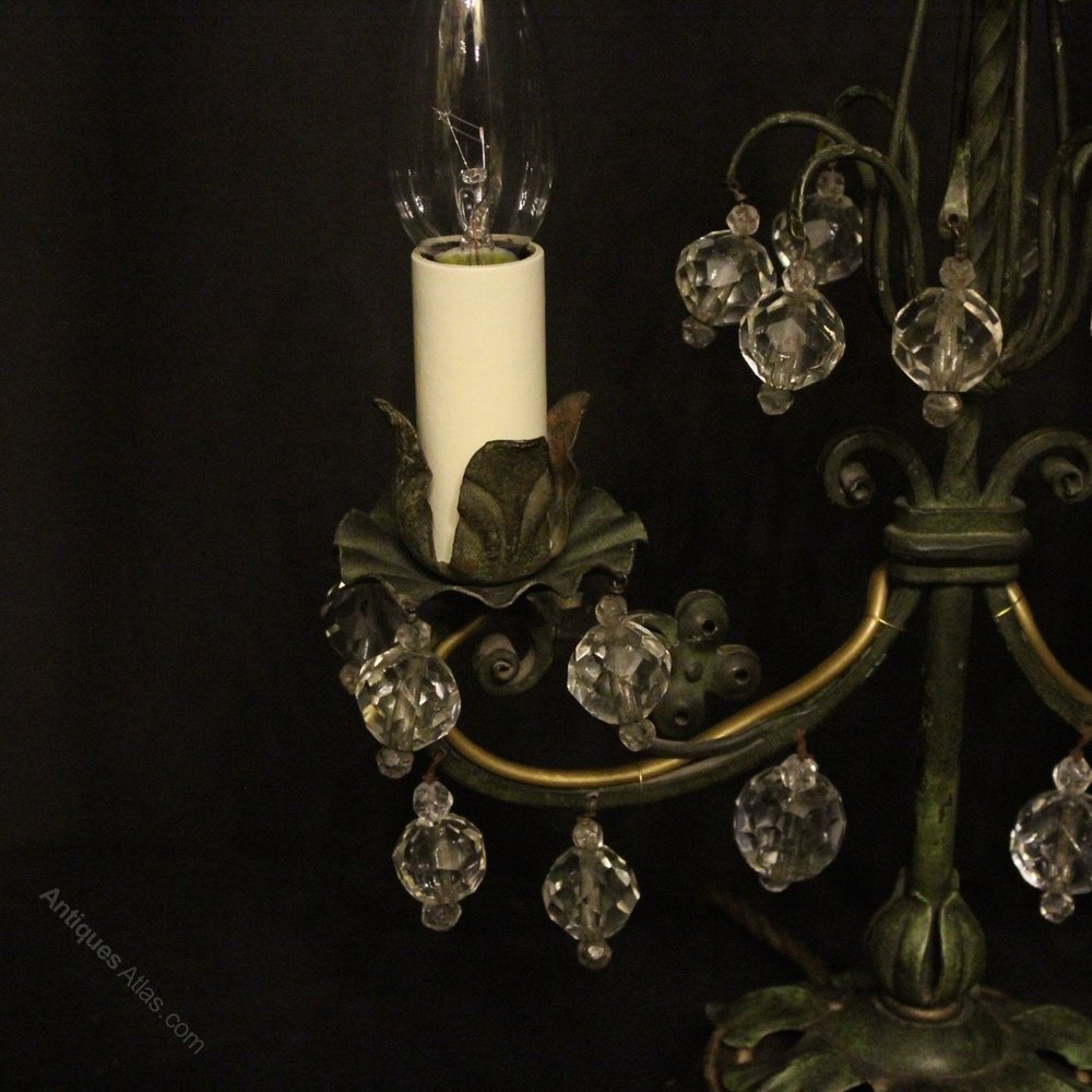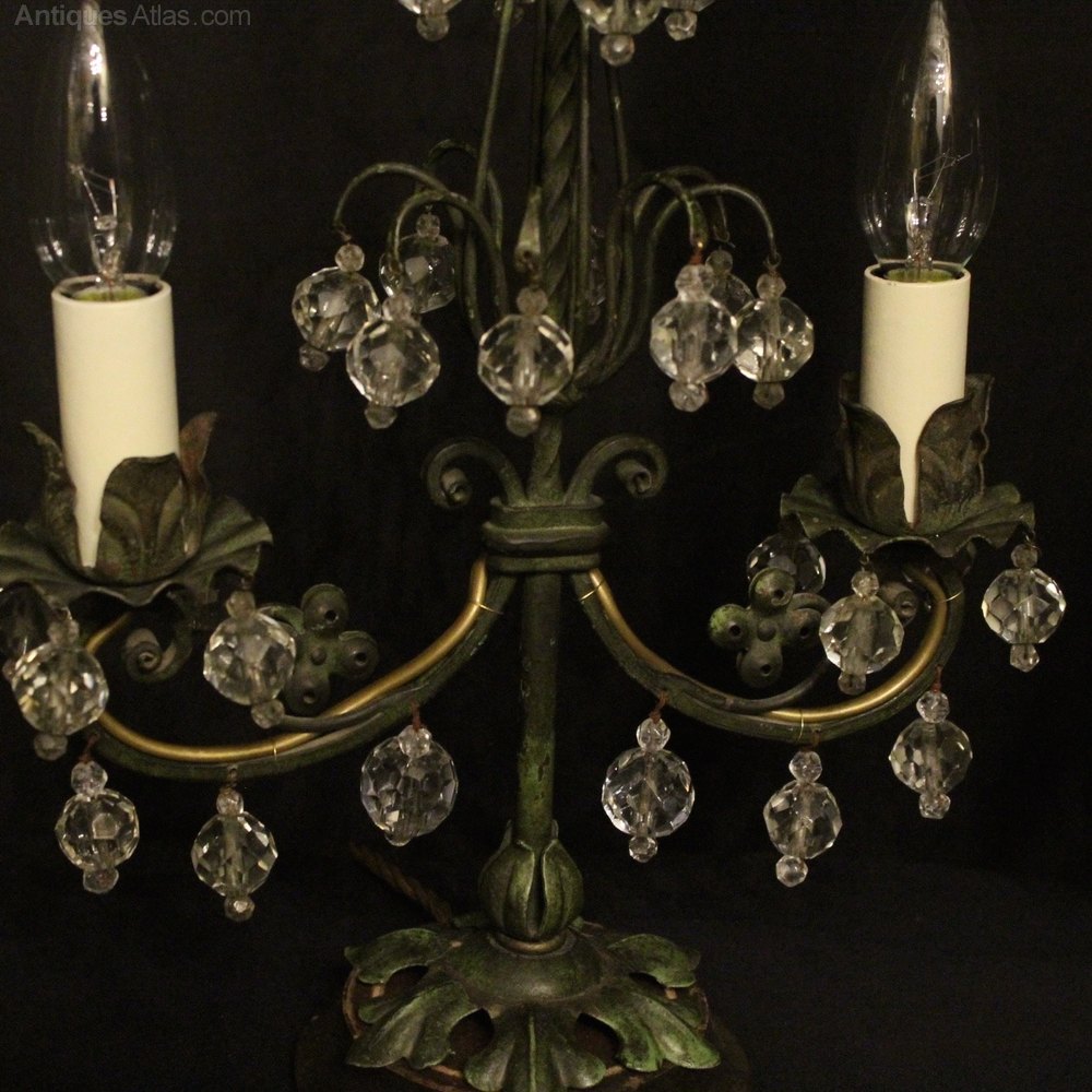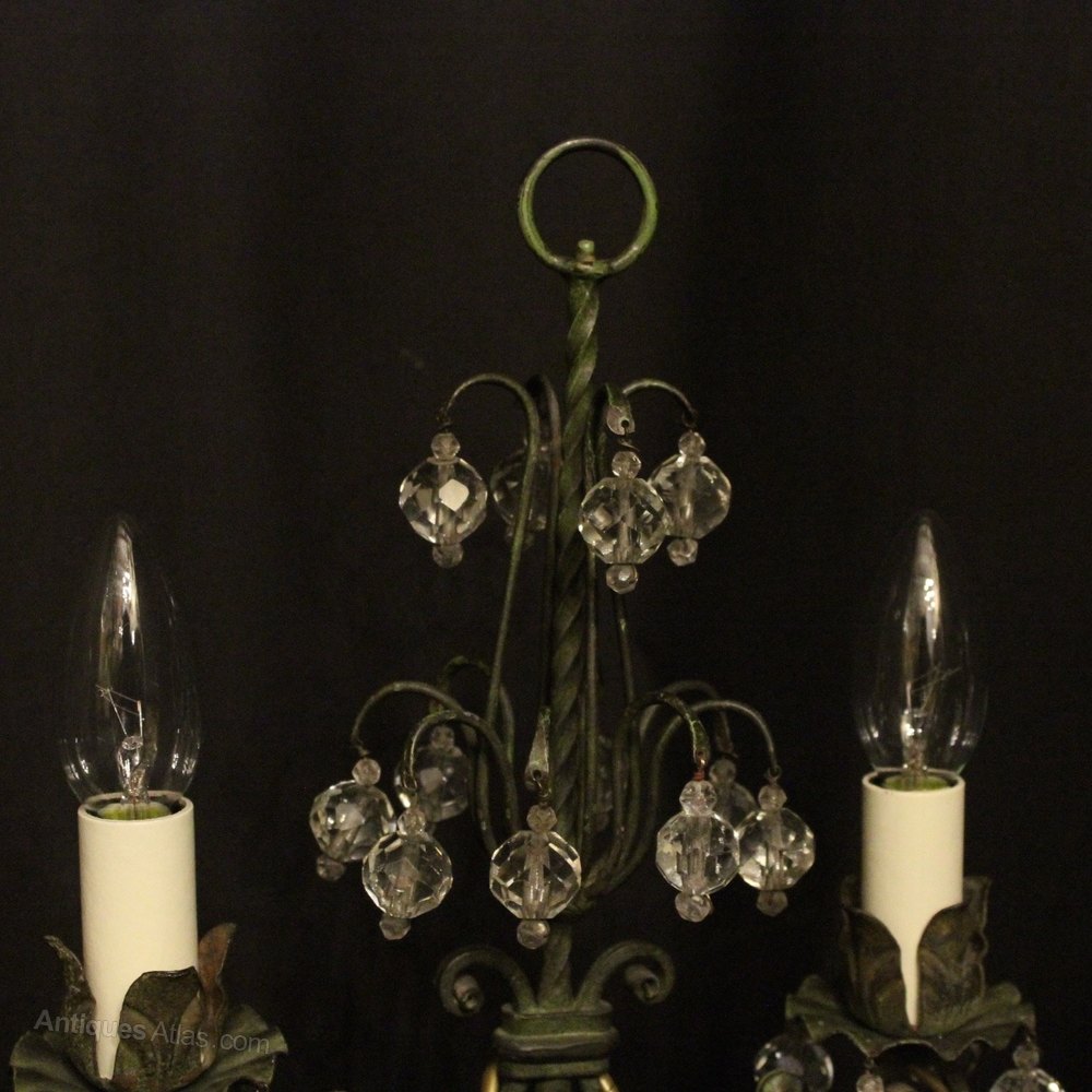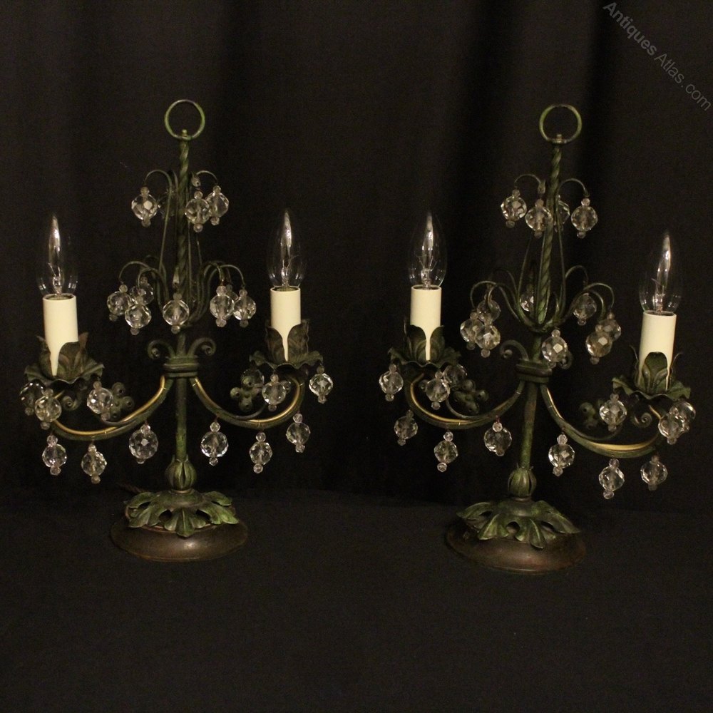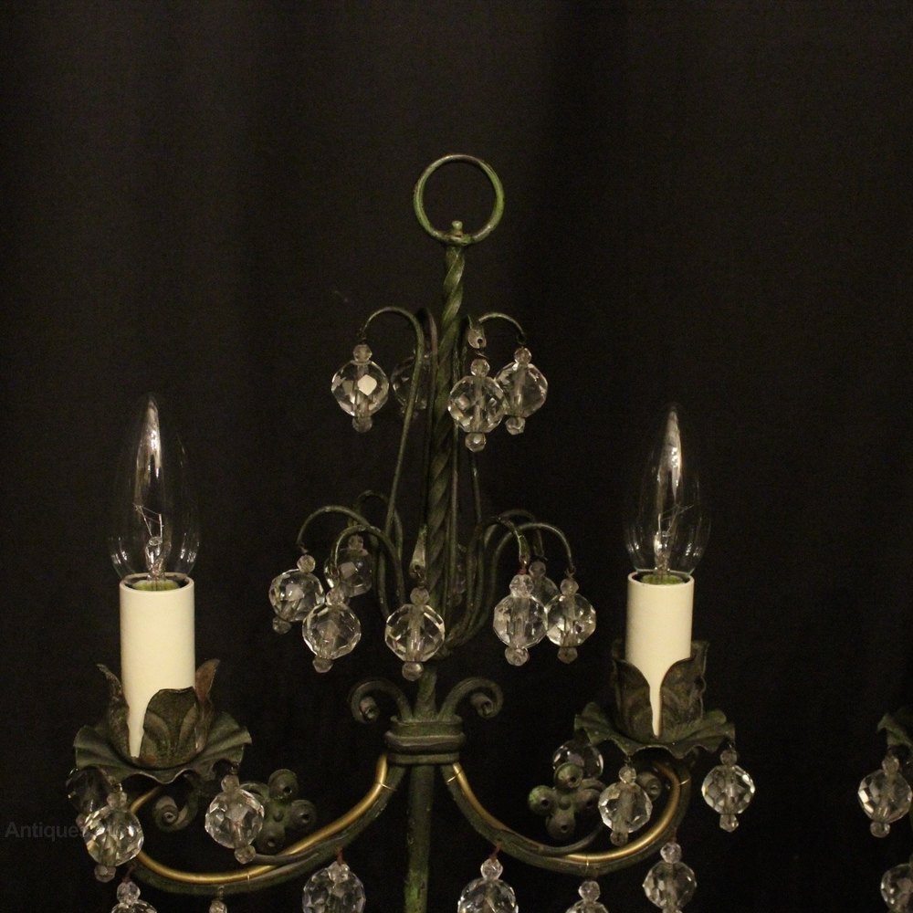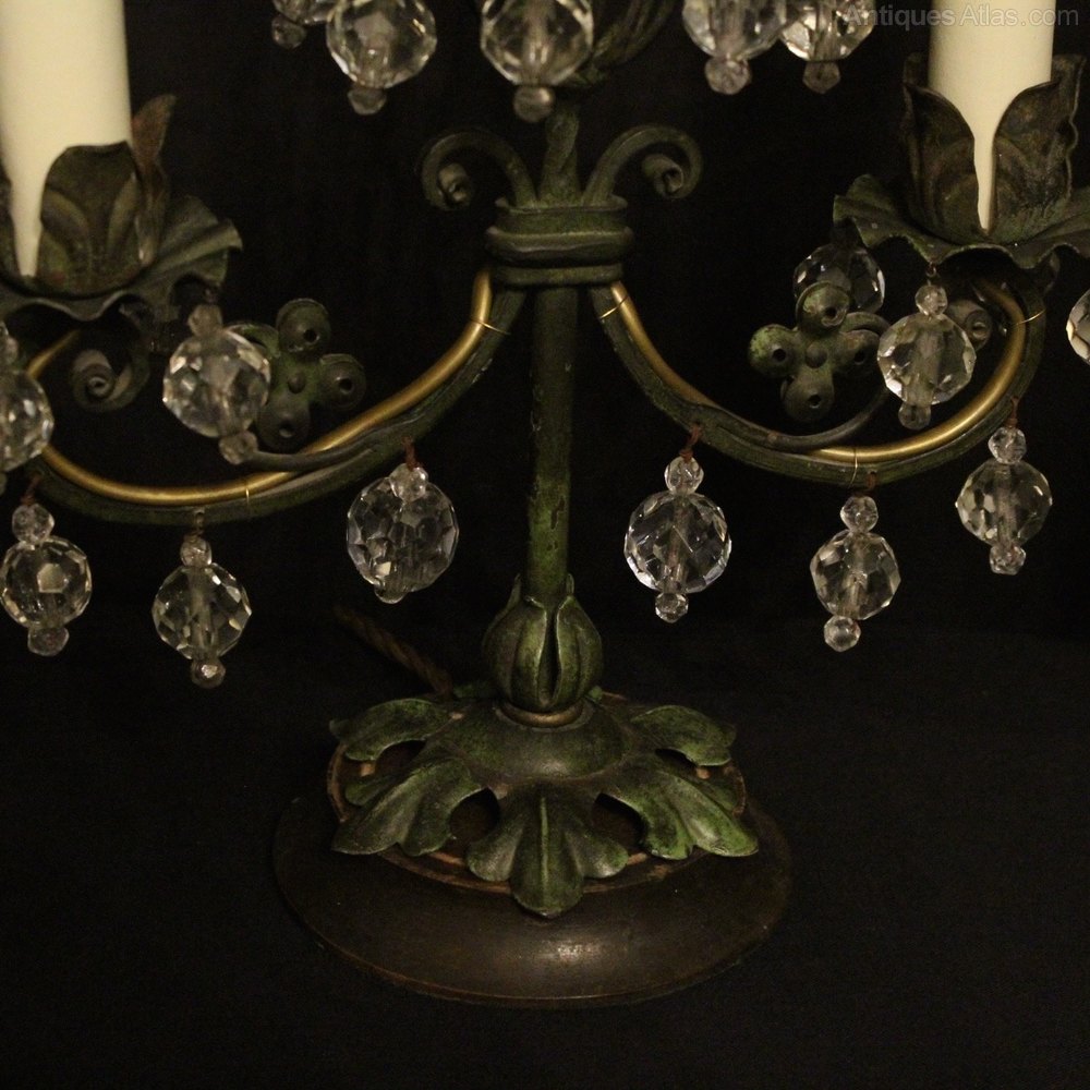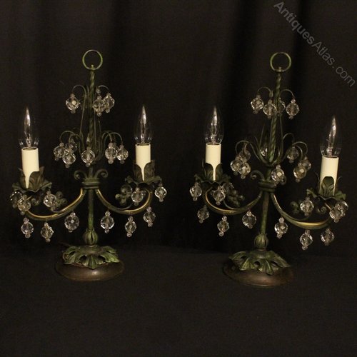 A French pair of green toleware twin arm table lamps, the scrolling arms with sectional bobeche drip pans and leaf candle sconces issuing from a twisted central column and decorated overall with ball faceted cut glass crystals and set on a floral wooden base, lovely patination and nice scale. Fully rewired and PAT tested.