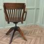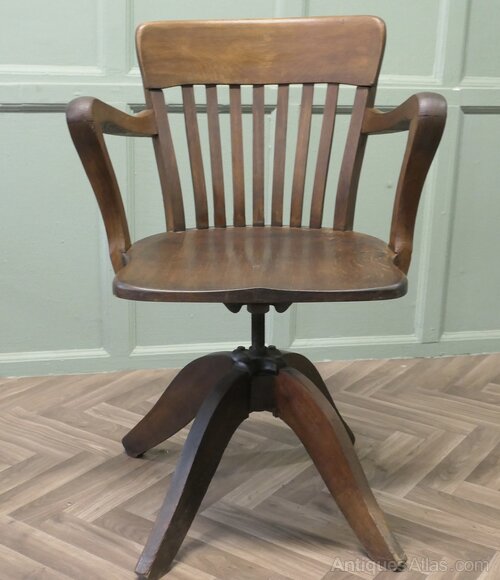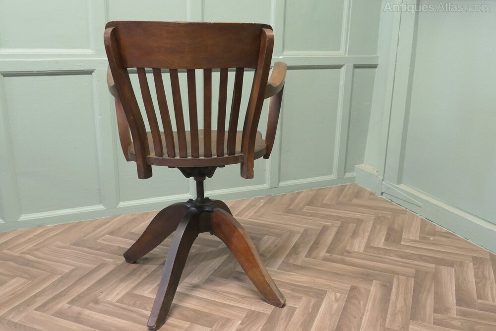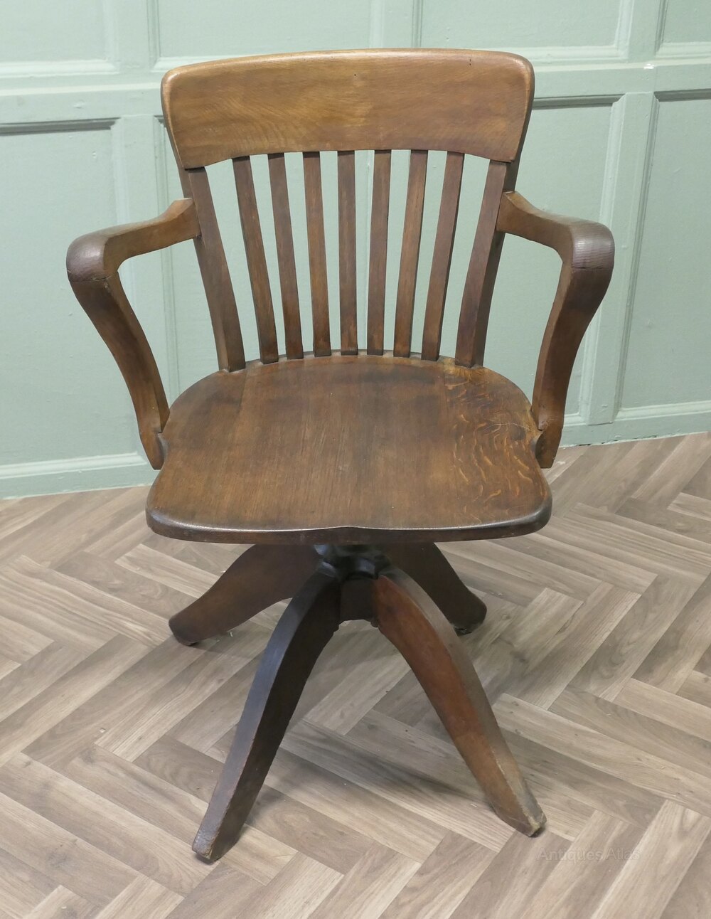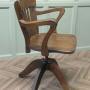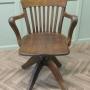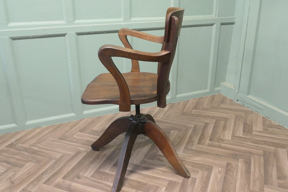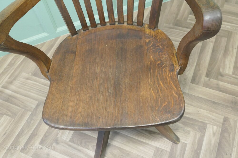 The Chair has an attractive deep curving back top rail with slats and arching Shepherds Crook Arm Rests. The Chair has a sculptured seat and revolves, also the height can be adjusted from 17” to 19.5”
