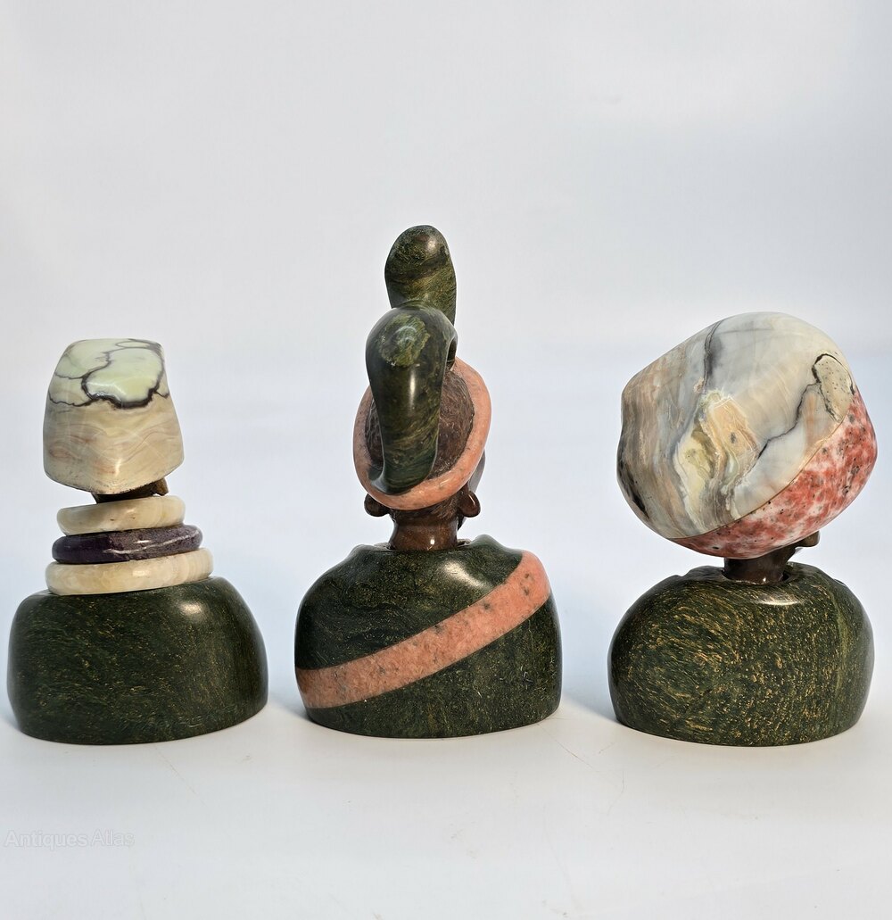 These highly decorative figures are constructed from several different sections of brightly coloured verdite or soapstone, which is native to parts of Africa. It is a relatively soft stone which can be cut and carved.