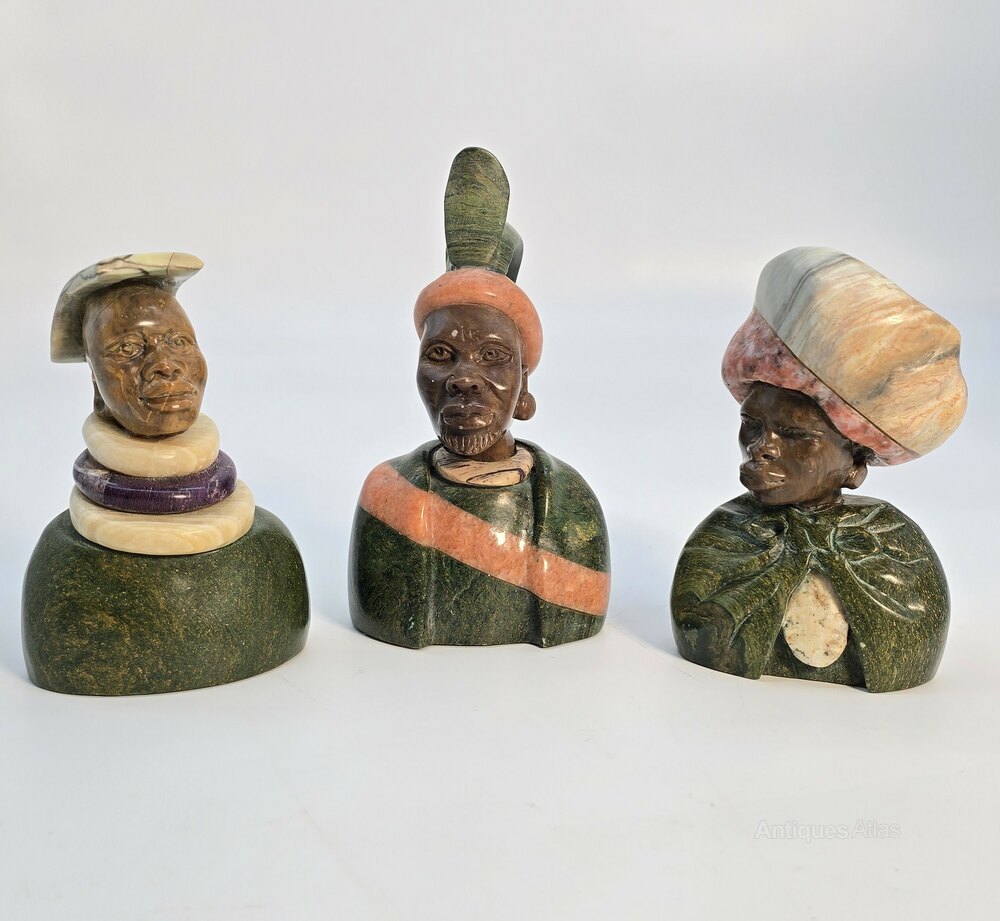 These very high quality well carved African tribal stone portrait busts depict a Zulu chief and two high ranking Zulu tribe’s people.