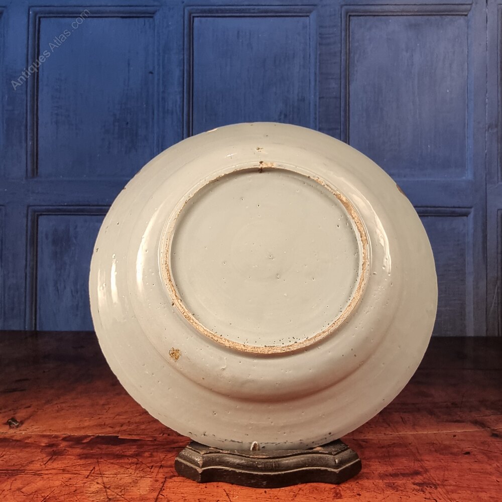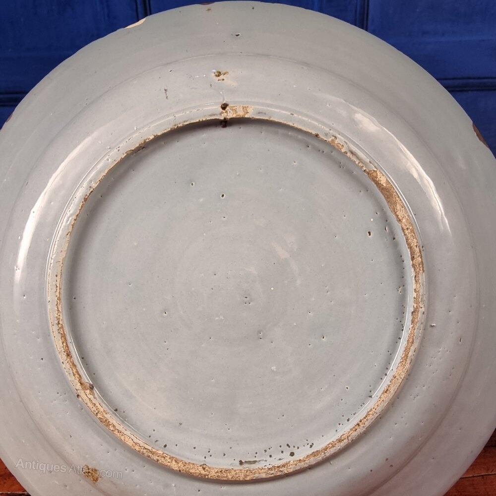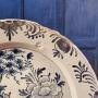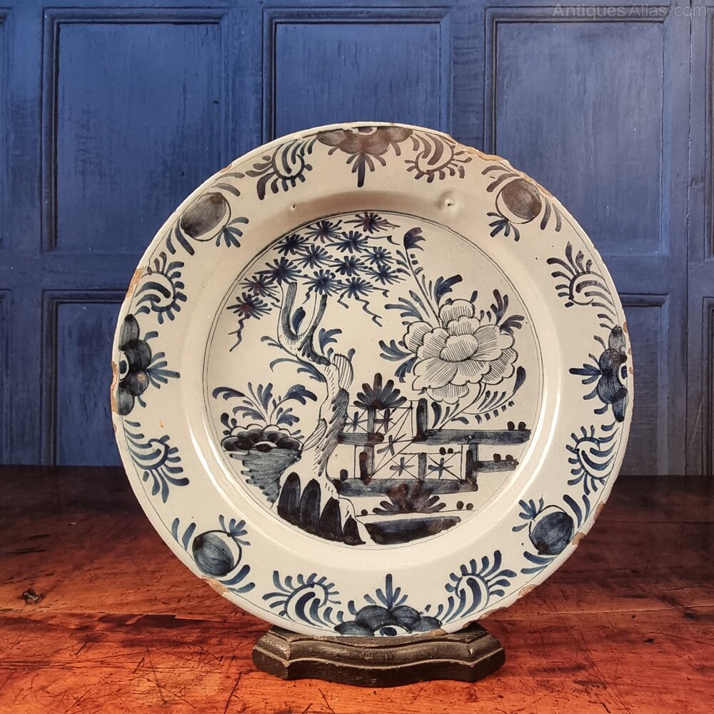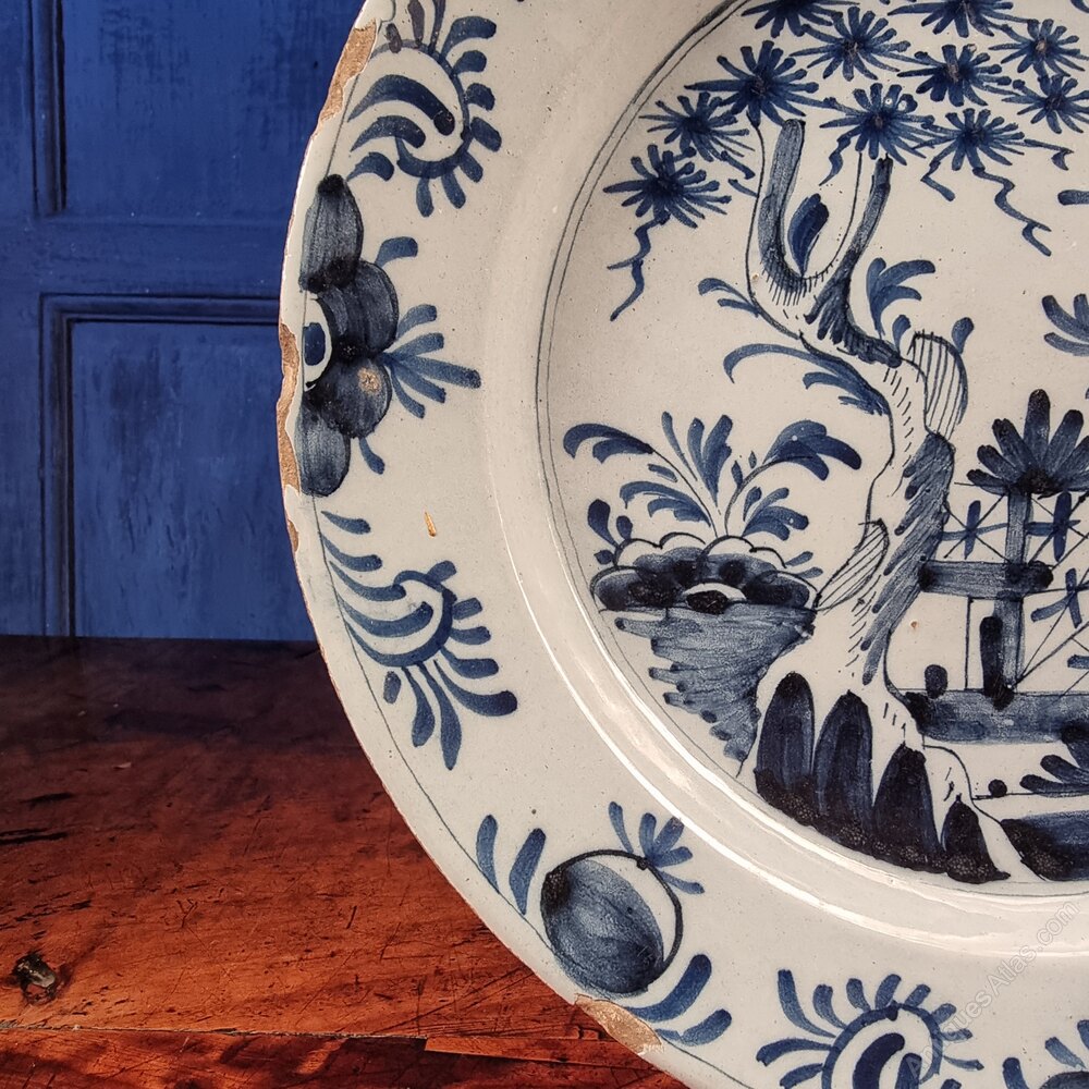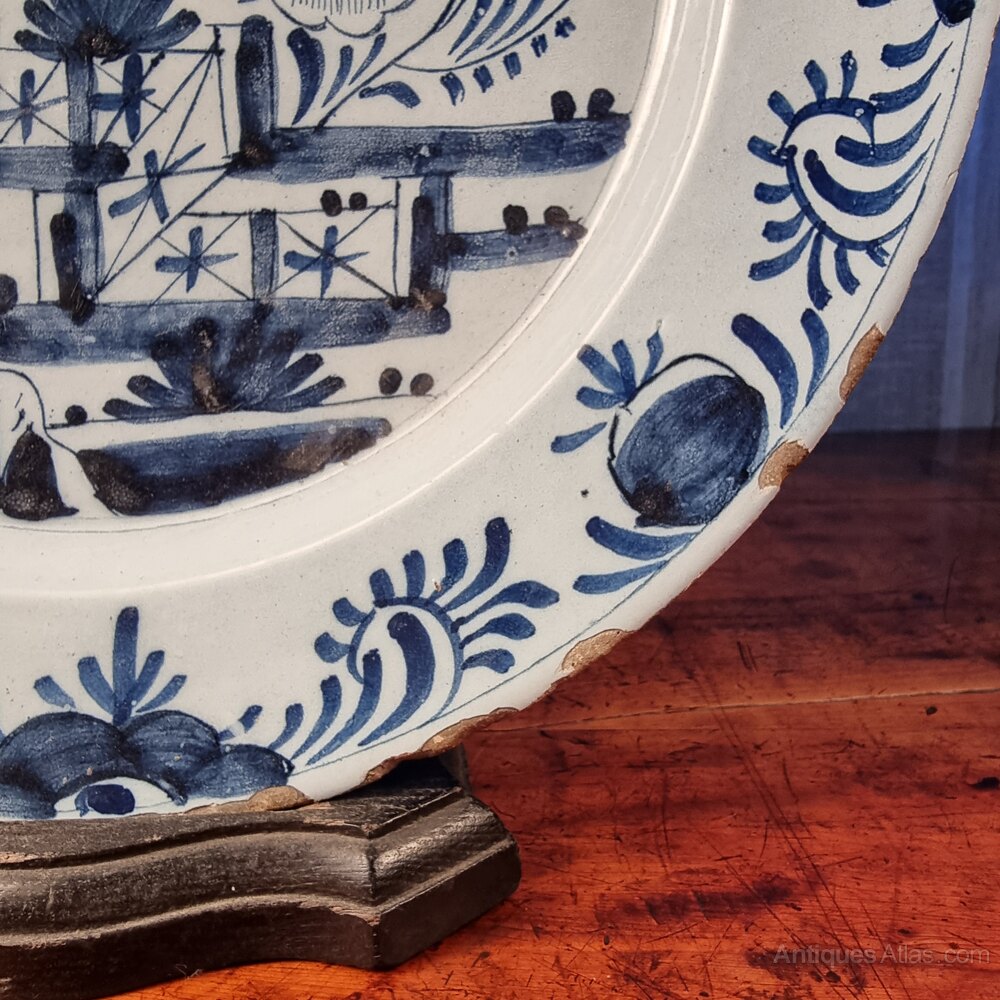 A large 18th century blue and white delft charger decorated with an oriental influenced design.