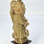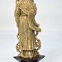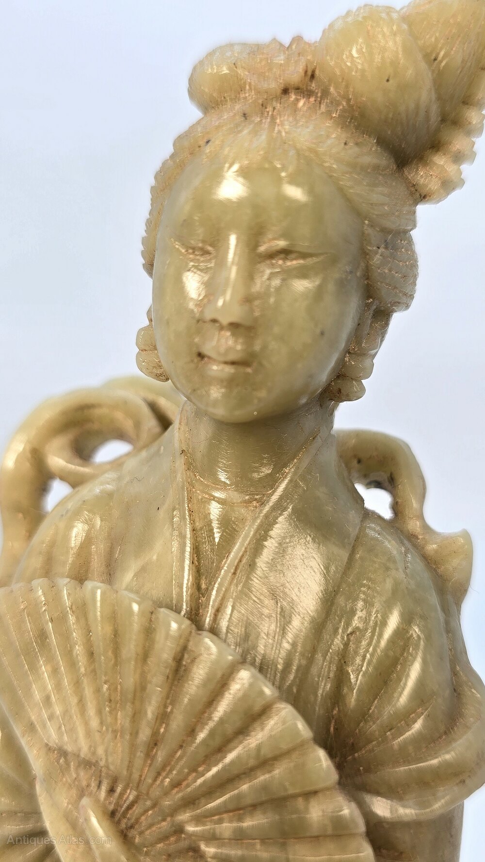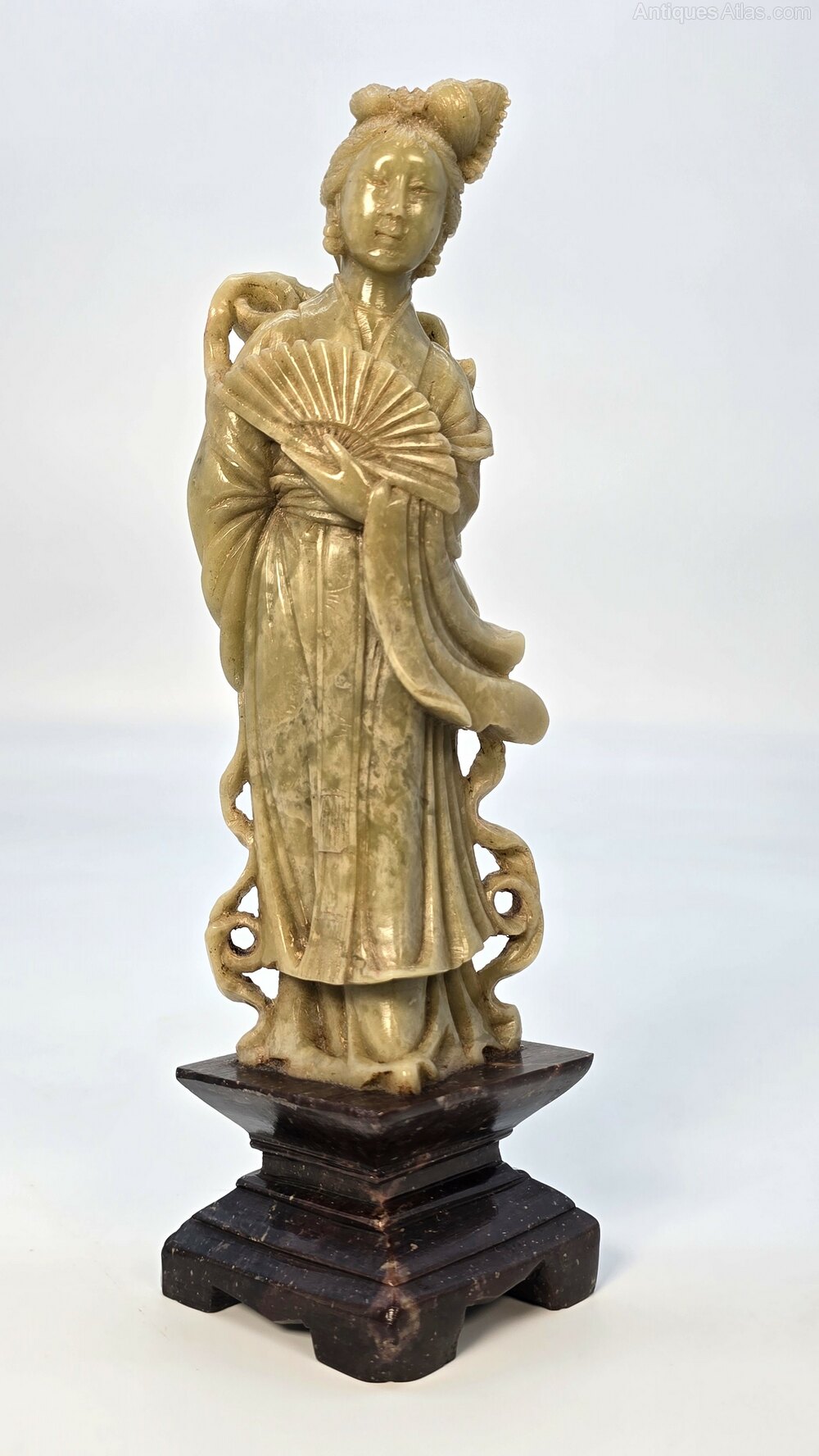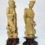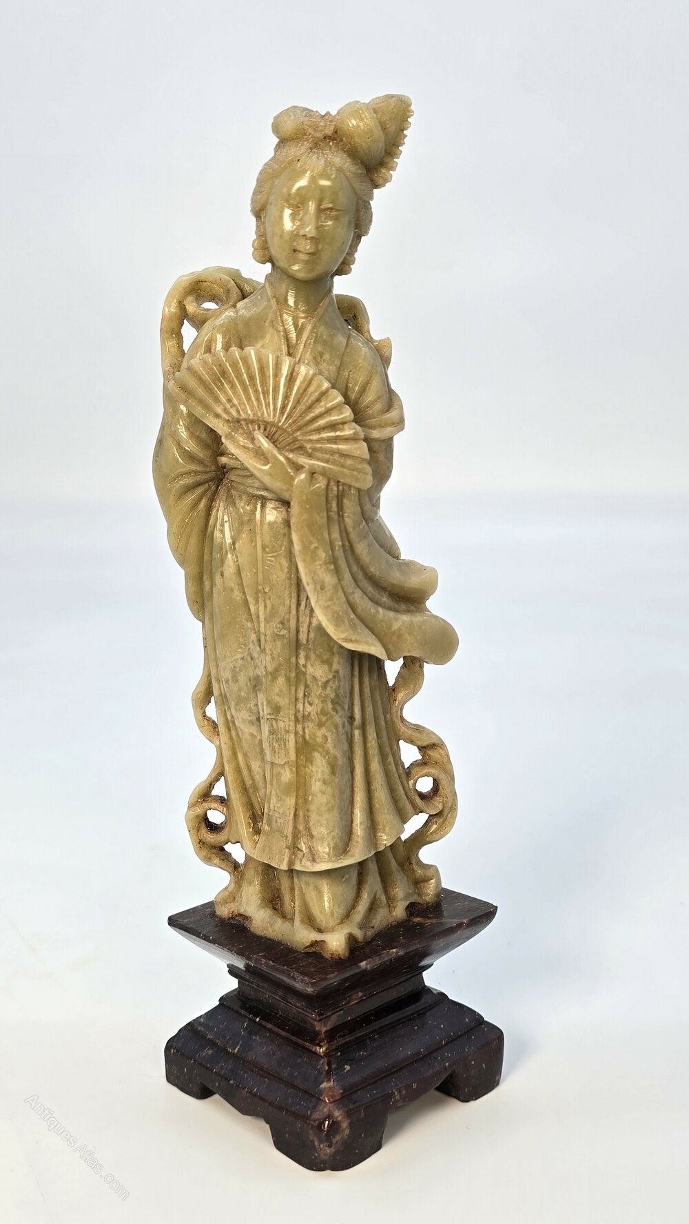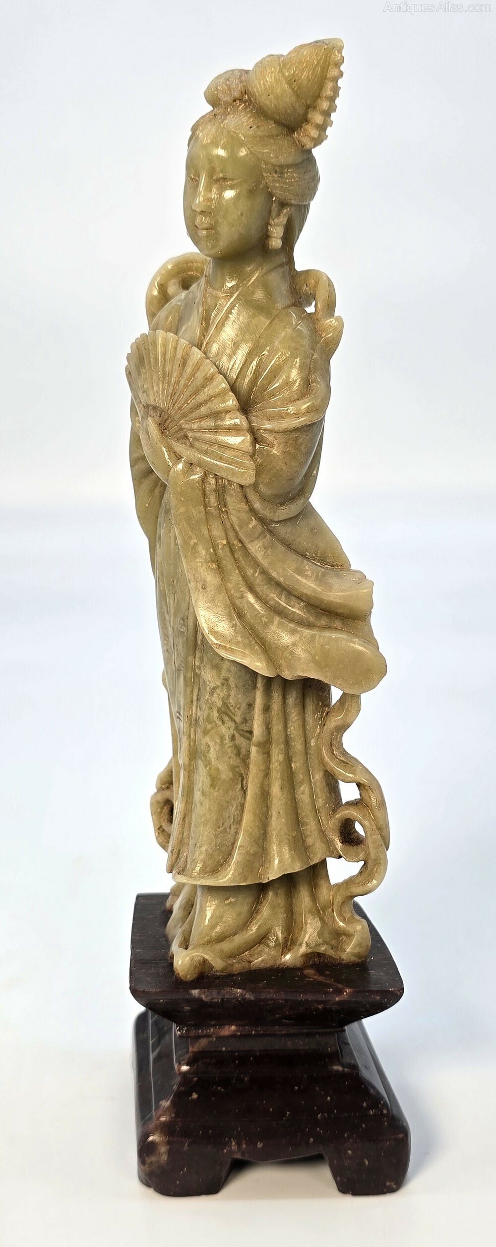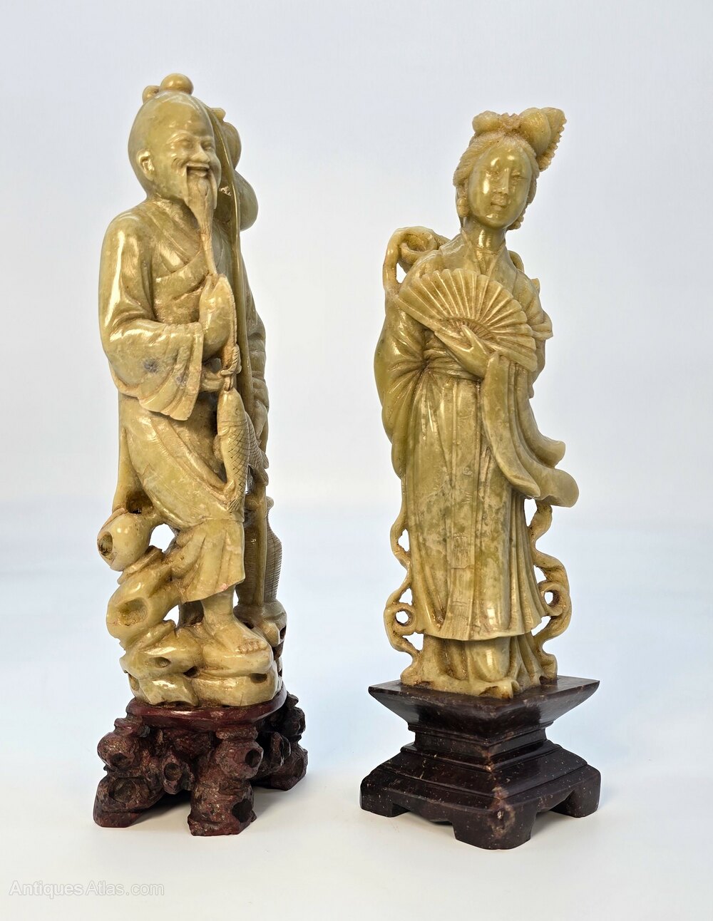 Both figures are of a similar size and proportion and are each carved from the same pale green jade coloured soapstone, mounted onto carved dark russet soapstone bases, each of a different design.
