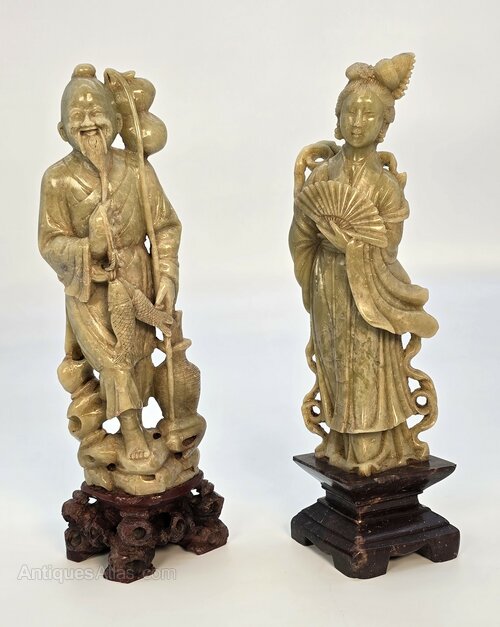 This decorative pair of soapstone carvings depicts traditionally dressed figures of a man and woman. The woman is dressed in ornate robes, and she is holding a fan. The man is a fisherman, dressed in simple robes, and he is carrying his catch of fish.