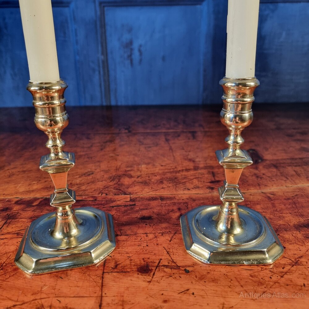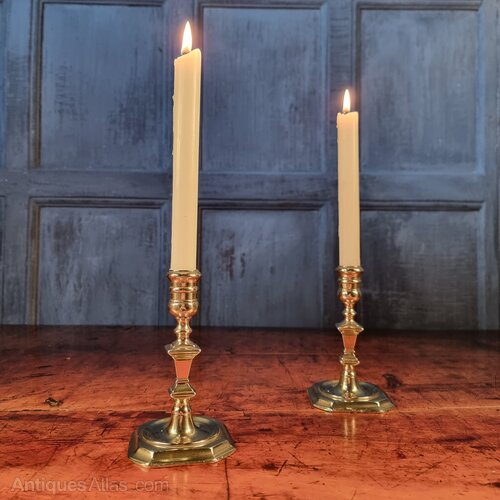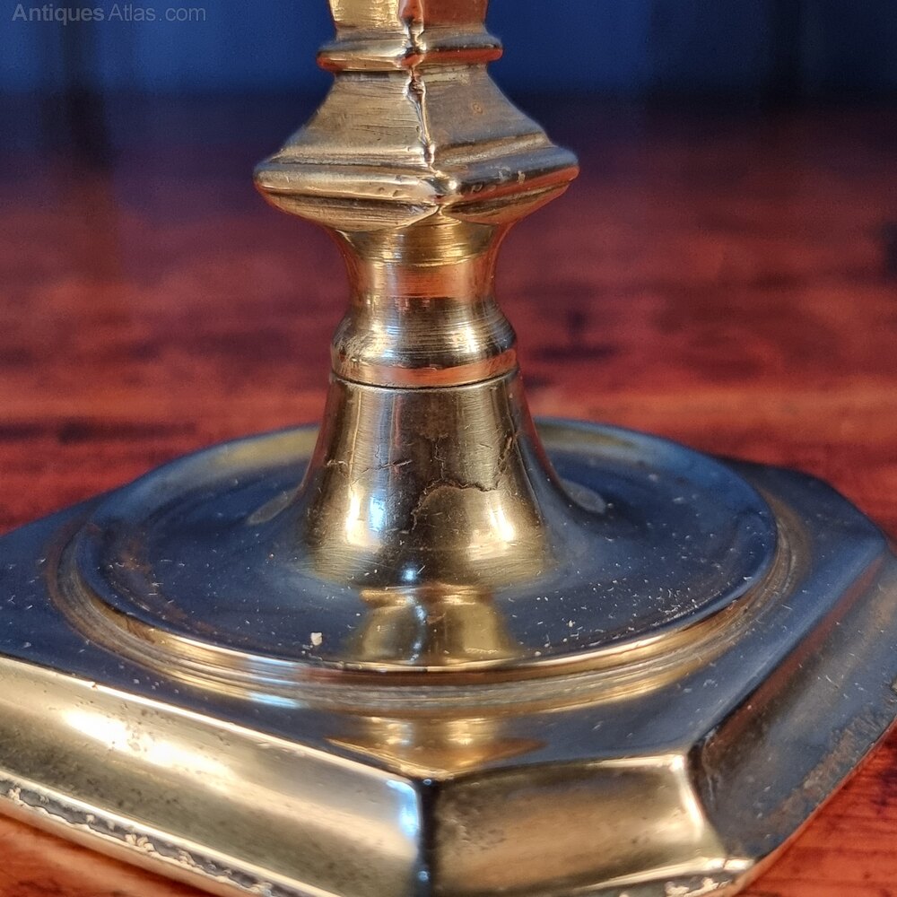 A pair of 18th century brass candlesticks having octagonal bases and turned sockets. Both candlesticks are in good solid condition with some age related marks commensurate with age.