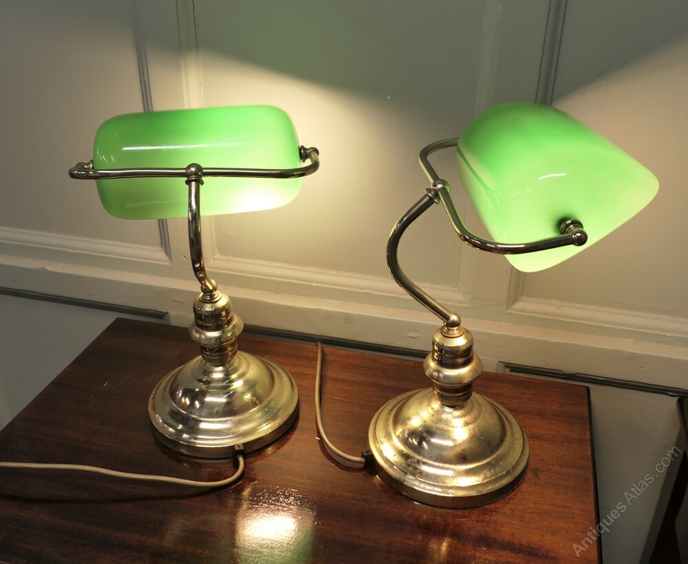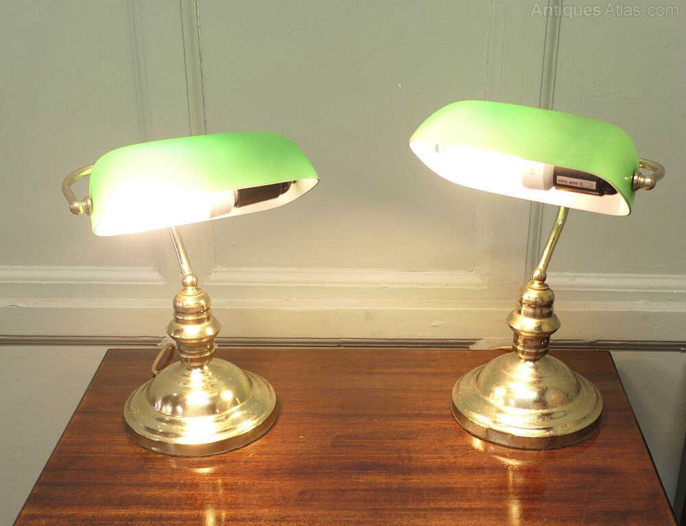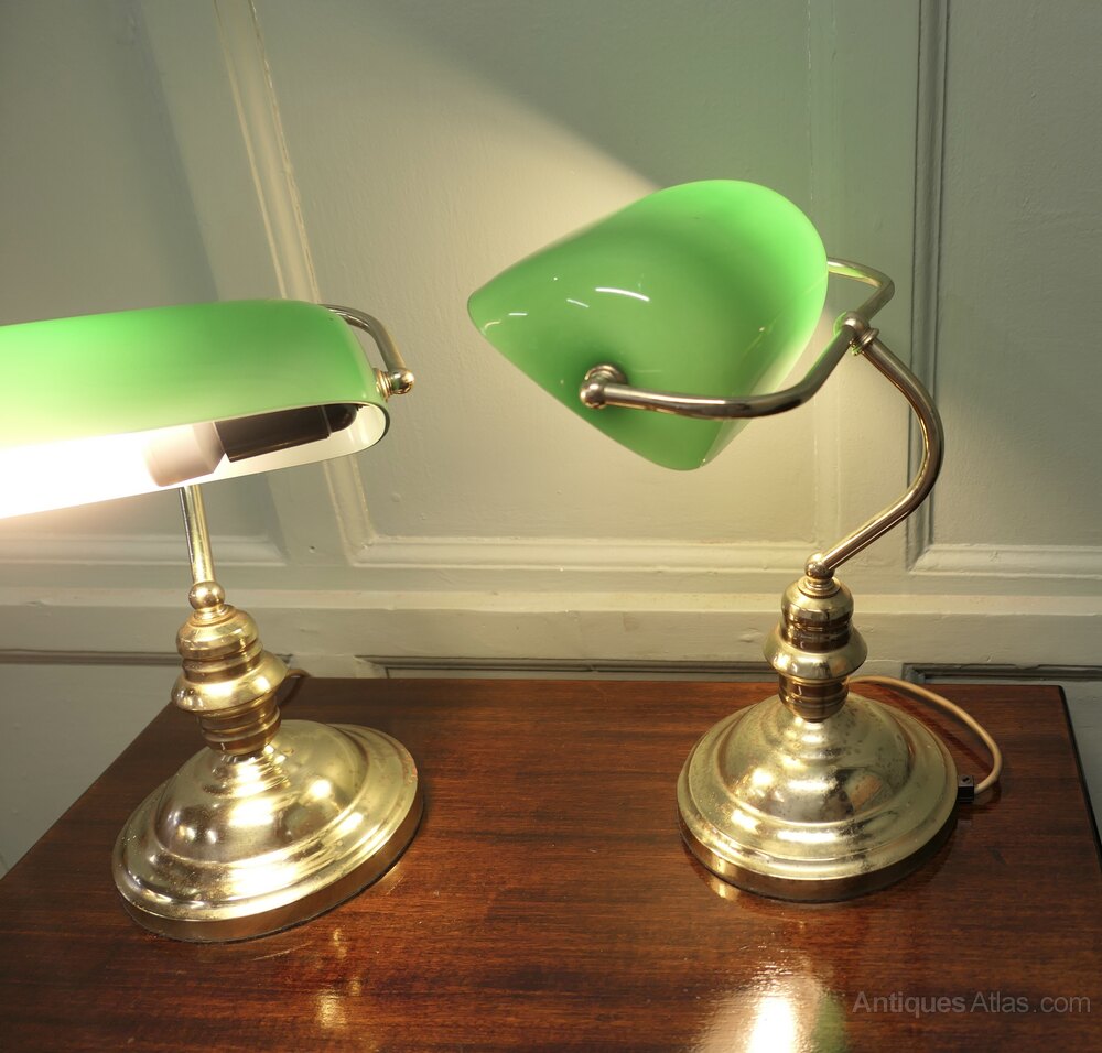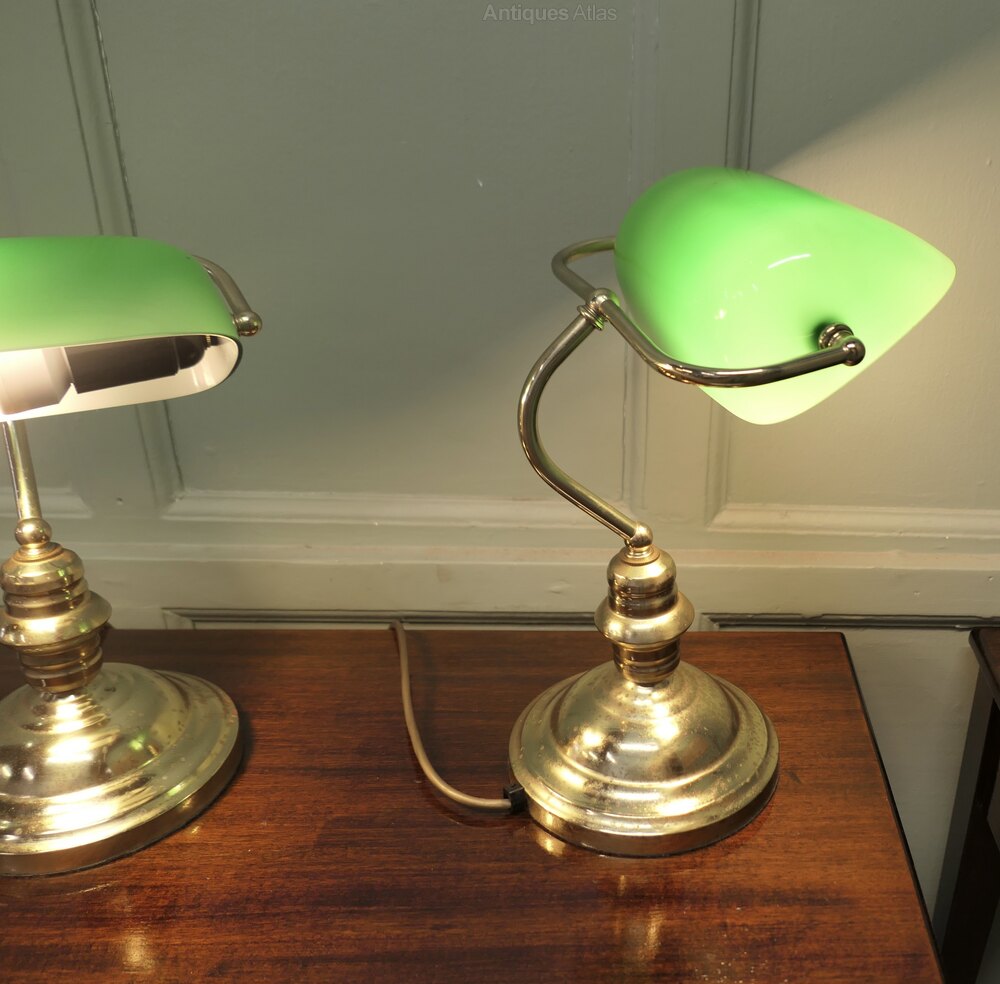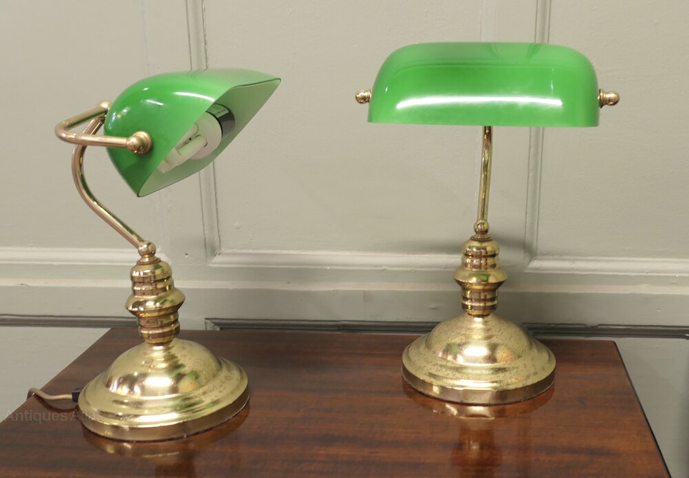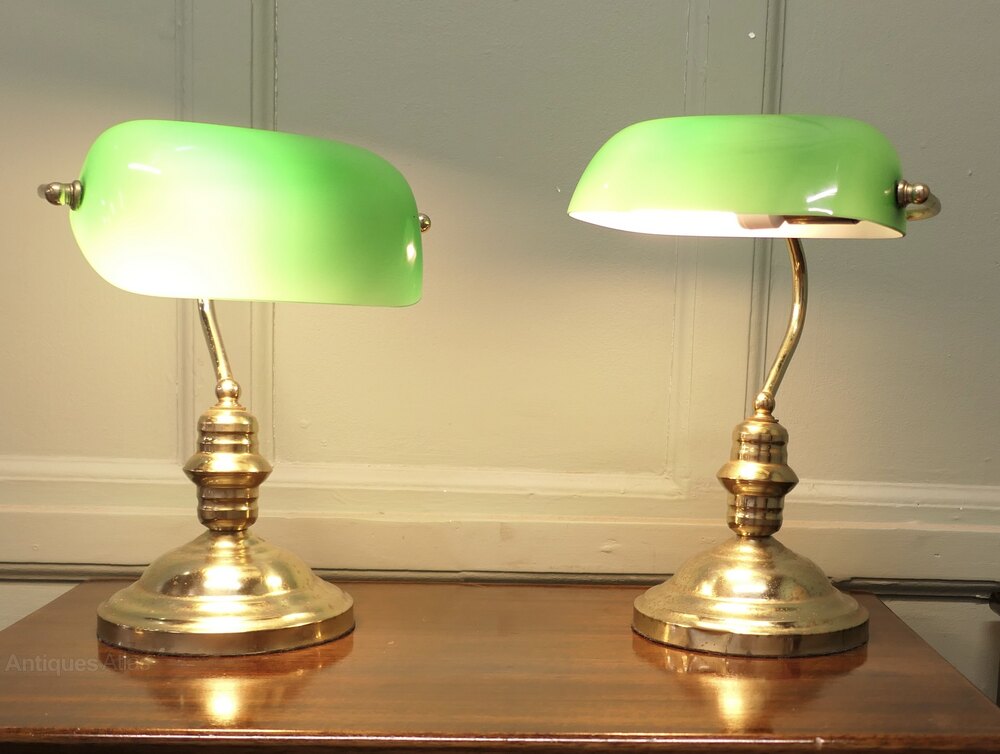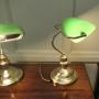 A beautiful pair of barrister’s brass desk lamps, with original green glass lampshades which have a white reflective underside