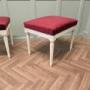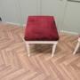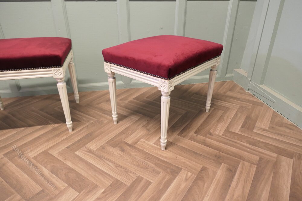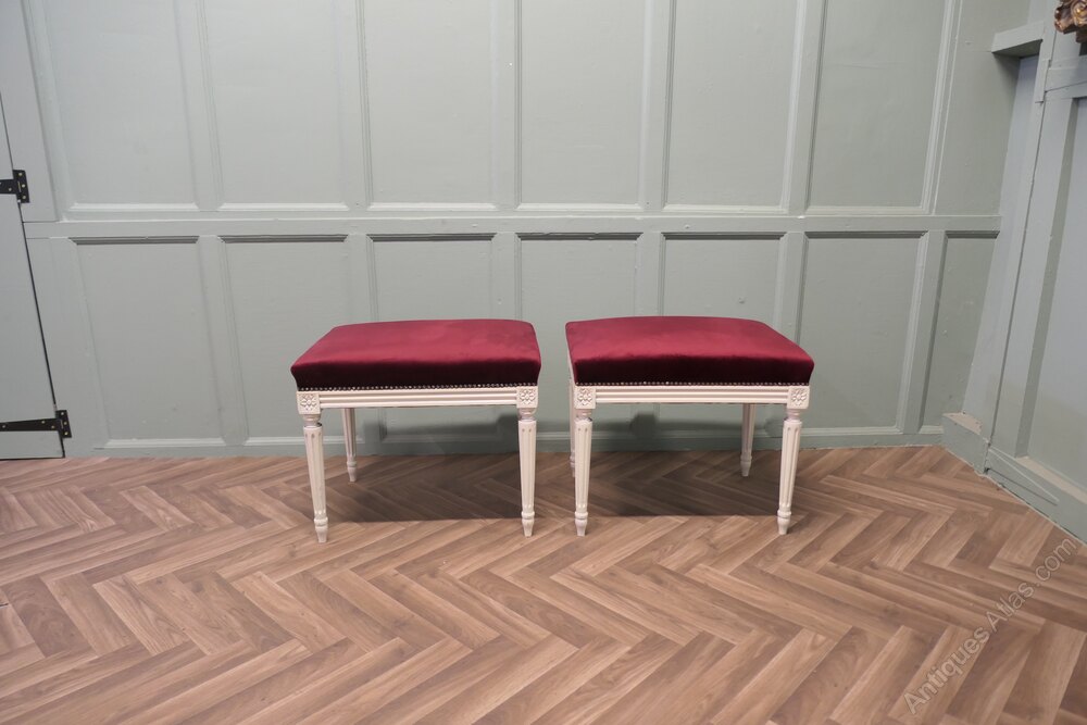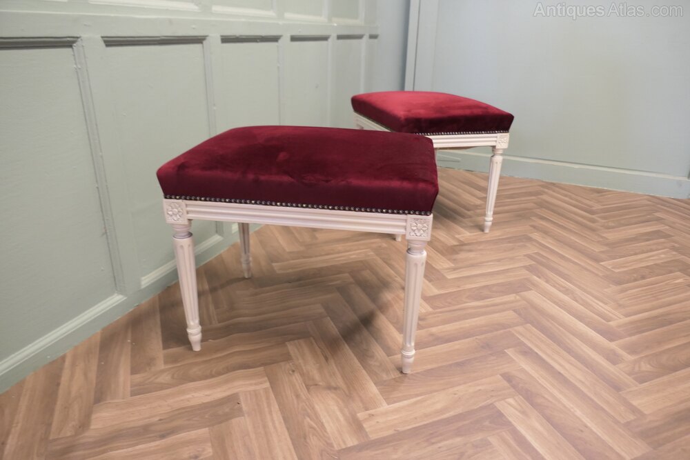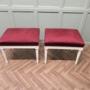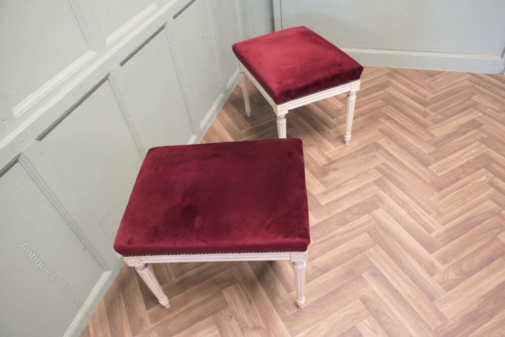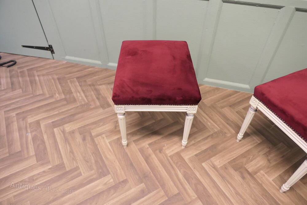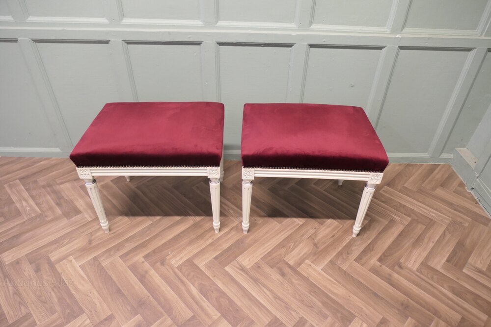 A Lovely pair, these very attractive Victorian stools stand on elegant fluted white legs with matching carving to the apron The stools have been upholstered in rich deep red velvet
