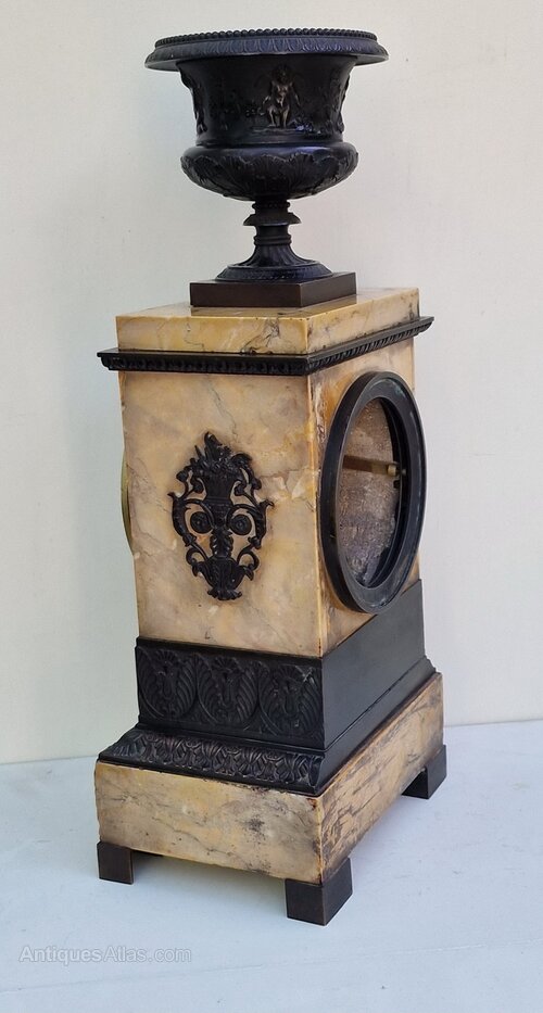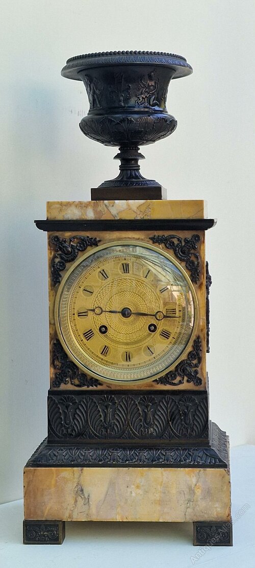 An early 19th century French Empire period mantle clock. A Sienna marble case with lovely grain. Bronze raised panels and corner spandrels around the dial. A finely detailed bronze urn set to the top. A gilt engine turned dial with circles around the Roman numerals. Blued steel "moon" hands. An 8-day duration silk suspension mechanism striking the half hours and hours on a bell. Circa. 1815.