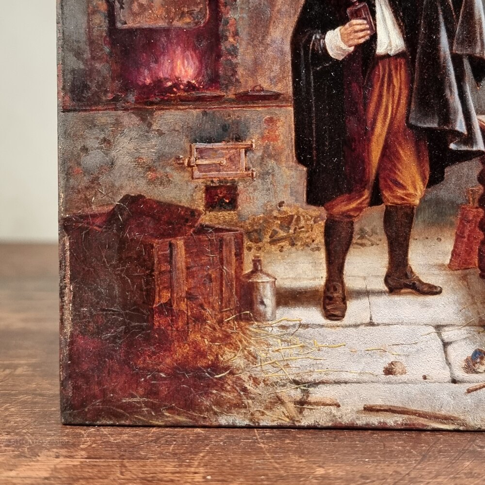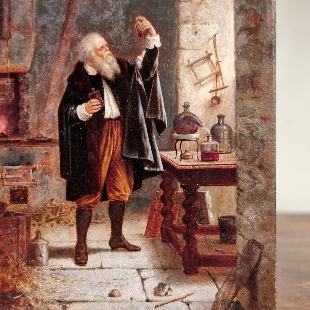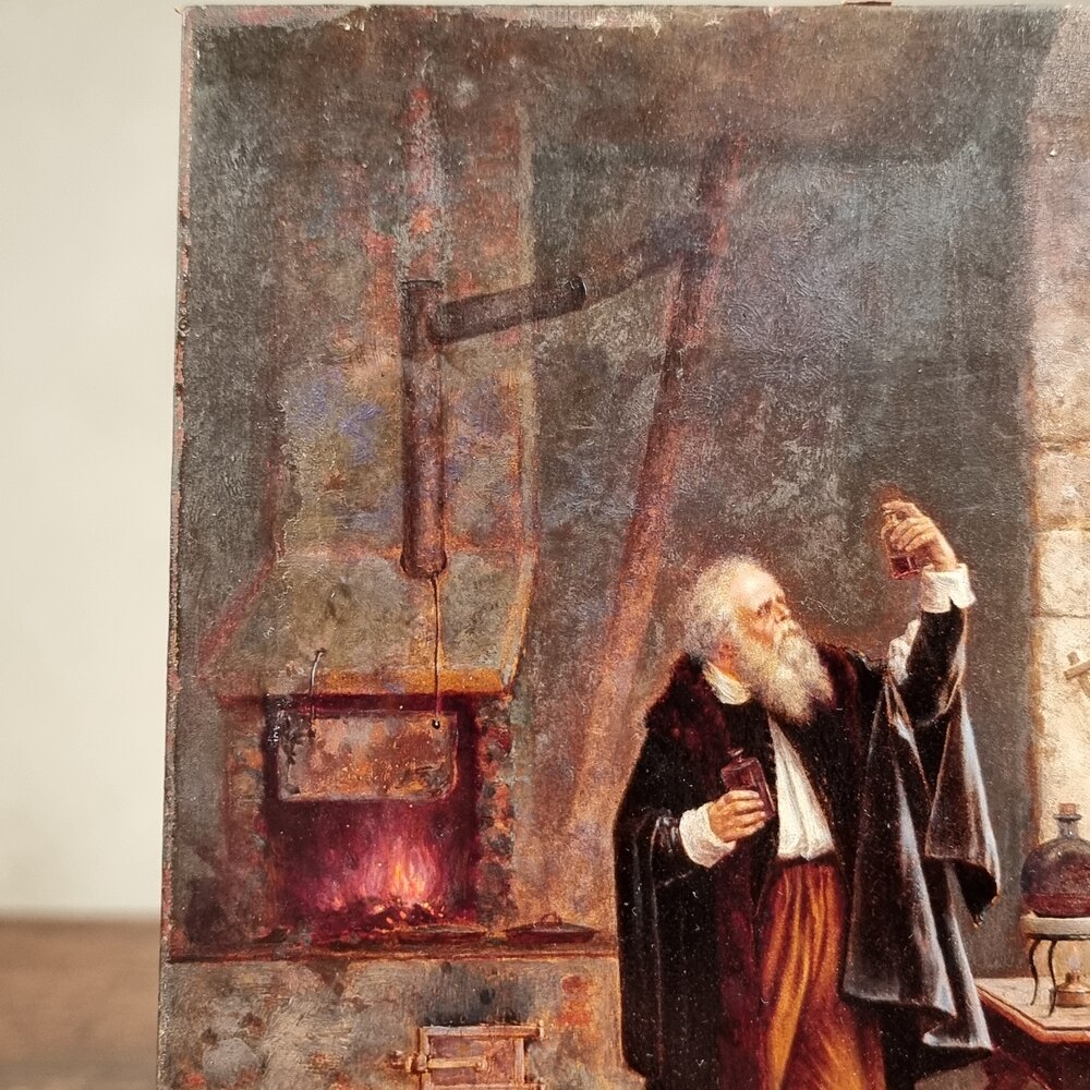 A super quality small 18th century oil on panel depicting the alchemist working away with his experiments and scientific instruments upon a table with sugar twist legs, and if you look carefully the artists signature is on the stretcher of the table but it is difficult to make out what the signature says.